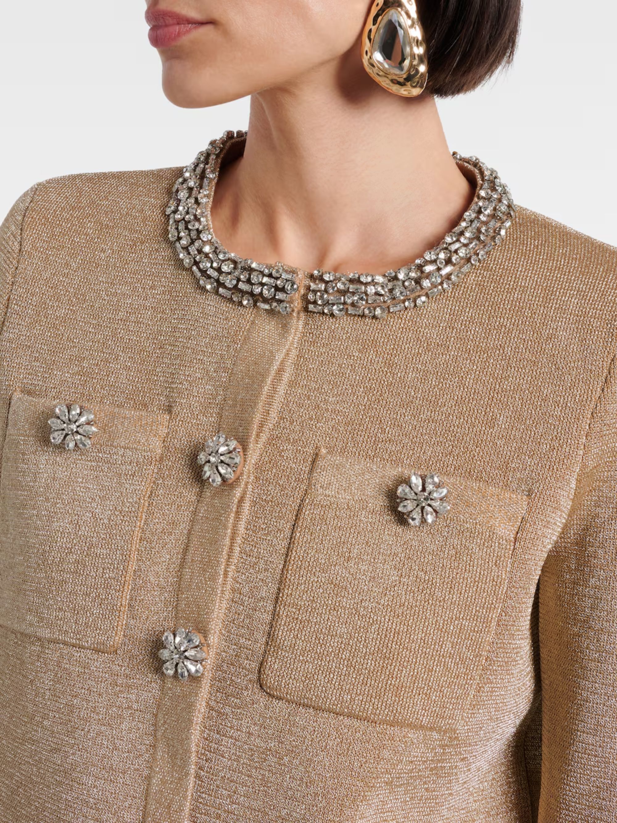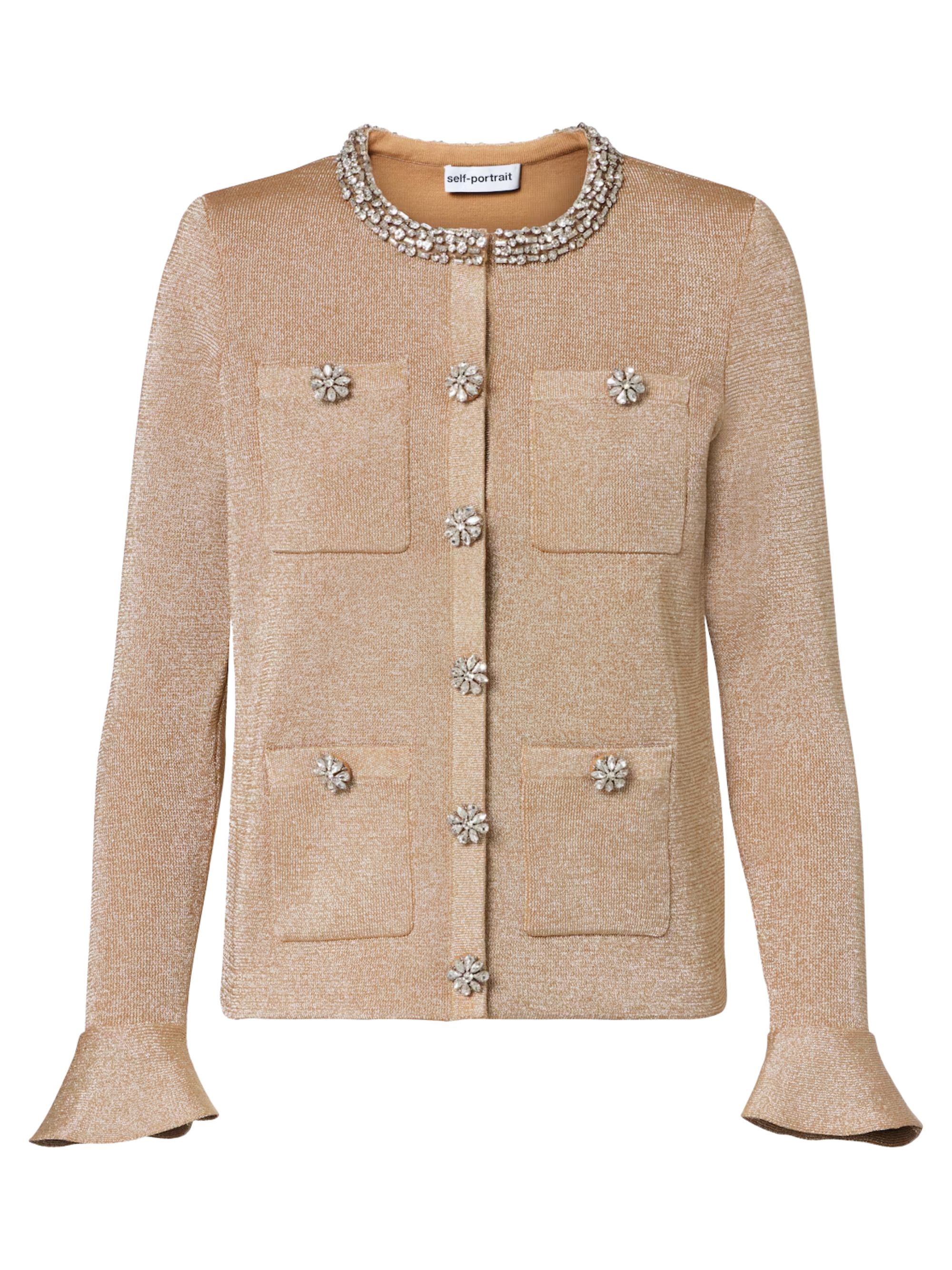 Cardigan con decorazioni di SELF PORTRAIT beige in misto lana con tasche applicate e chiusura con bottoni a pressione gioiello.