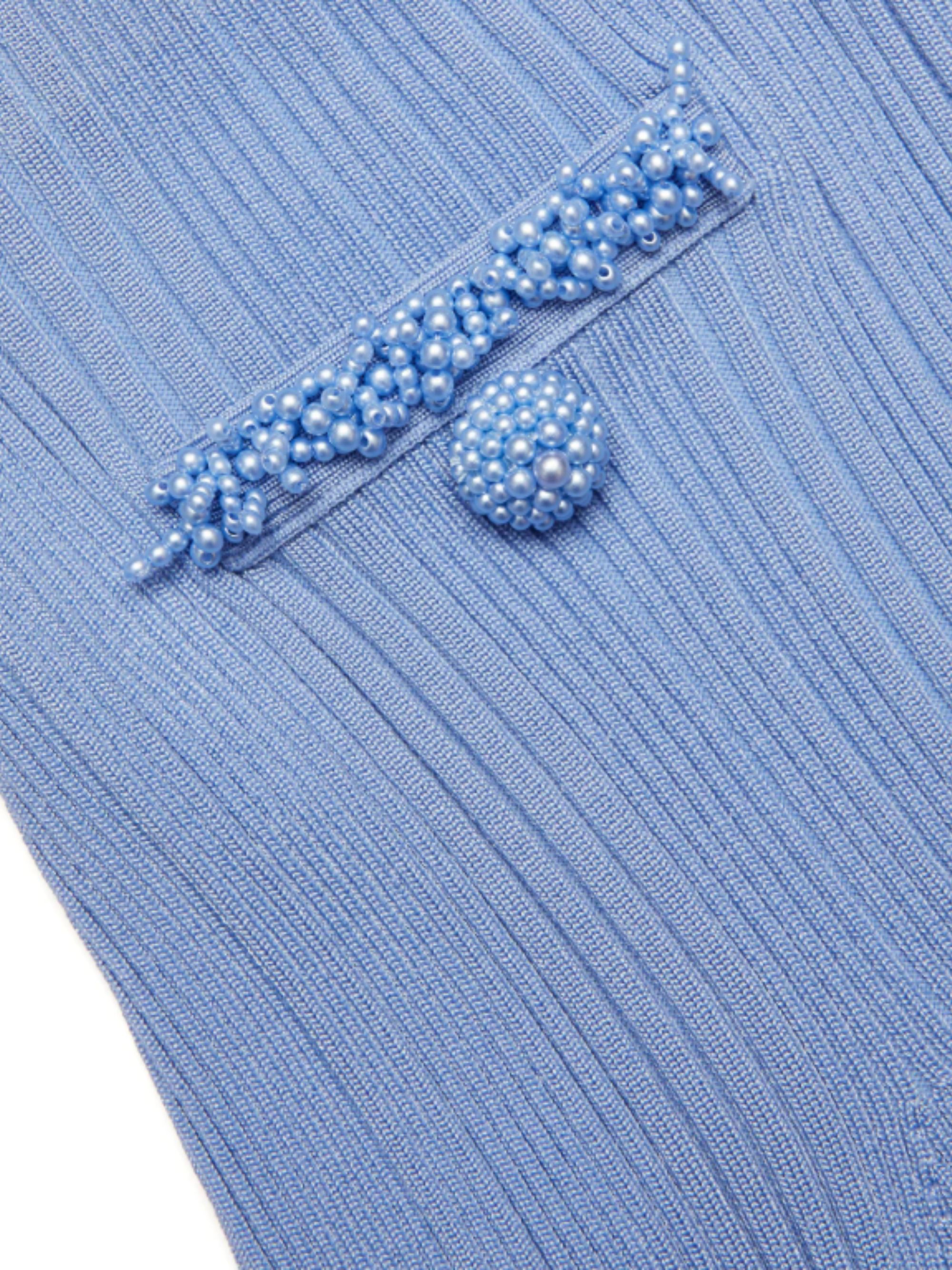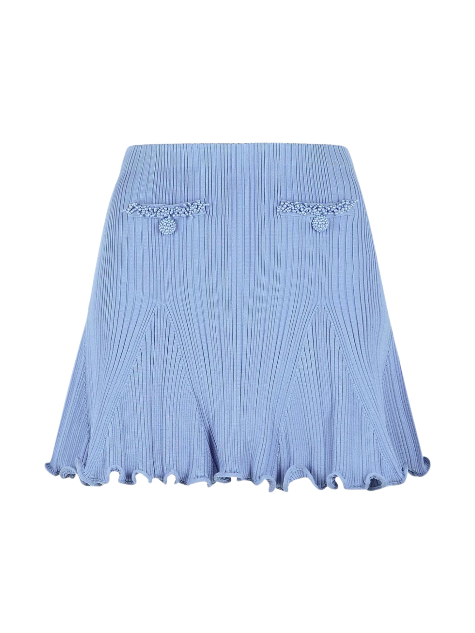 Gonna corta di SELF PORTRAIT azzurra in maglia a coste, design svasato, tasche a filetto con bottoni decorativi e orlo elasticizzato.