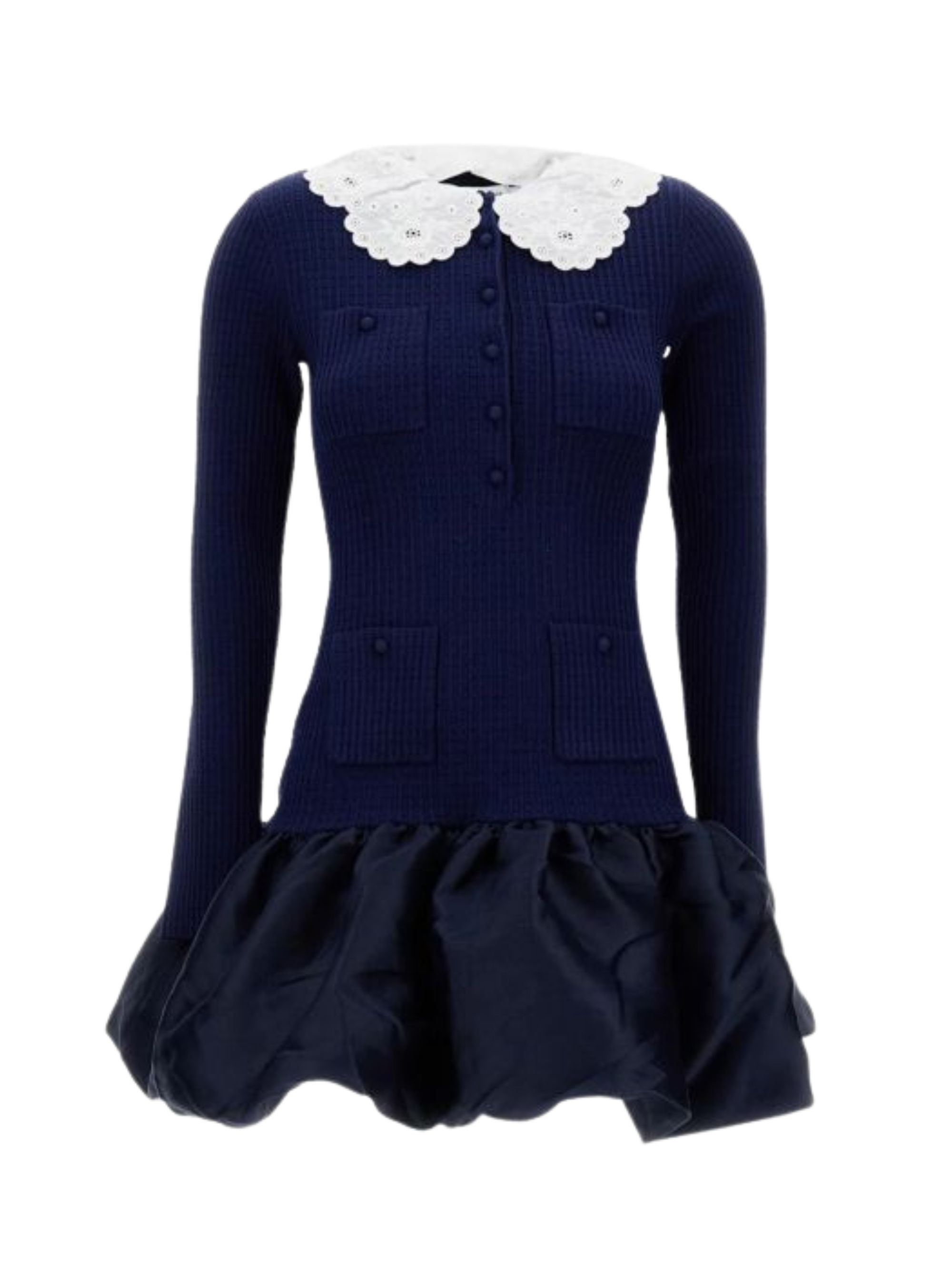 Mini abito a maglia di SELF PORTRAIT blu in viscosa, caratterizzato da chiusura con bottoni sul davanti, colletto a contrasto in pizzo e gonna a palloncino.
