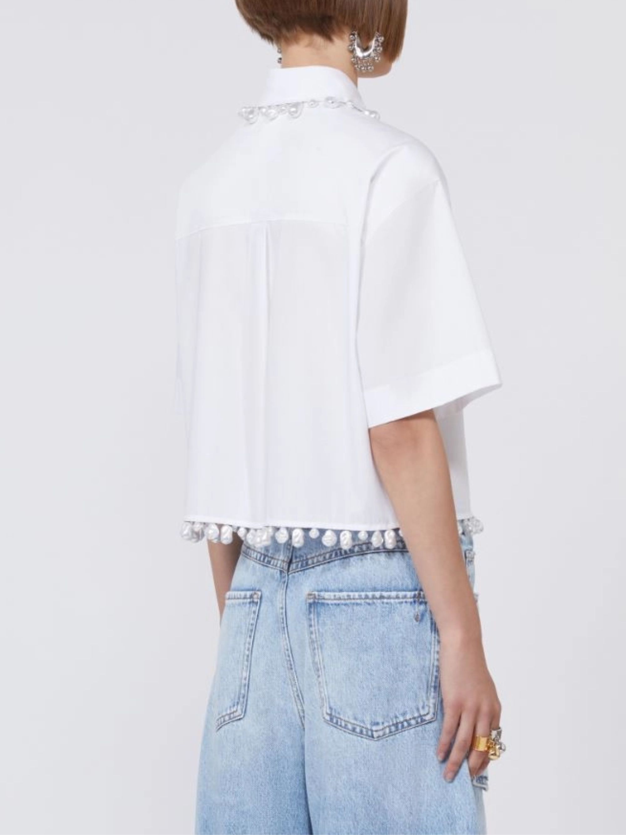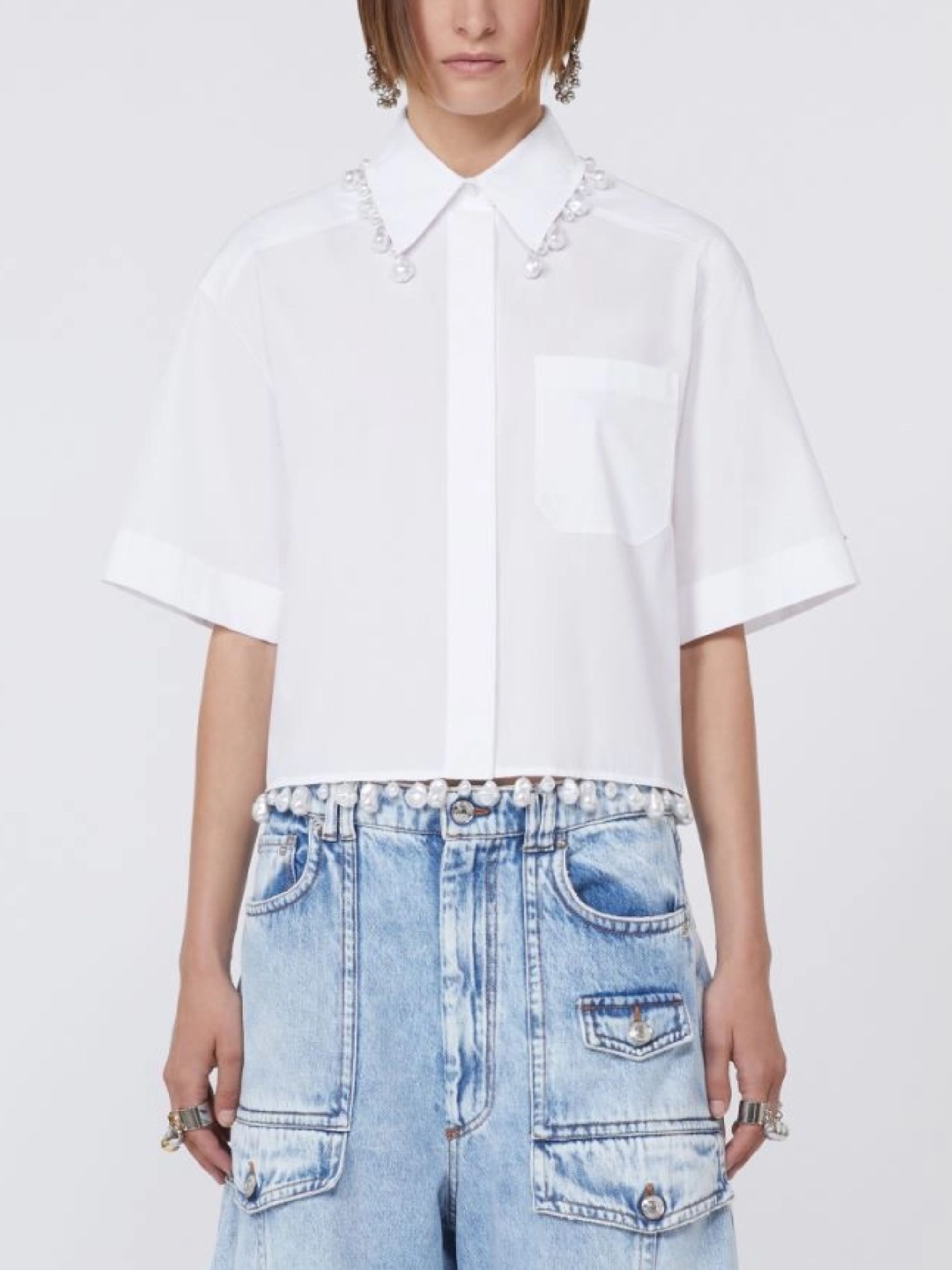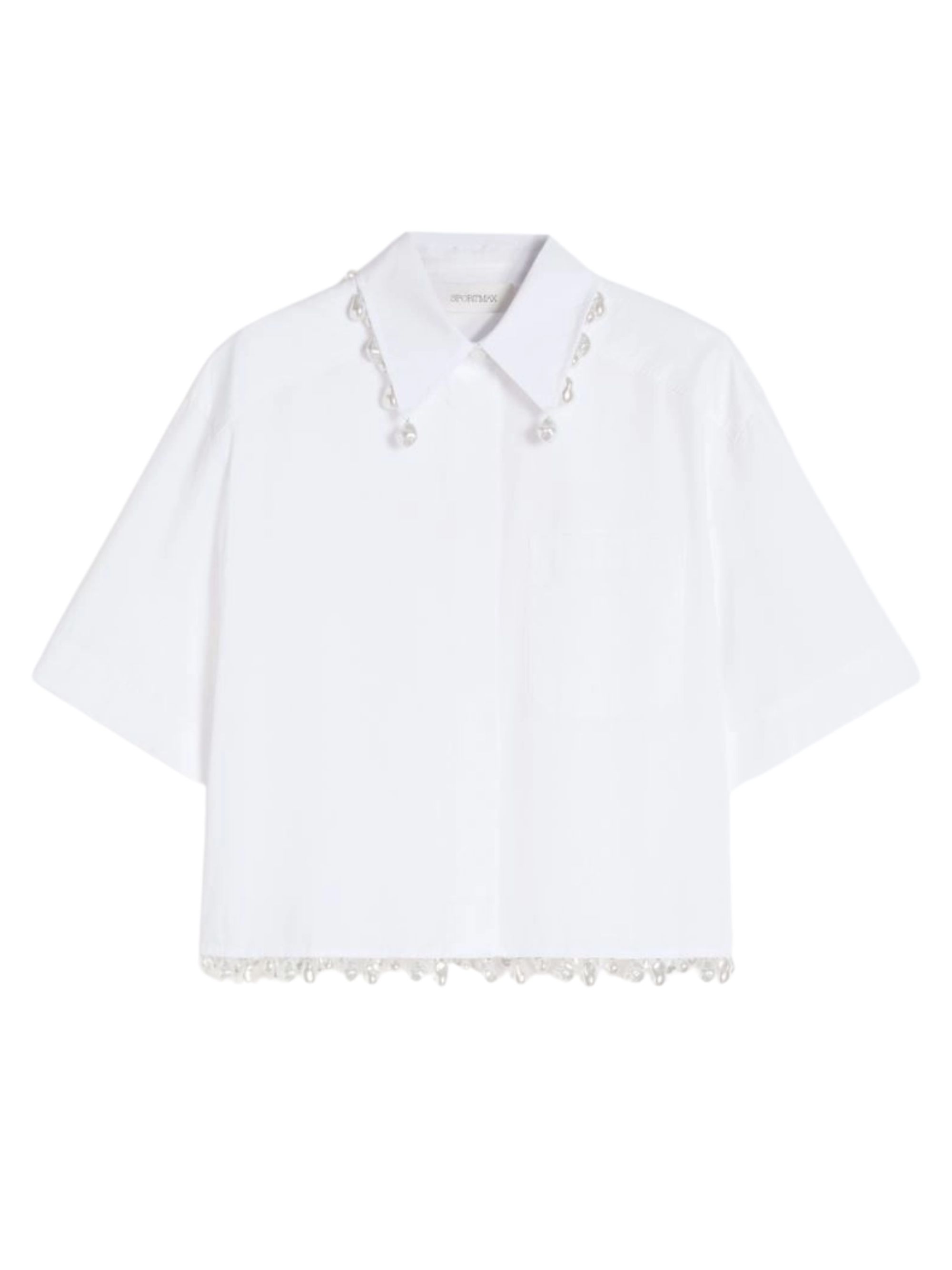 Camicia in popeline di cotone bianco di SPORTMAX caratterizzata da motivo di perle cucite sul colletto, abbottonatura nascosta e maniche ampie e corte.