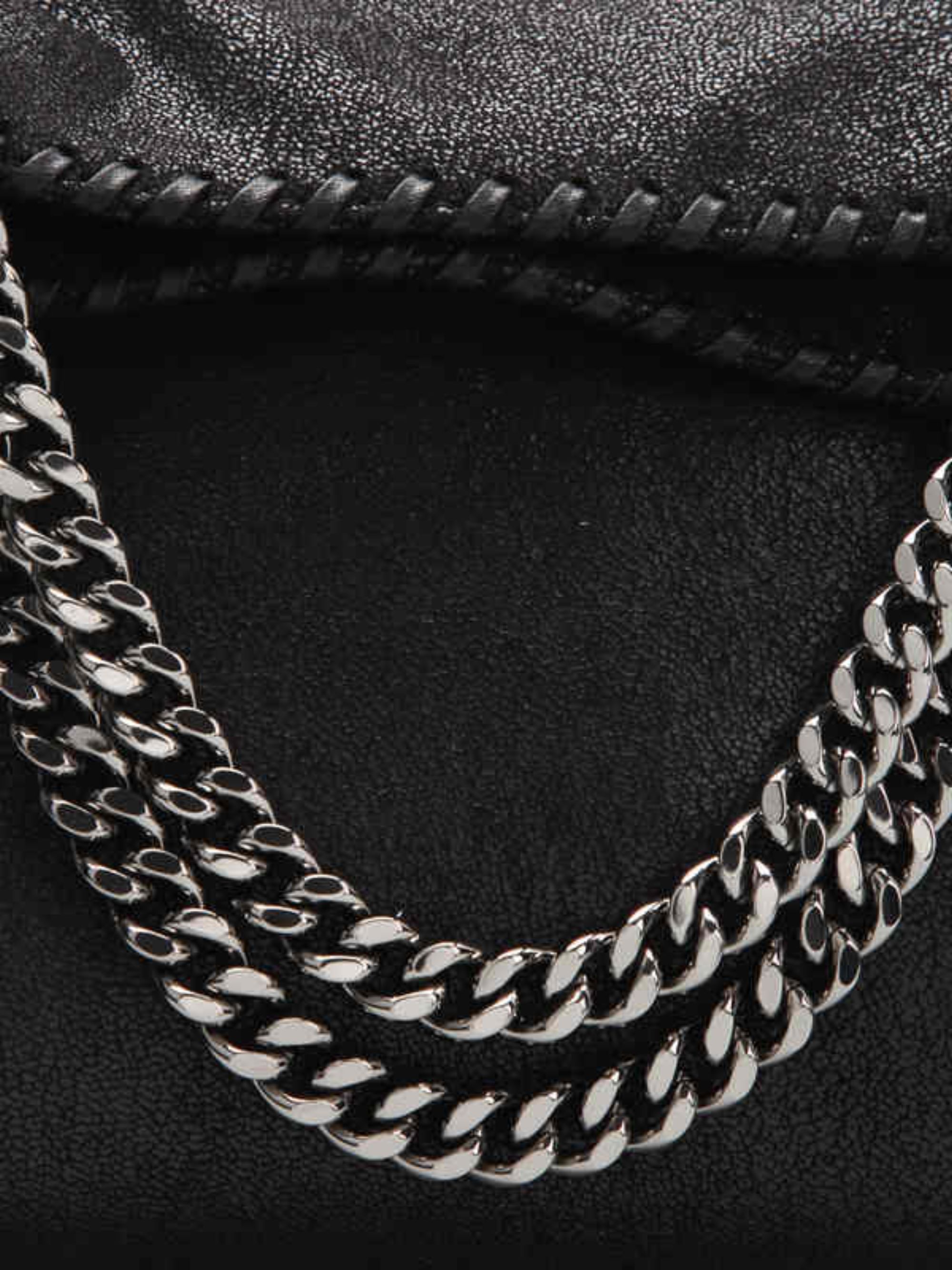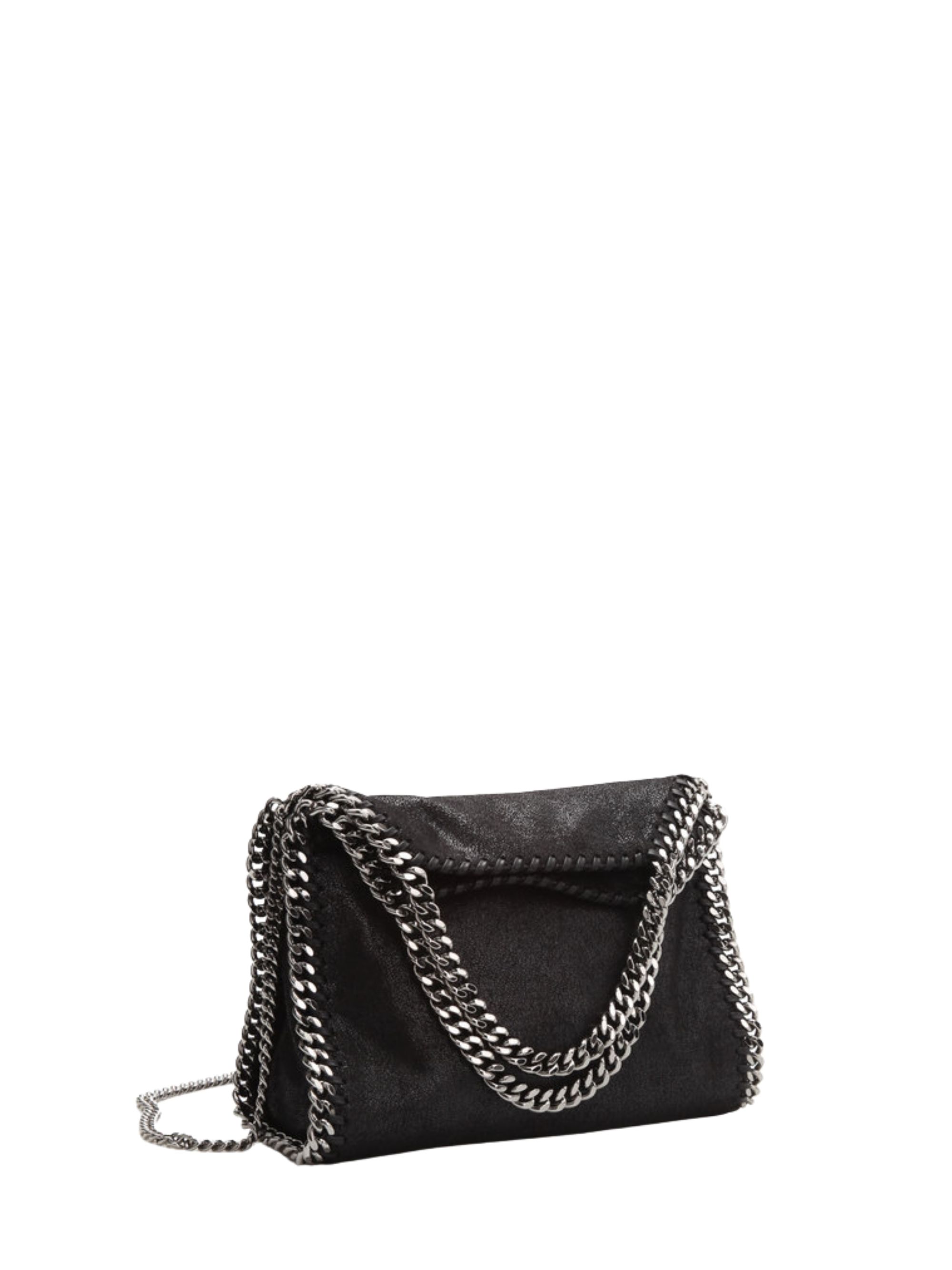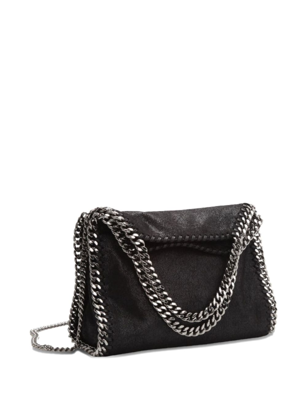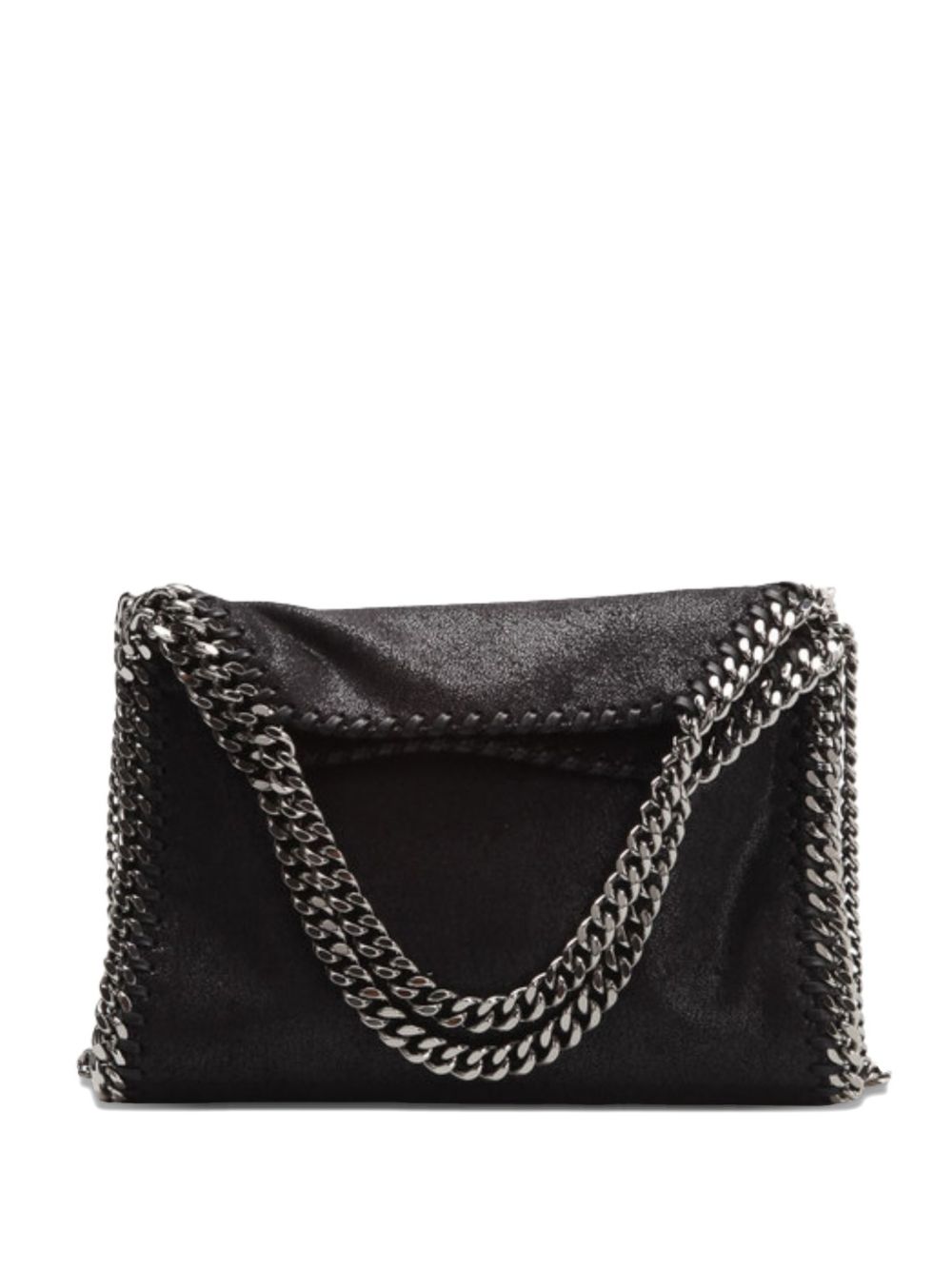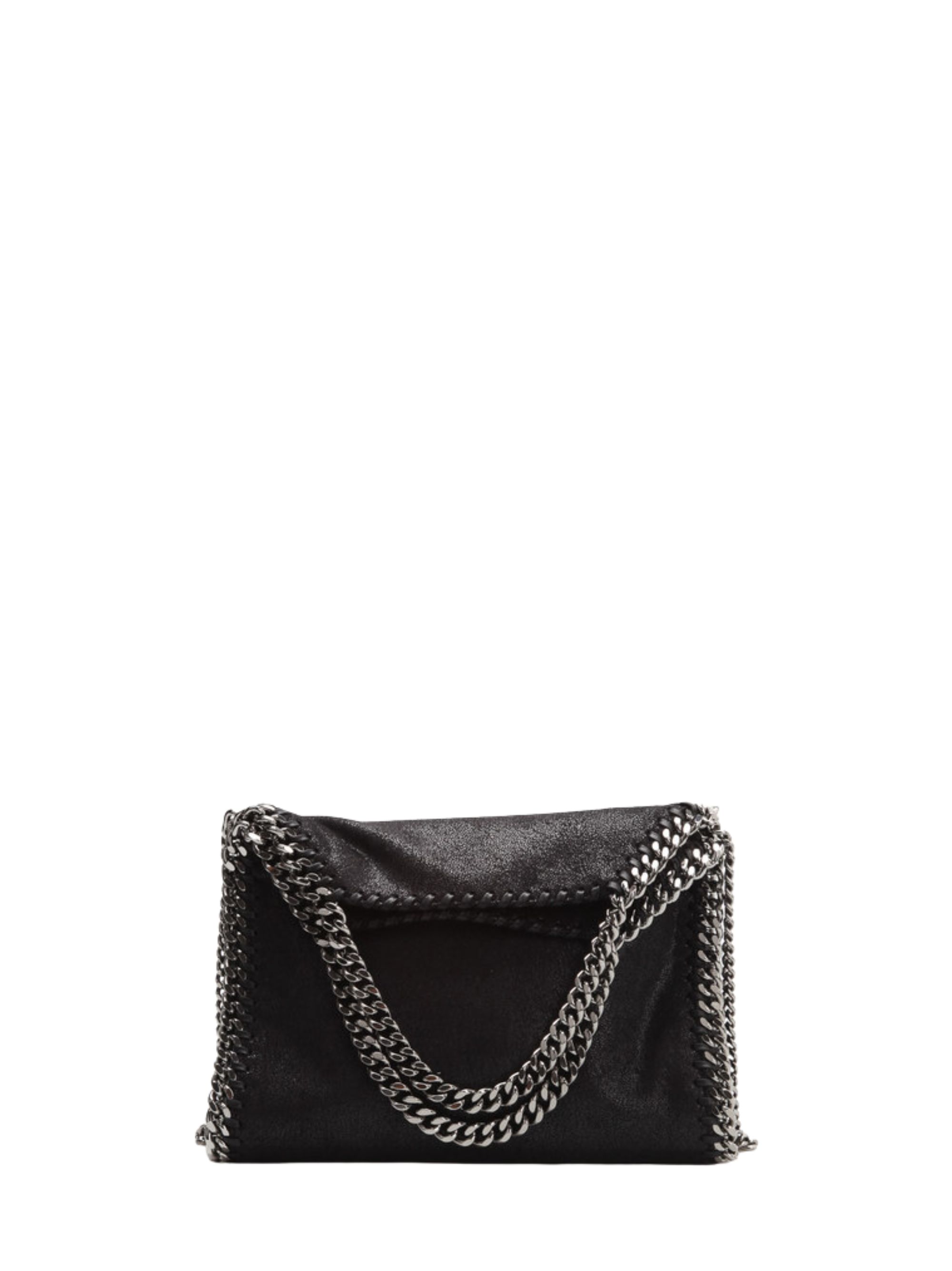Borsa Falabella mini di STELLA MCCARTNEY nera in ecopelle con hardware argento, ciondolo con logo e chiusura magnetica.