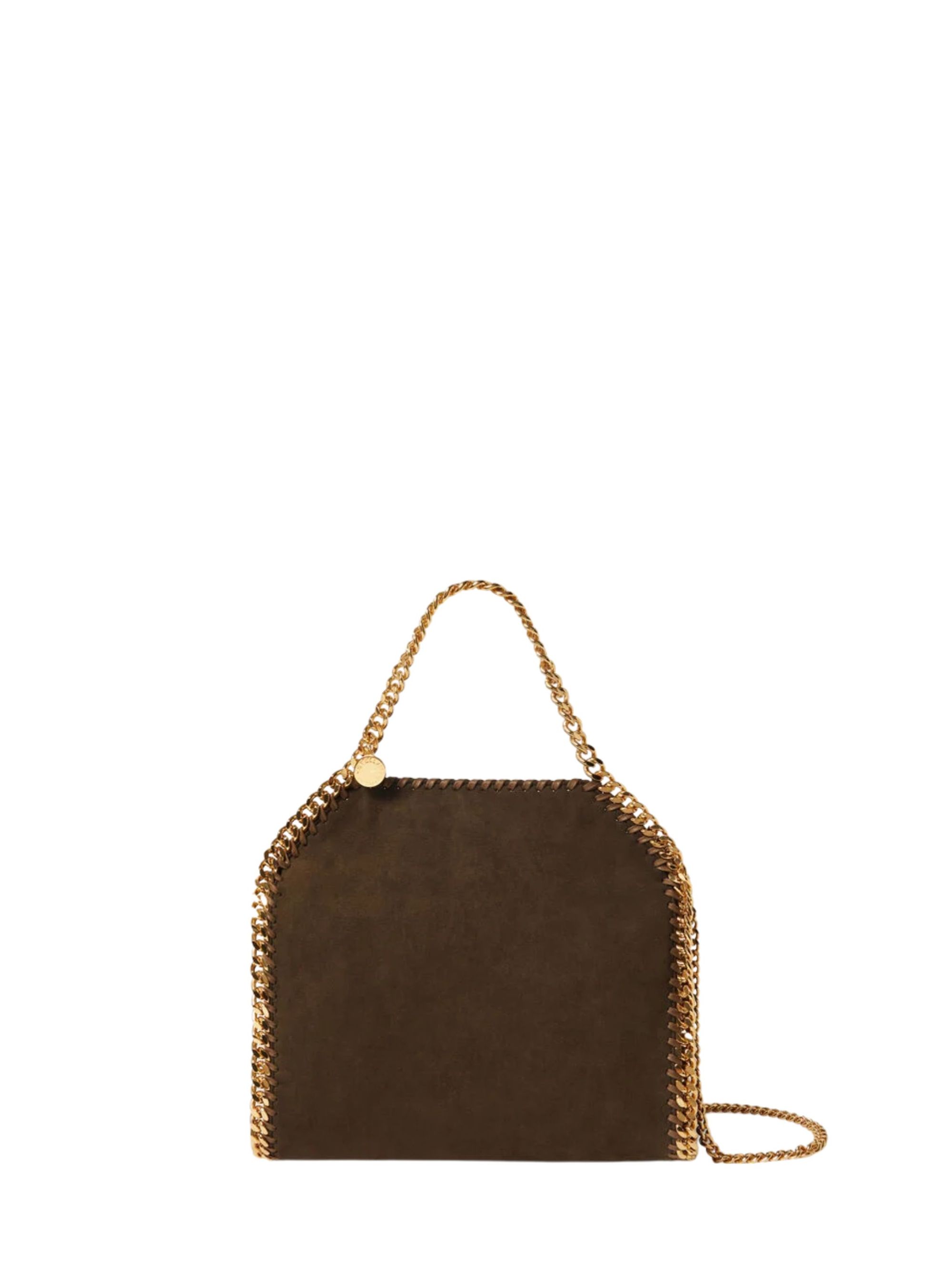 Borsa Falabella mini di STELLA MCCARTNEY marrone in ecopelle con hardware oro, ciondolo con logo e chiusura magnetica.
