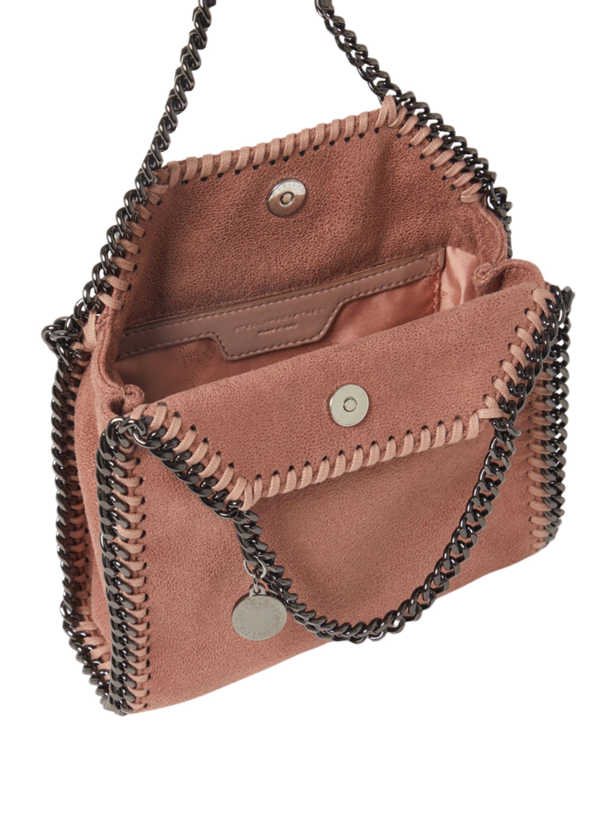 Borsa Falabella tiny di STELLA MCCARTNEY marrone in ecopelle con catene e hardware argento, tracolla, pendaglio con logo e chiusura magnetica. Dimensioni: 18 x 17,5 x 6 cm.
