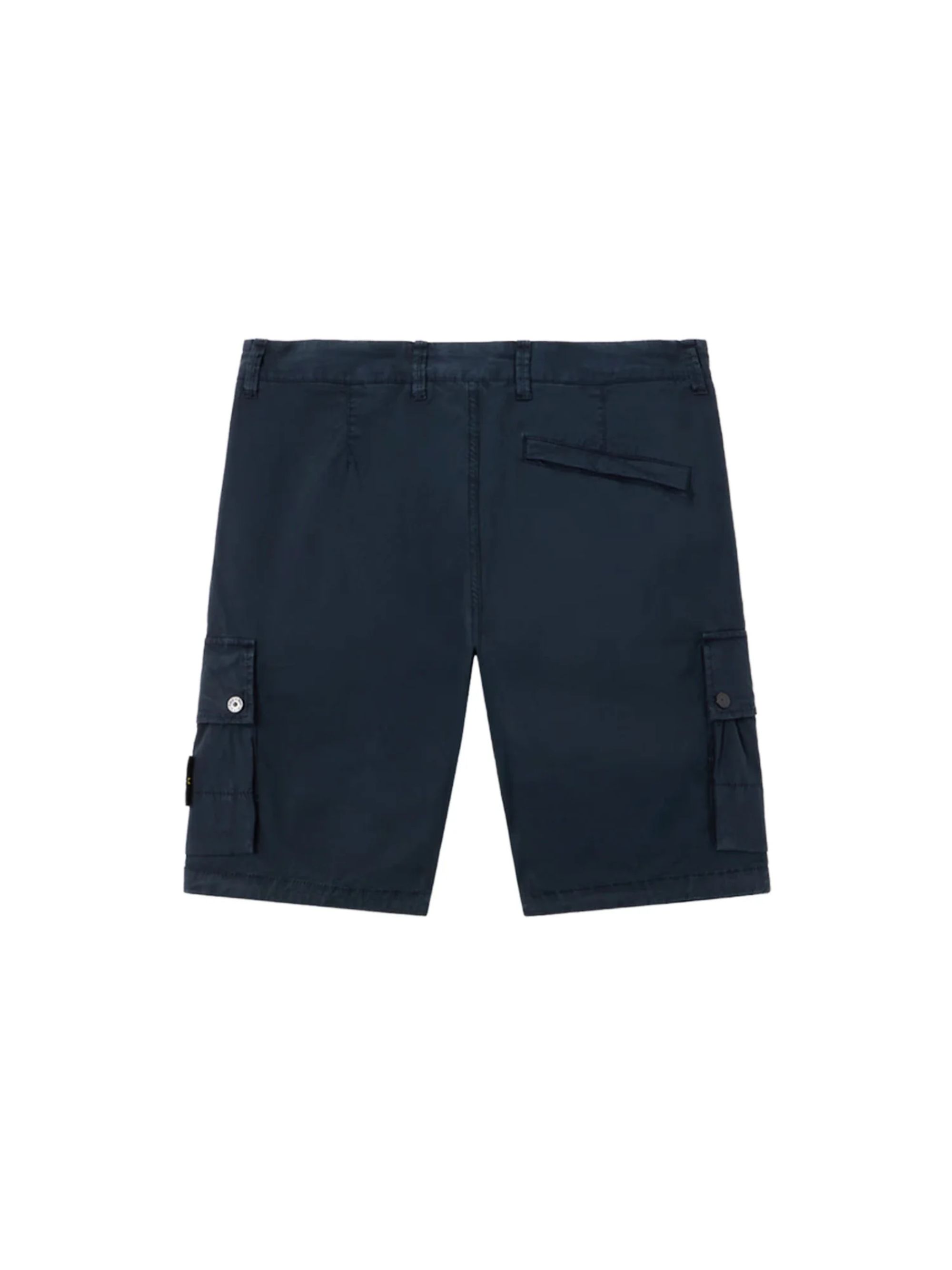 Bermuda con logo di STONE ISLAND blu in cotone, caratterizzato da chiusura con zip e bottone, tasche laterali a filo con zip, tasche cargo con pattina e logo e una tasca a filetto sulla parte posteriore.
