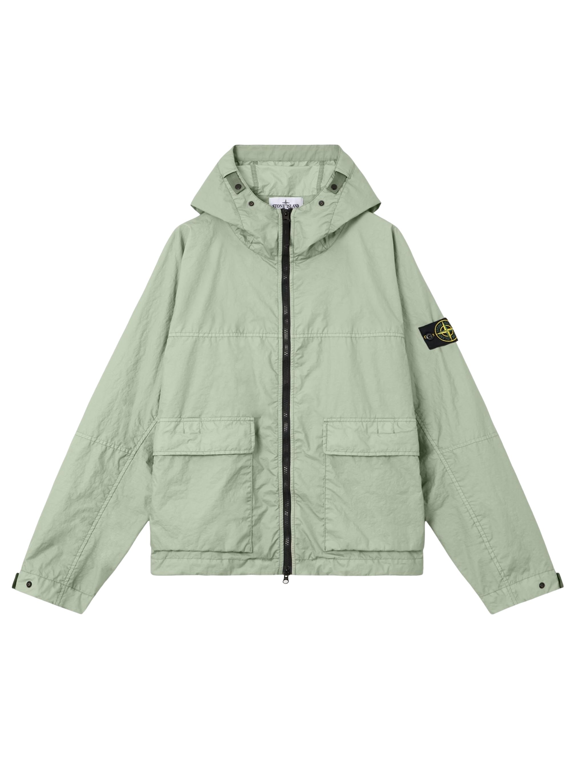 Parka con logo di STONE ISLAND verde, caratterizzato da dettaglio con applicazione, tasche frontali con patta, cappuccio, chiusura con zip e orli con abbottonatura.