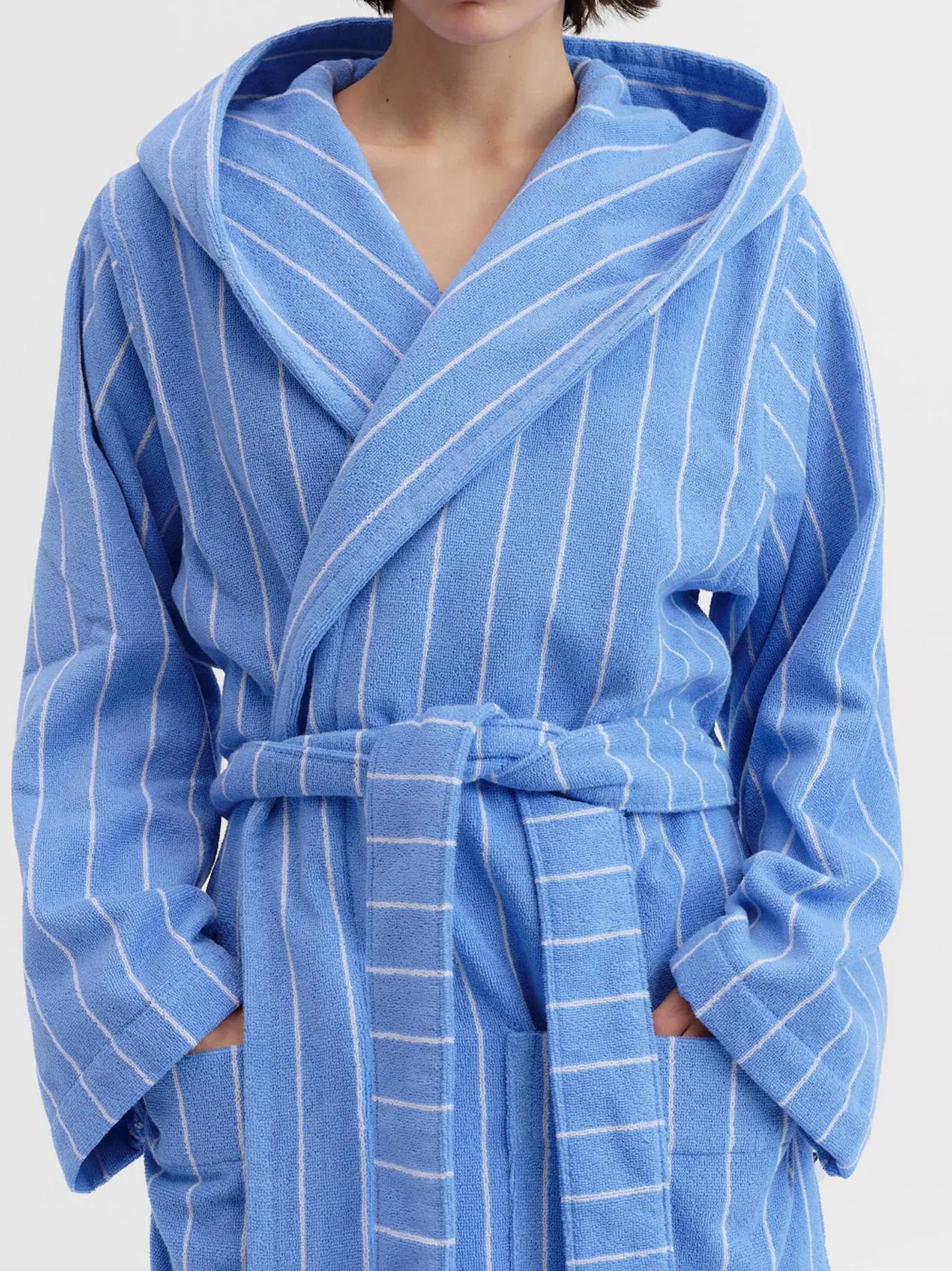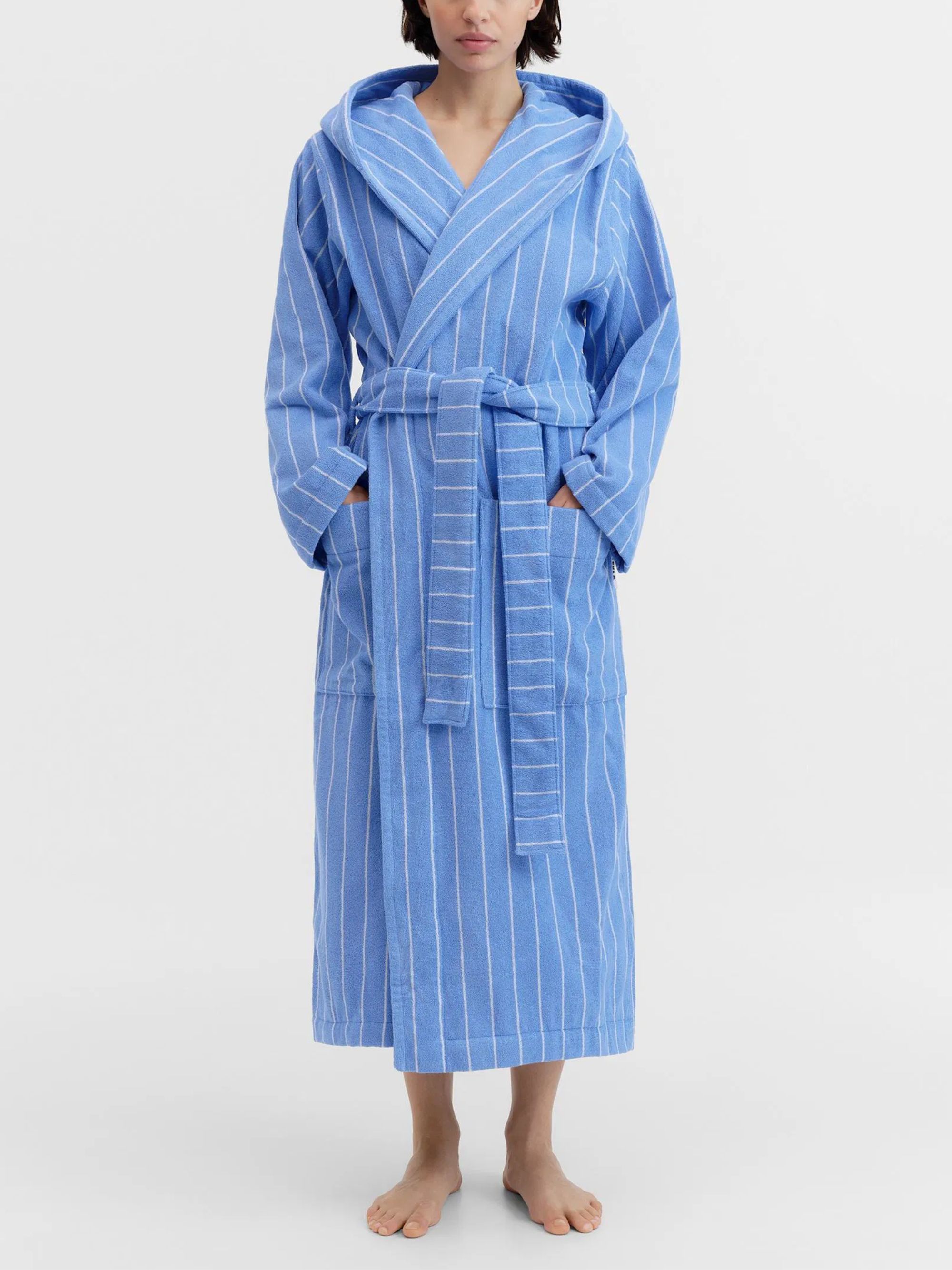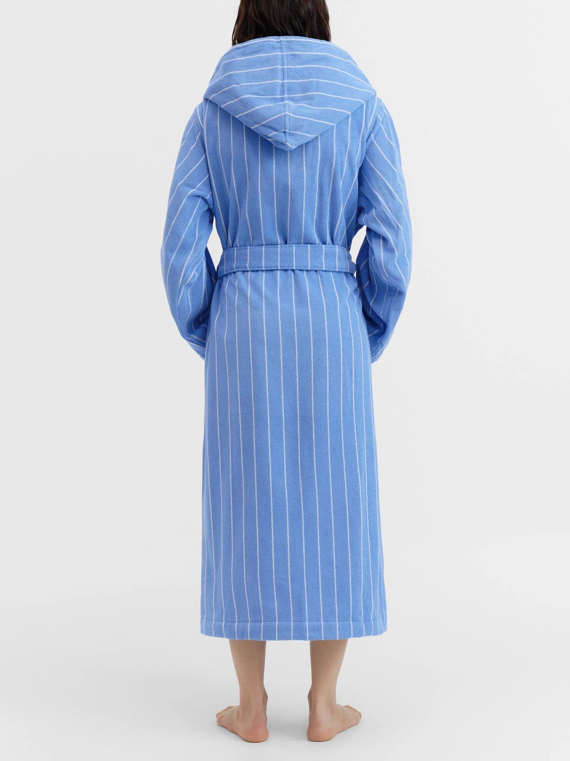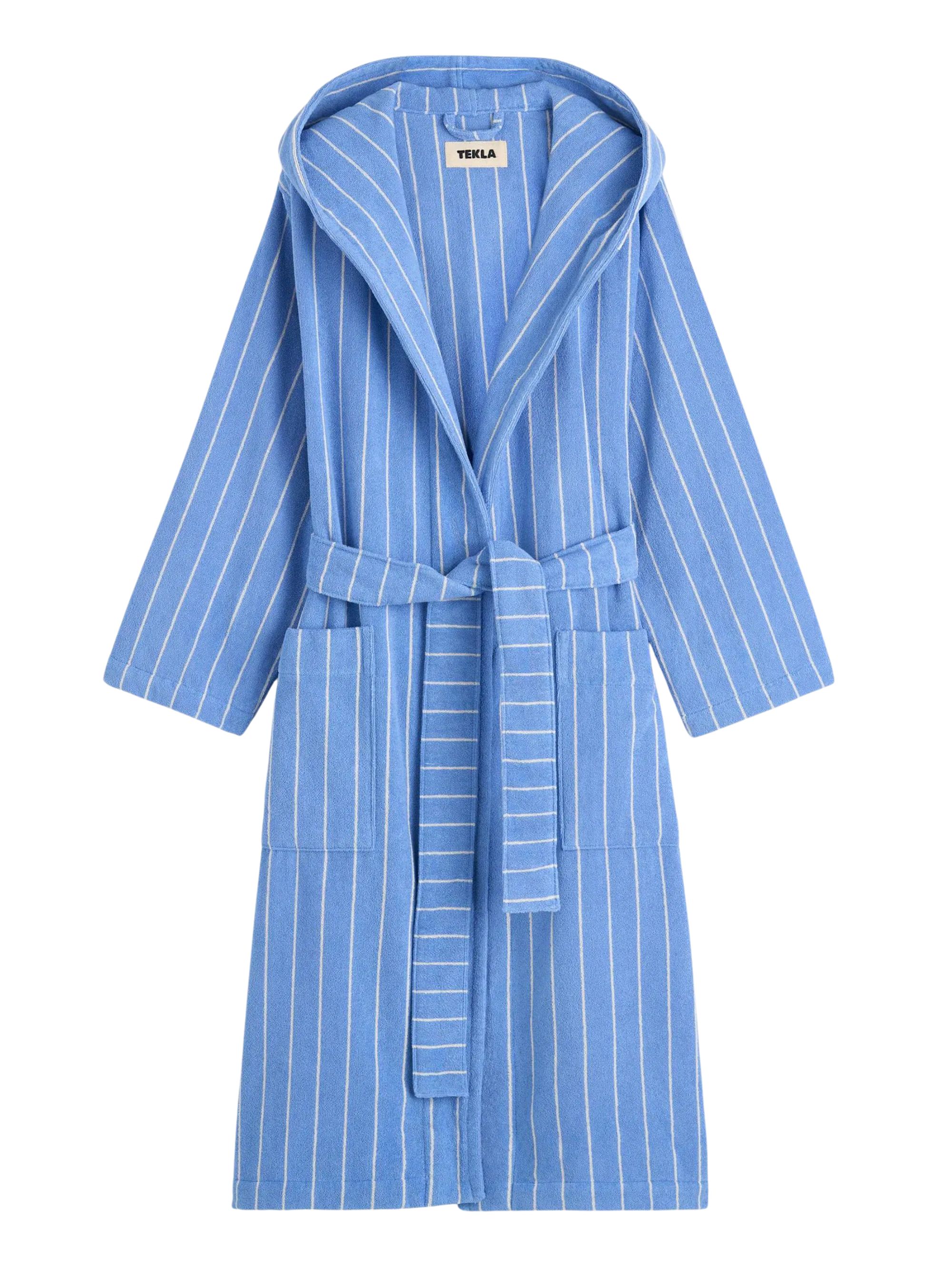 Accappatoio in spugna di TEKLA azzurro con righe bianche verticali e chiusura con cintura.