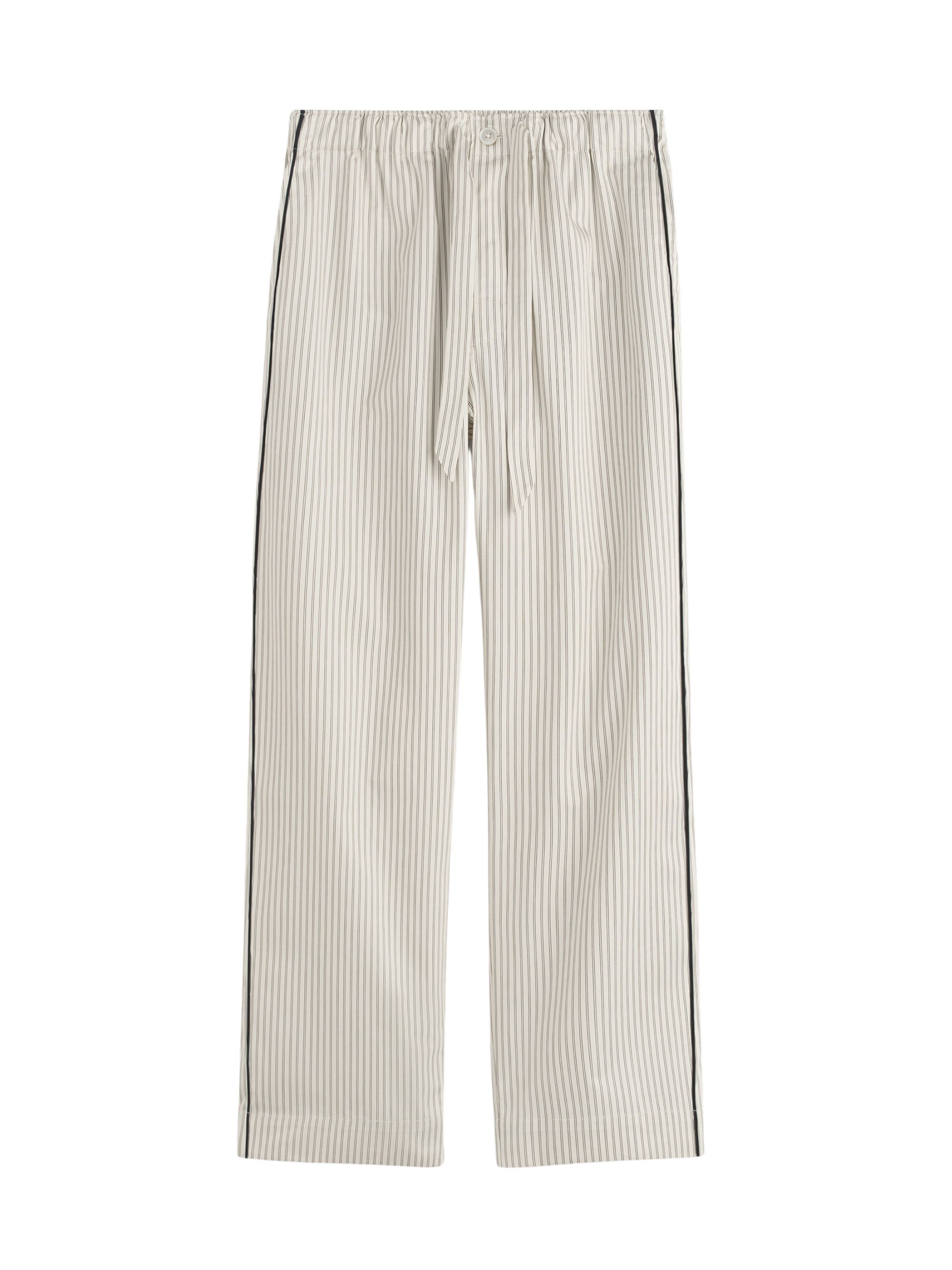 Pantaloni del pigiama a righe di TEKLA marrone in raso cotone biologico, caratterizzati da vita arricciata, fiocco a righe in vita, tasca singola sul retro e rifiniture nere ai lati.
