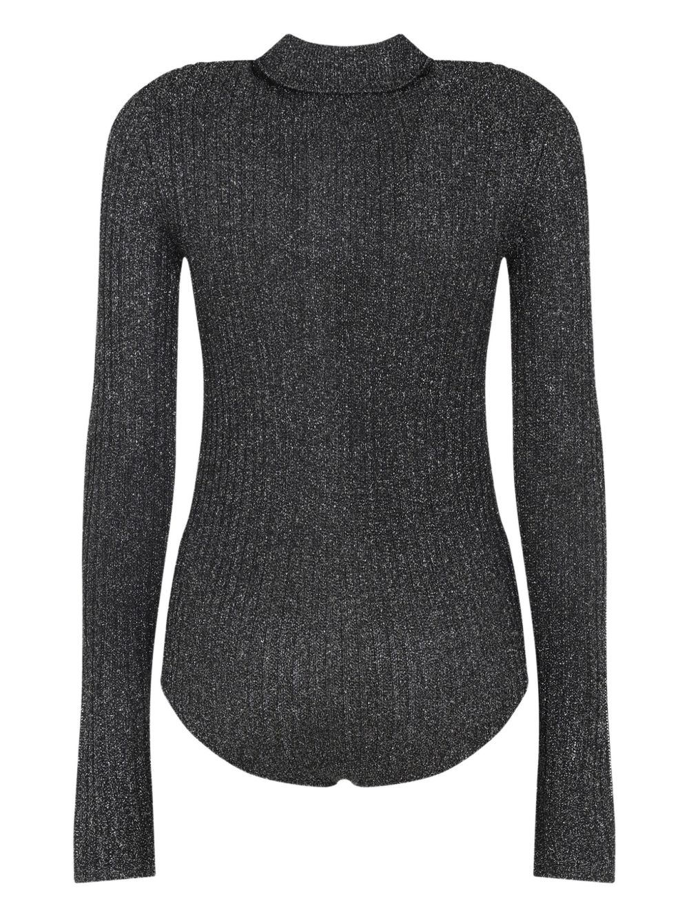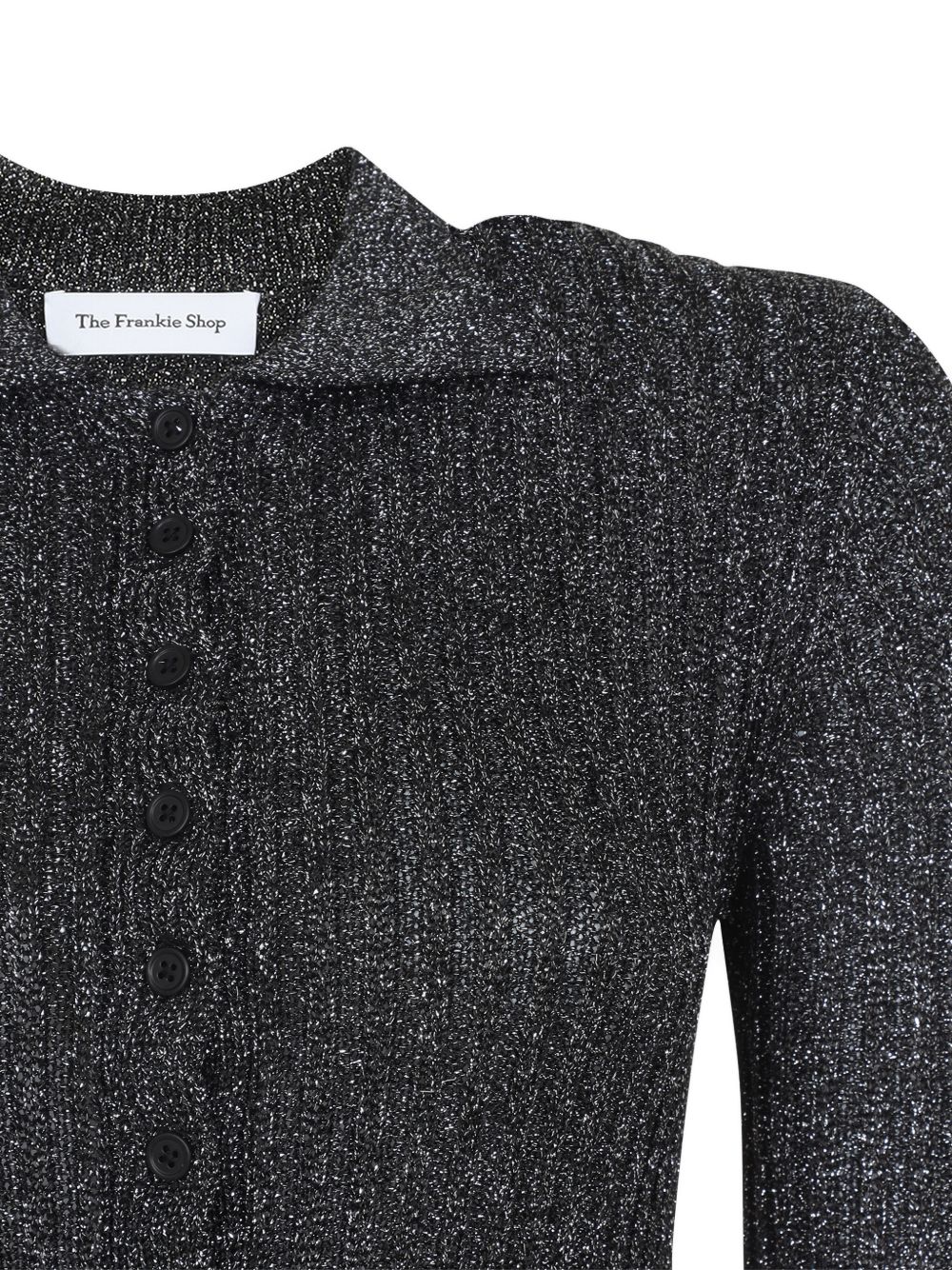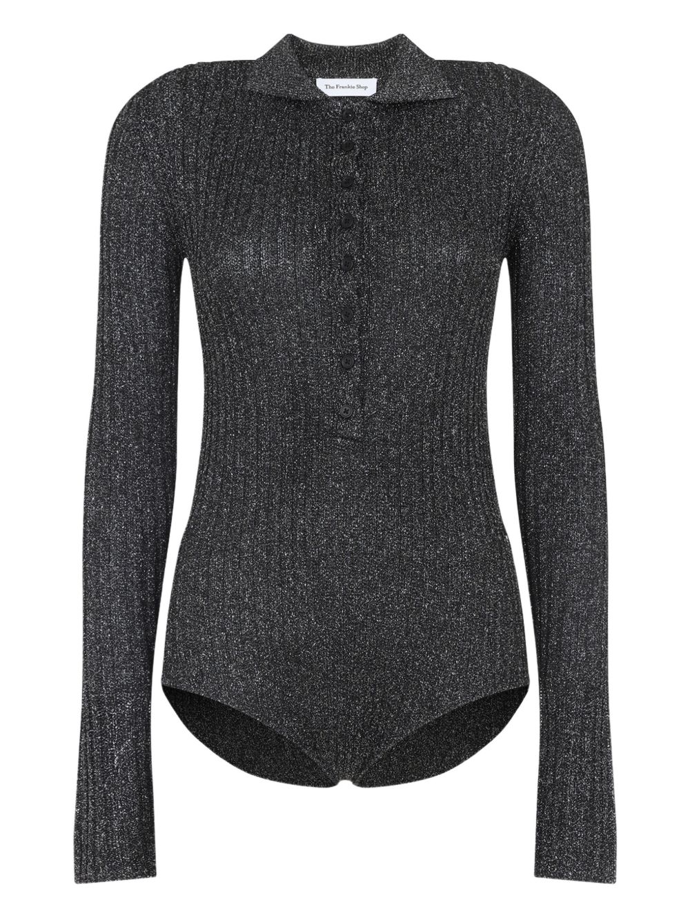 Body Solana Polo di THE FRANKIE SHOP nero in lana e seta, caratterizzato da colletto polo, abbottonatura parziale, stile slip-on senza chiusura inferiore e maniche lunghe.
