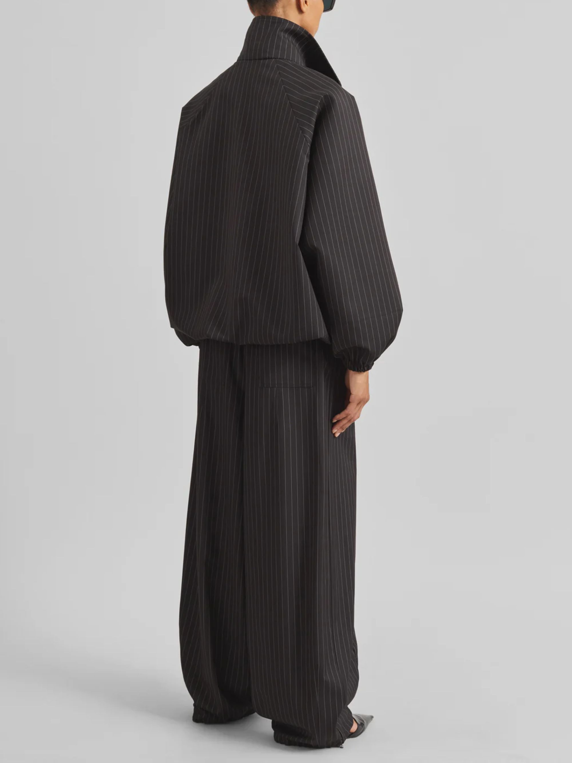 Bomber Baxter di THE FRANKIE SHOP nero gessato in tessuto leggero con maniche ragla, tasche a filetto anteriori, polsini e orli elasticizzati, vestibilità oversize e chiusura con cerniera a doppio cursore.