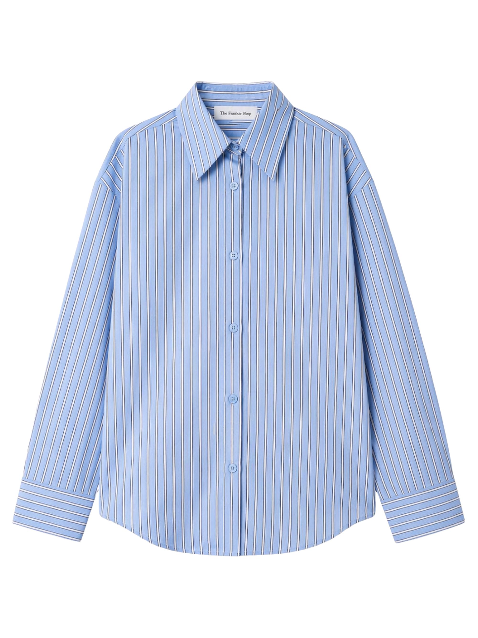 Camicia Peri di THE FRANKIE SHOP azzurra in lyocell morbido caratterizzata da motivo a righe bianche e nere, colletto, orlo curvo e chiusura con bottoni.