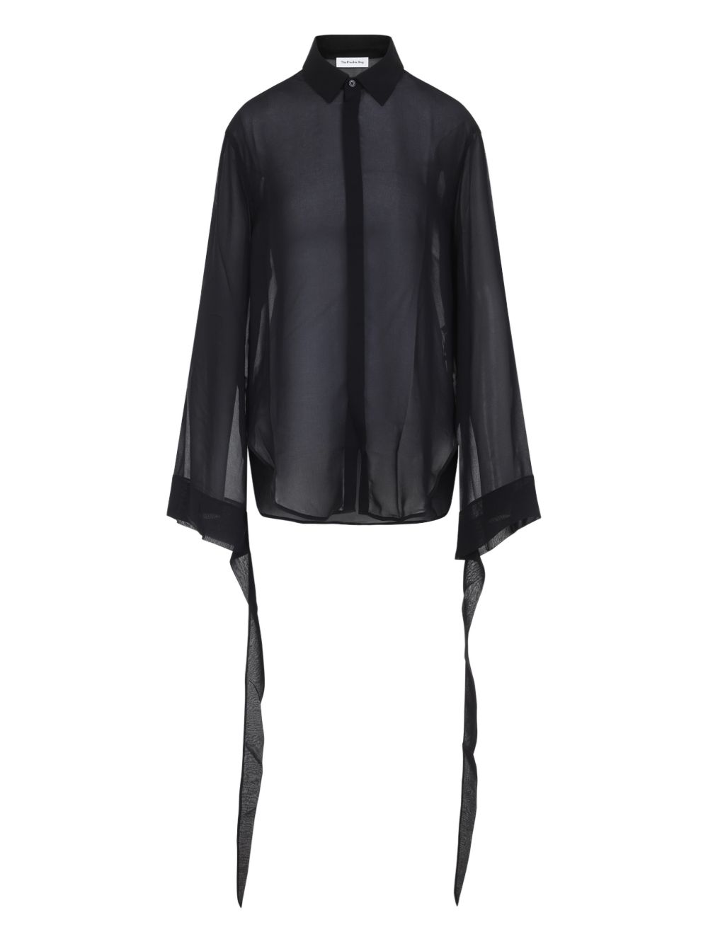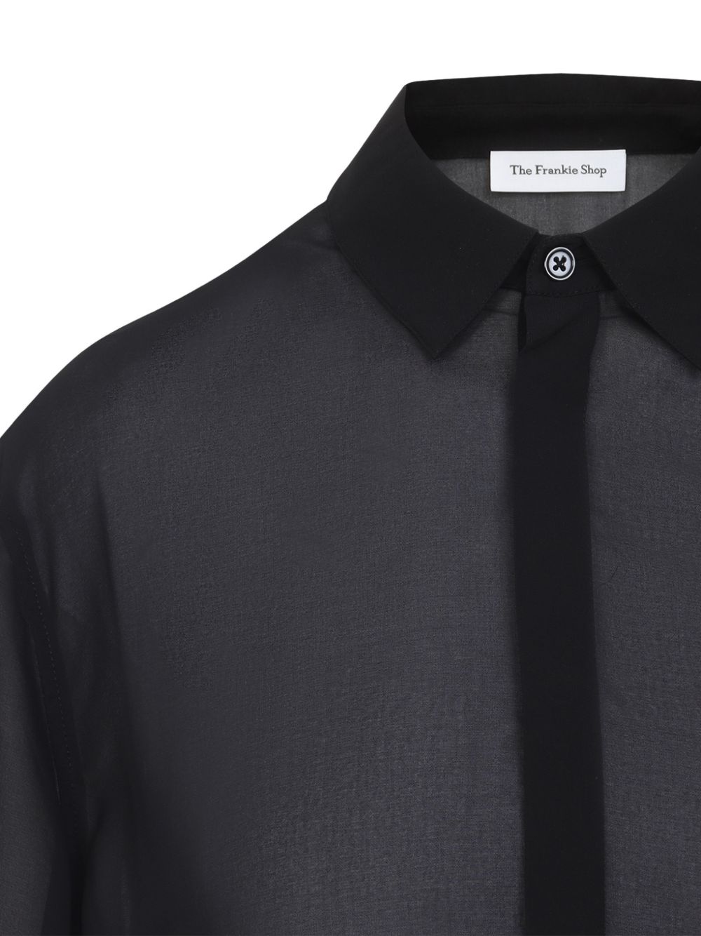 Camicia Verlin di THE FRANKIE SHOP nera in tessuto leggero e trasparente, caratterizzata da colletto a punta, polsini larghi con dettaglio di cravatta, orlo curvo e chiusura frontale con bottoni.