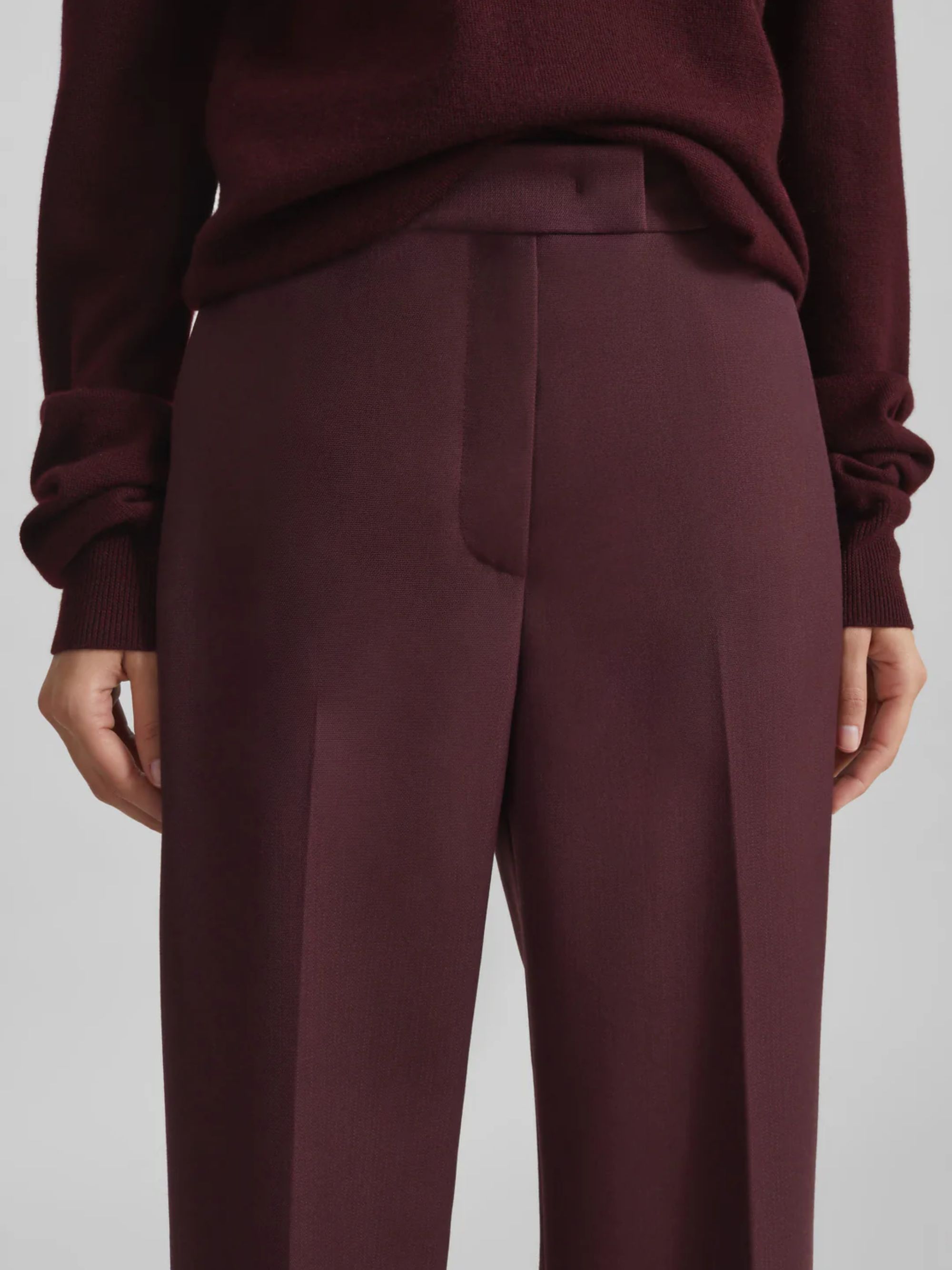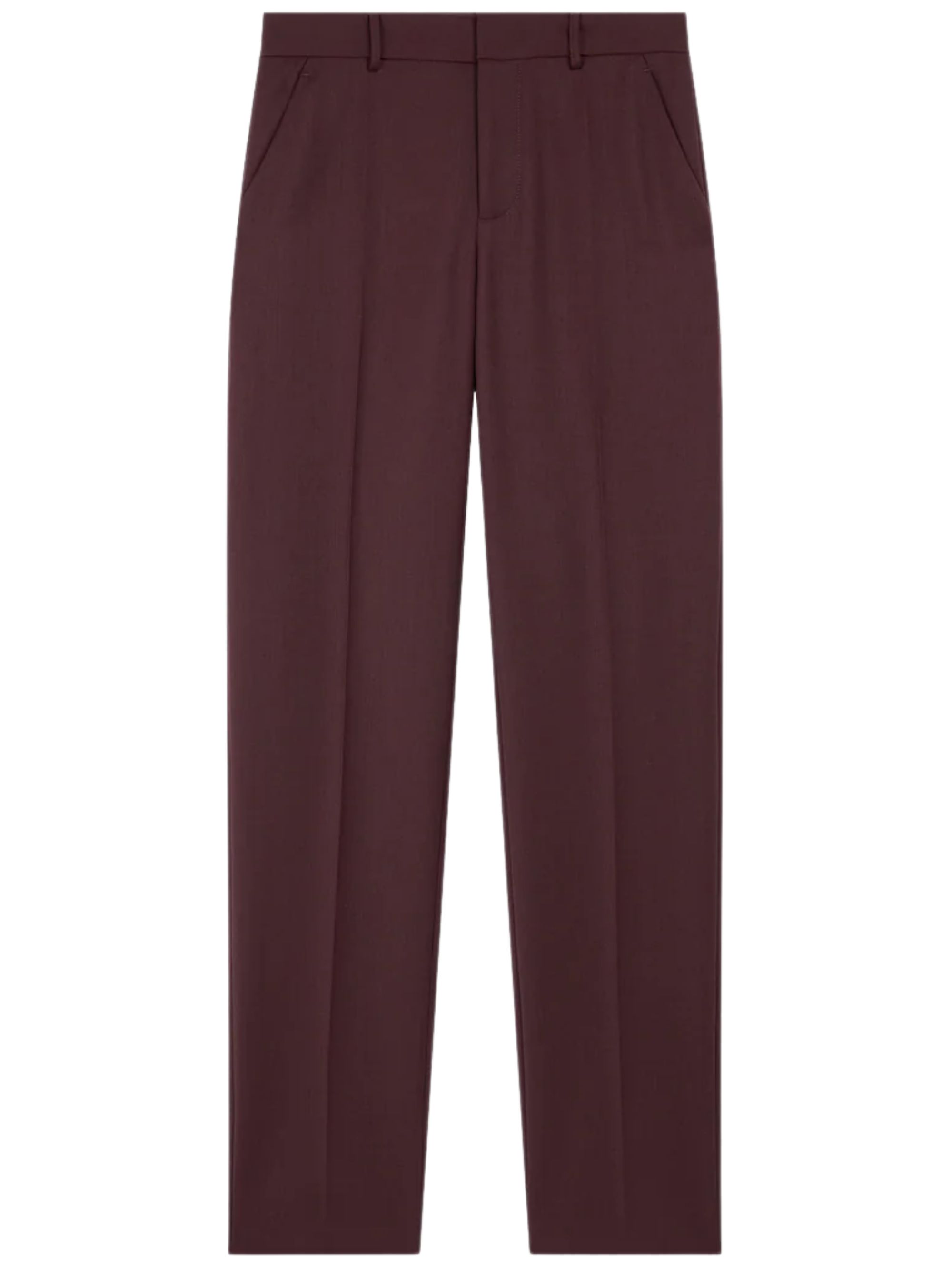 Pantalone Lenora di THE FRANKIE SHOP bordeaux in misto lana con gamba dritta, passanti per cintura, piega frontale stirata, tasche laterali, tasca posteriore a filetto e chiusura con gancio e zip.