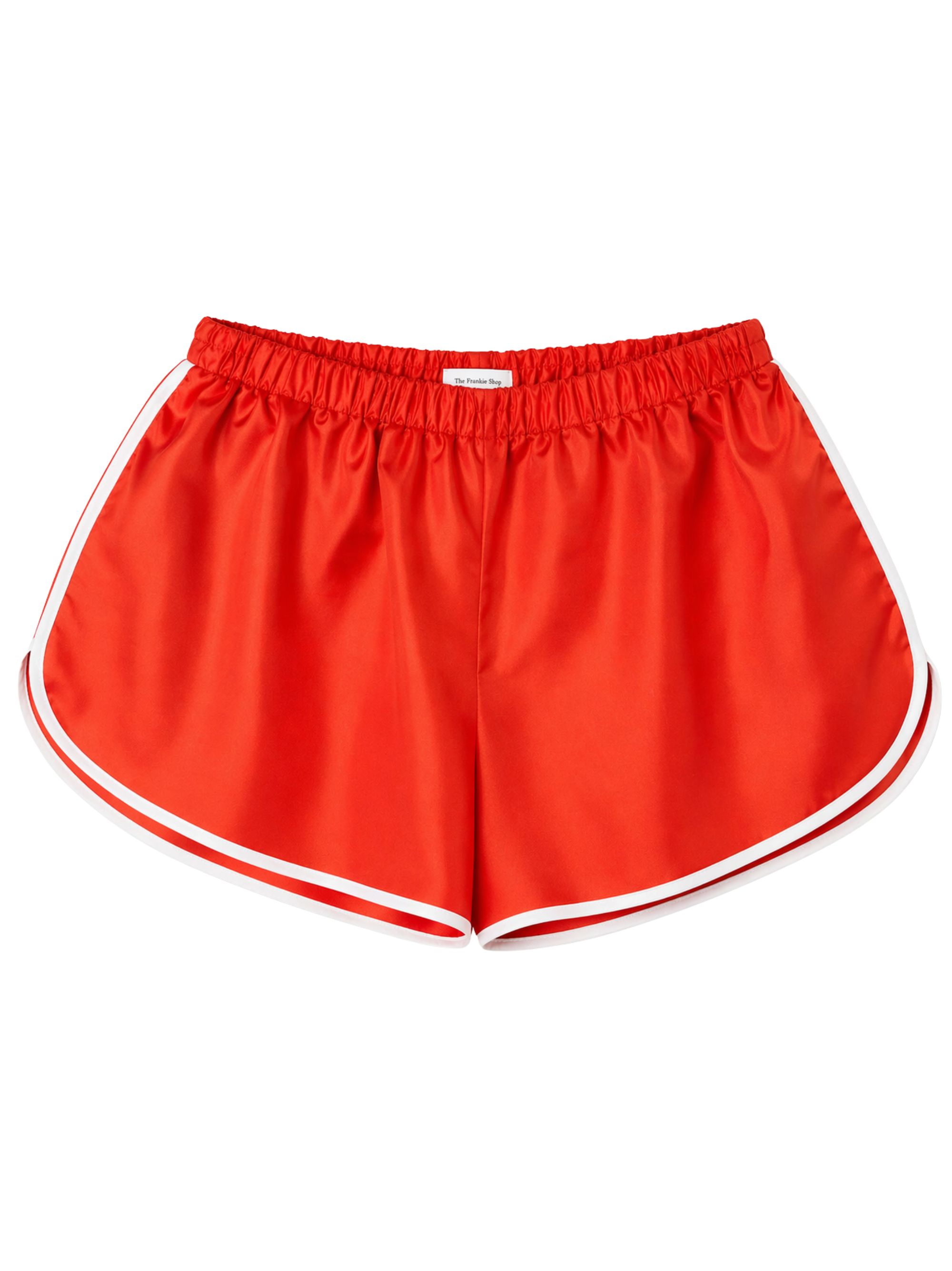 Short Adia di THE FRANKIE SHOP rosso con profilo bianco e vita elasticizzata.