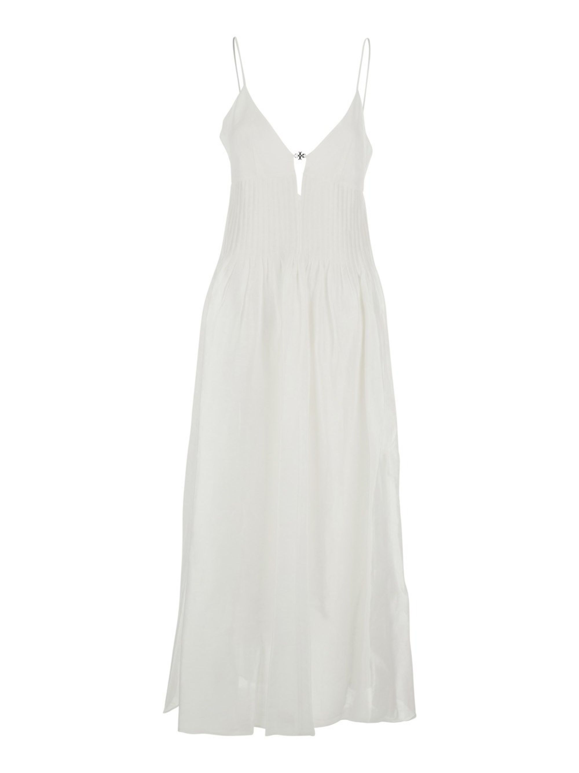 Abito lungo smanicato di TORY BURCH bianco in lino e seta, caratterizzato da spalline sottili, scollo a V, placca logo sullo scollo, chiusura con zip sul retro e orlo dritto.