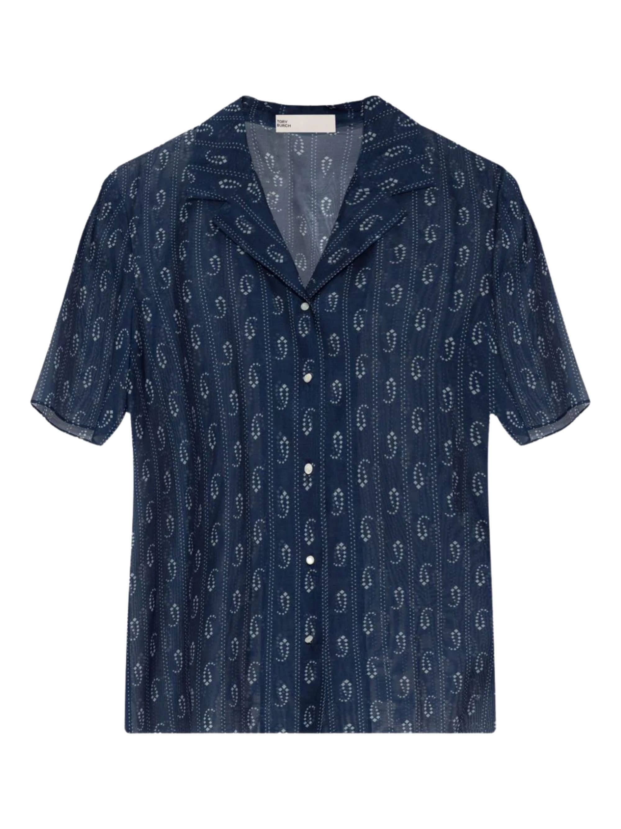 Camicia in seta di TORY BURCH blu in cotone e seta, caratterizzata da motivo paisley, chiusura con bottoni, maniche corte e colletto classico.