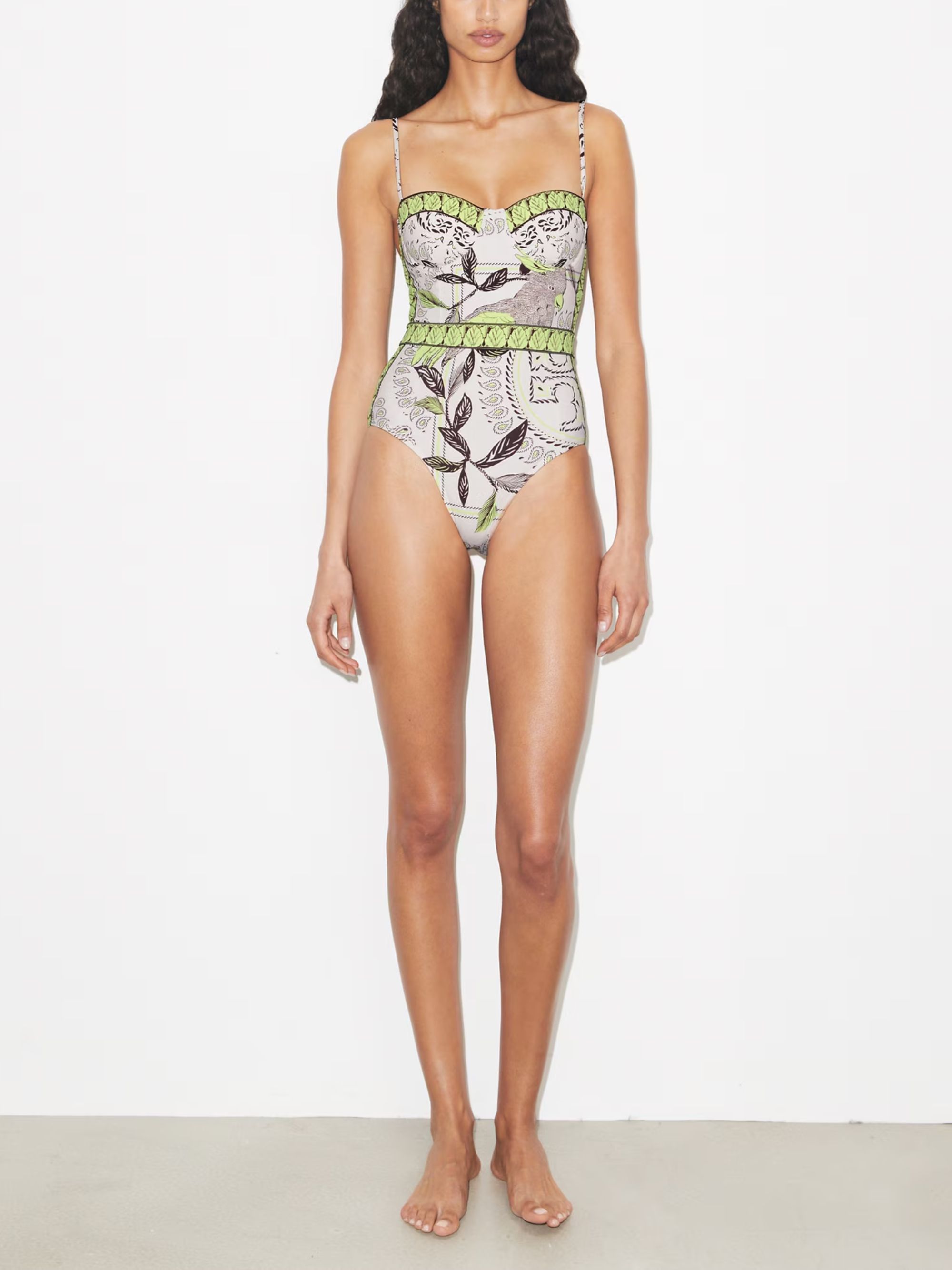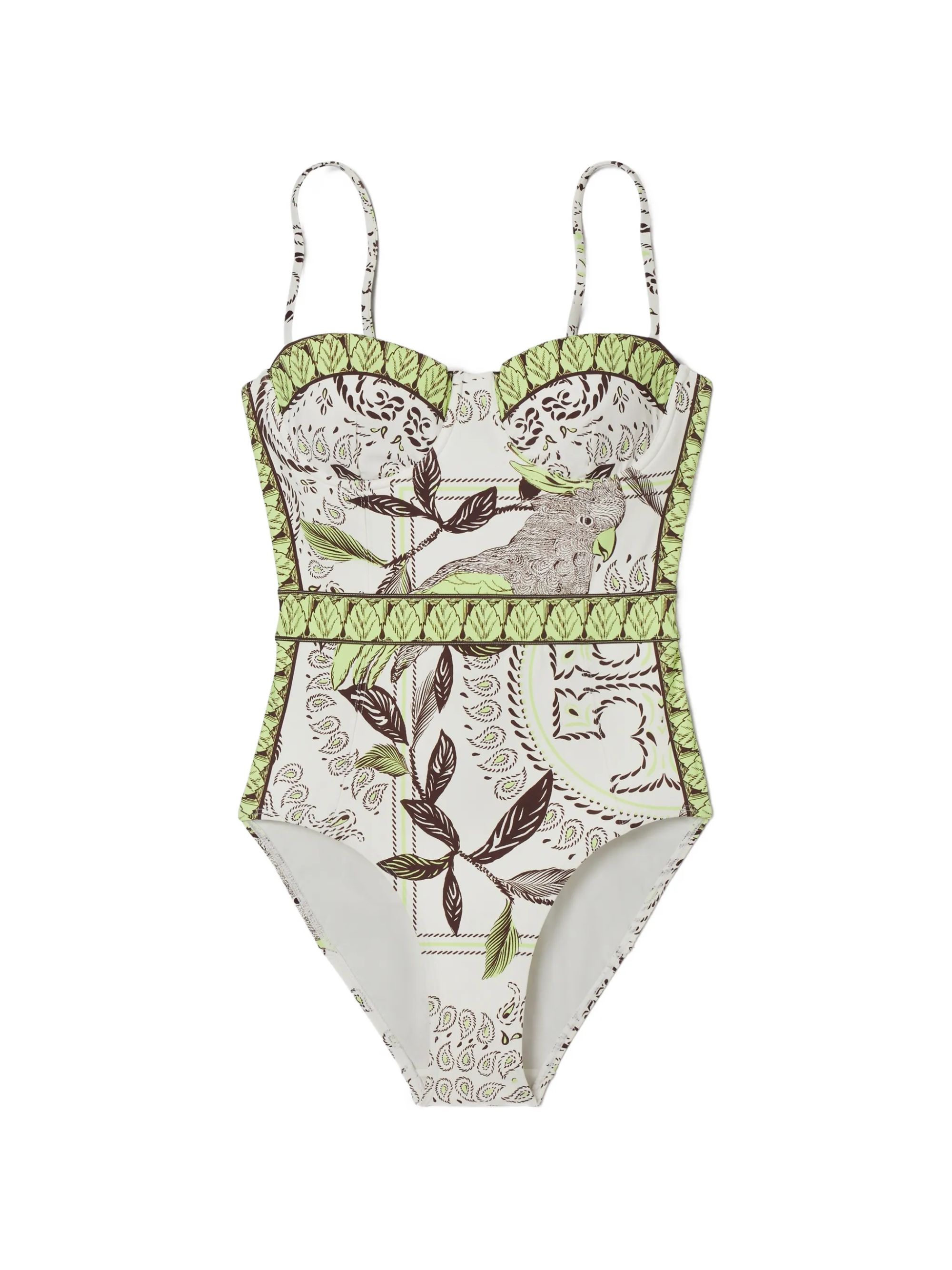 Costume intero con stampa di TORY BURCH muticolor in nylon, caratterizzato da spallacci regolabili, coppe con ferretto, imbottiture rimovibili, stecche laterali flessibili e copertura media della schiena.