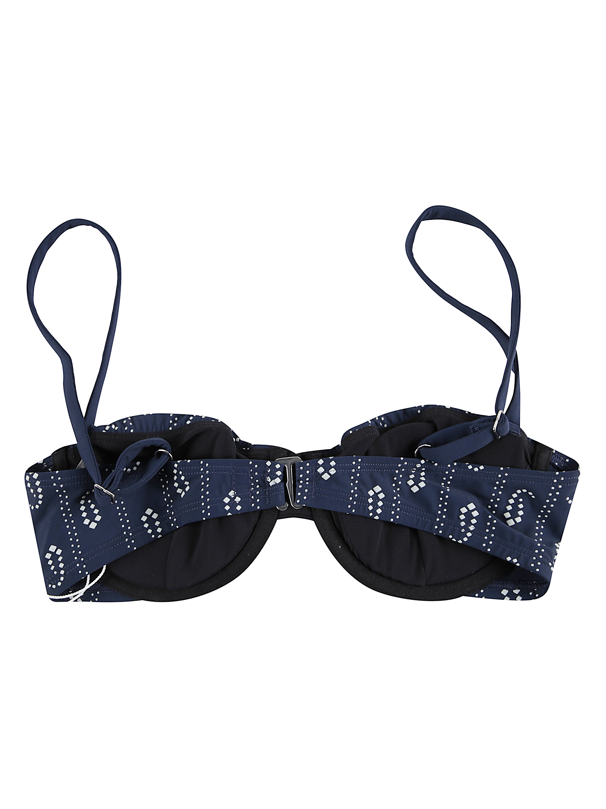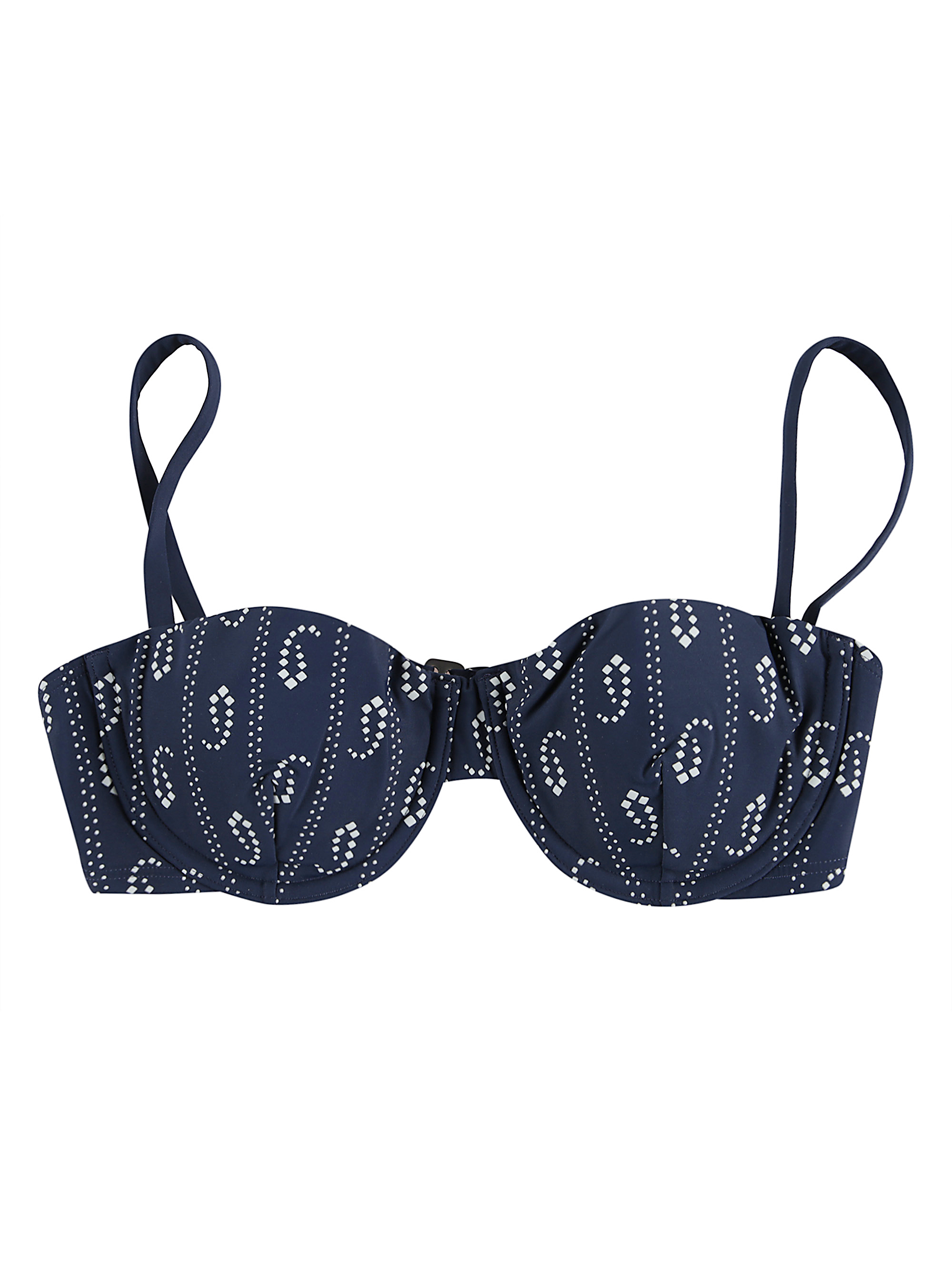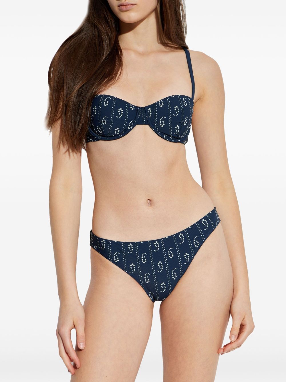 Top bikini stampato di TORY BURCH blu in nylon stretch, caratterizzato da stampa paisley, scollatura a cuore, spalline regolabili sottili e chiusura con gancetto sul retro.