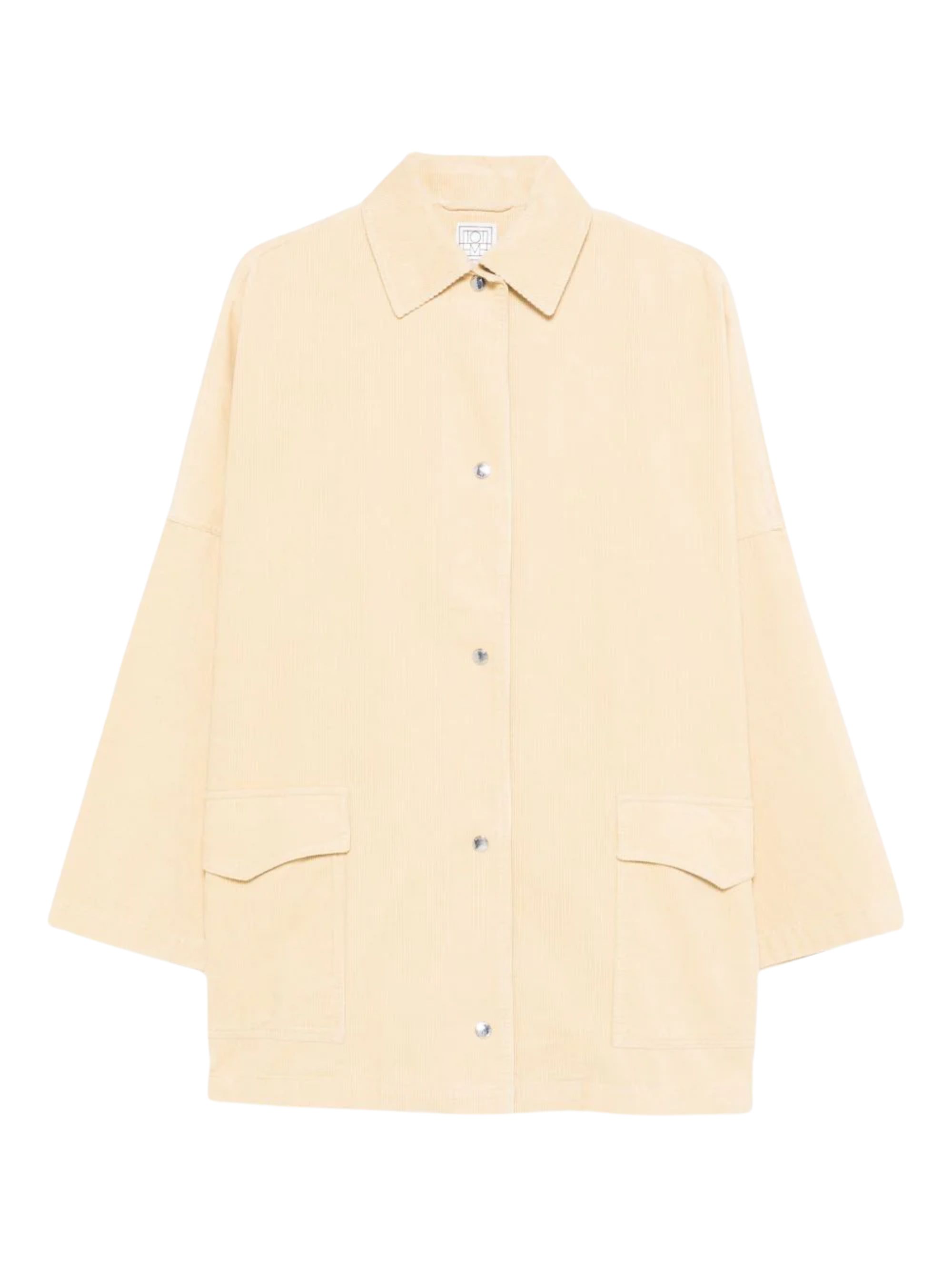 Giacca a costine di TOTEME beige in cotone, caratterizzata da lavorazione a costine, colletto a camicia, maniche ampie lunghe, chiusura frontale con bottoni, tasche applicate, fondo dritto e vestibilità oversize.