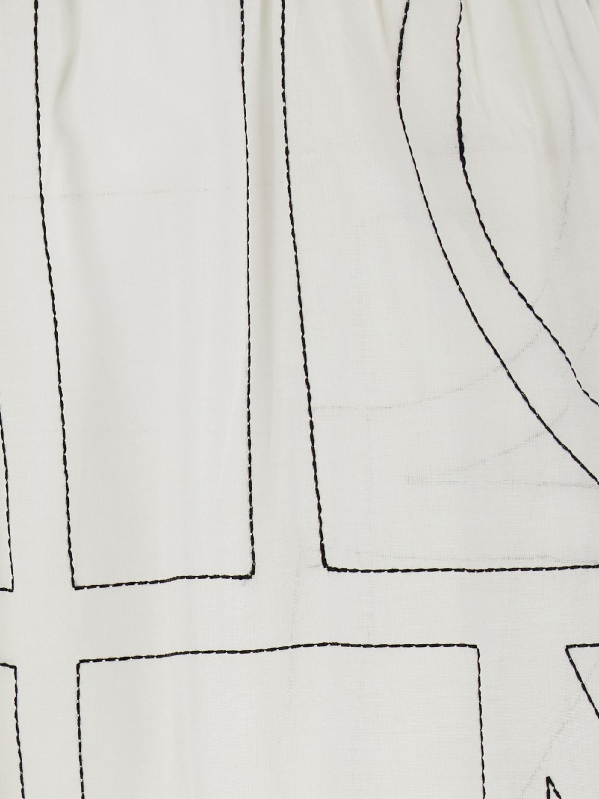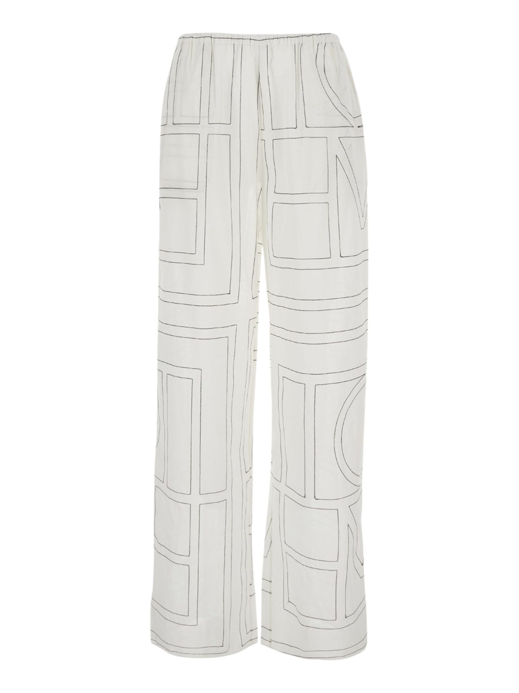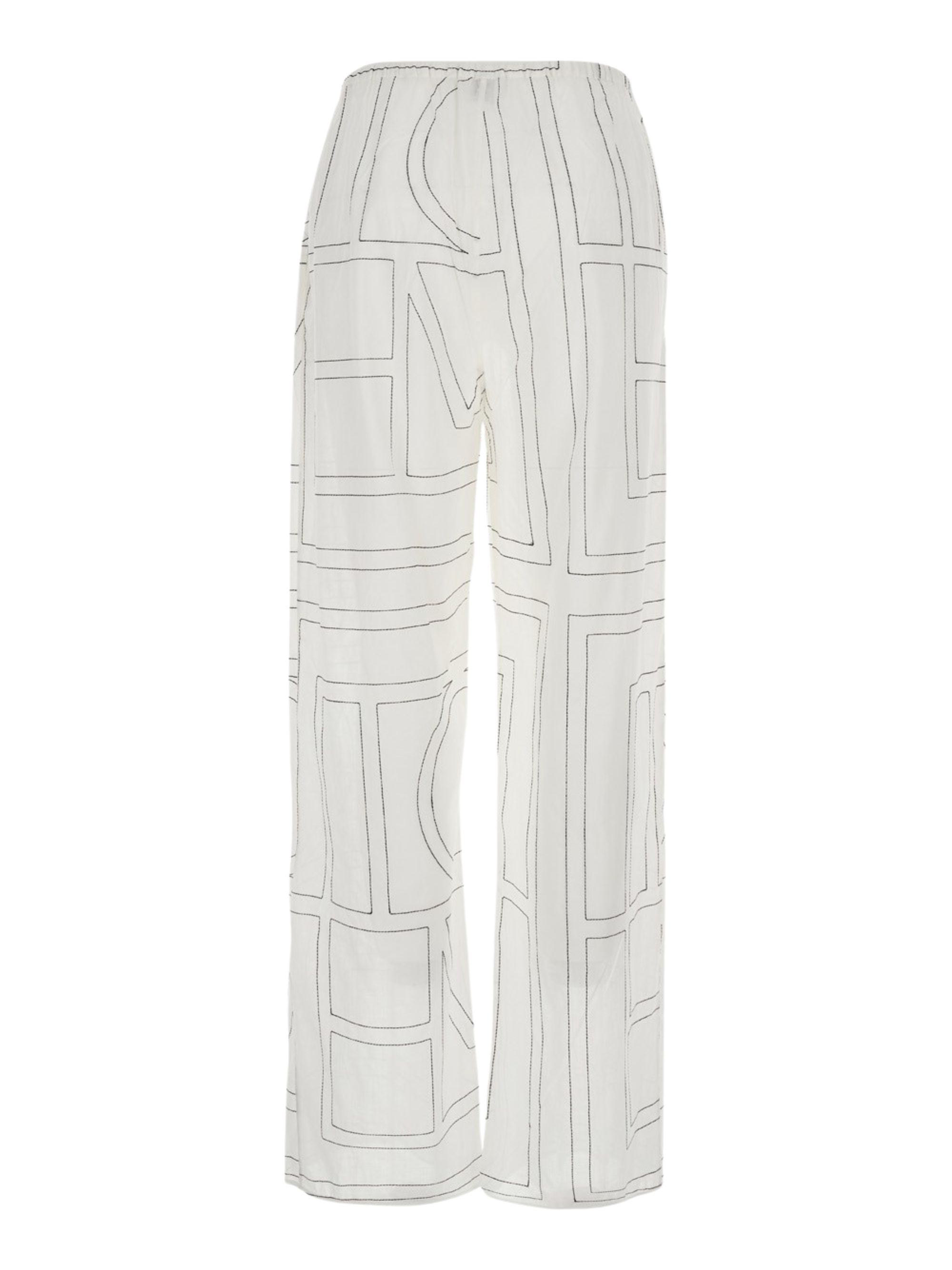 Pantalone pigiama Monogram di TOTEME bianco in cotone e lyocell, caratterizzato da elastico in vita, tasche laterali, logo Monogram all-over, semitrasparente e regular fit.