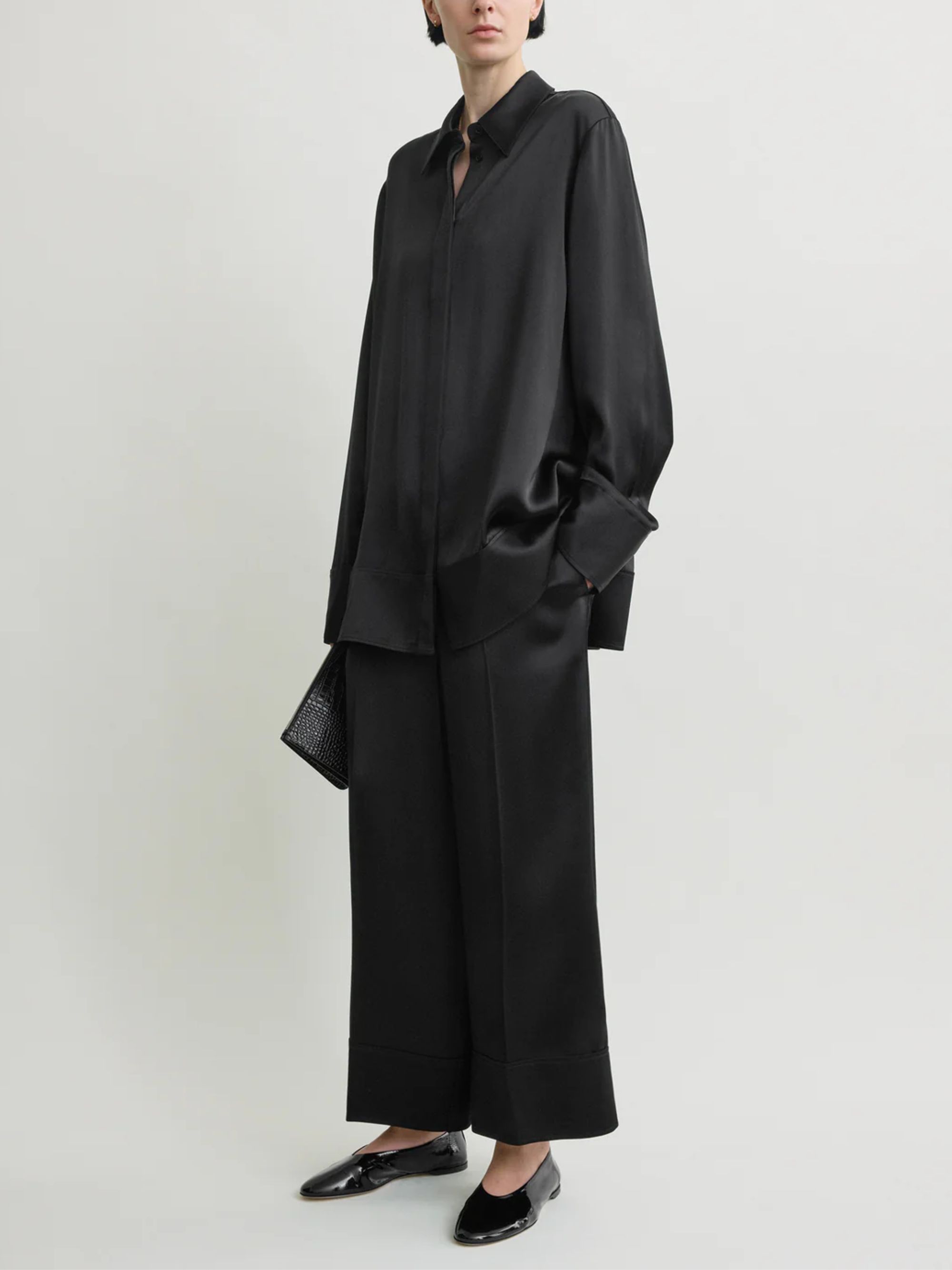 Pantalone satinato di TOTEME nero in viscosa caratterizzato da gamba larga e vita elasticizzata con coulisse in vita.