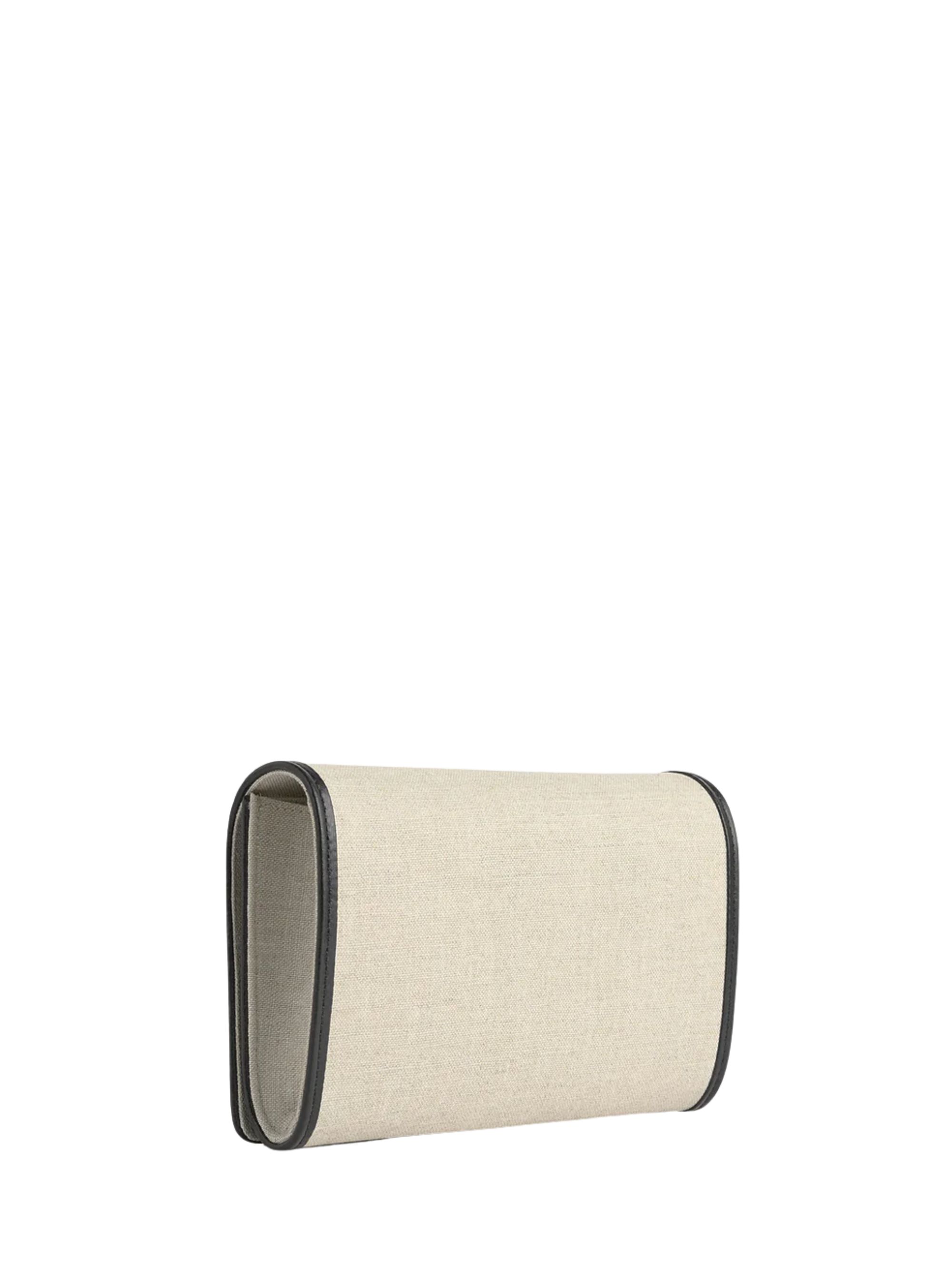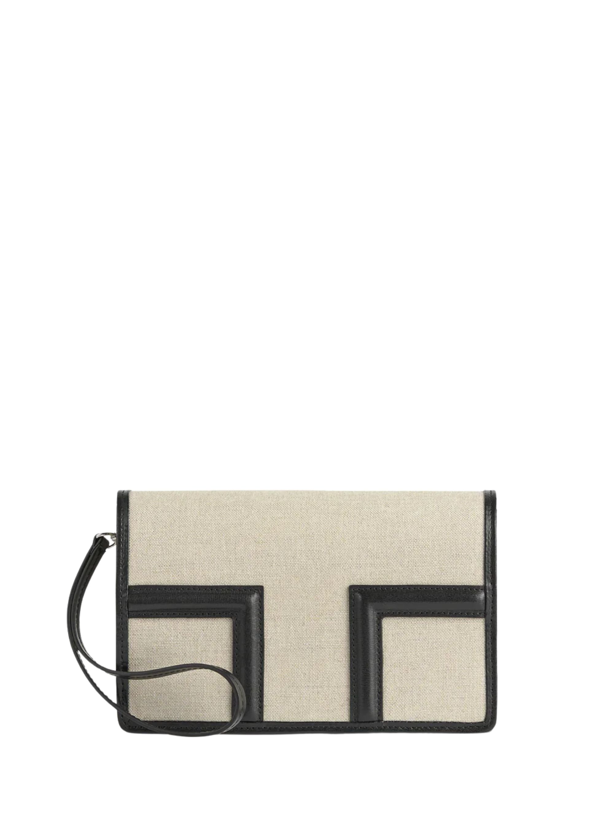 Pochette T-Flap Envelope di TOTEME ecru in tela misto cotone e lino con dettagli in pelle liscia nera a contrasto, cinturino da polso rimovibile e chiusura T-Flap a incastro. Dimensioni: 22x14x5 cm.