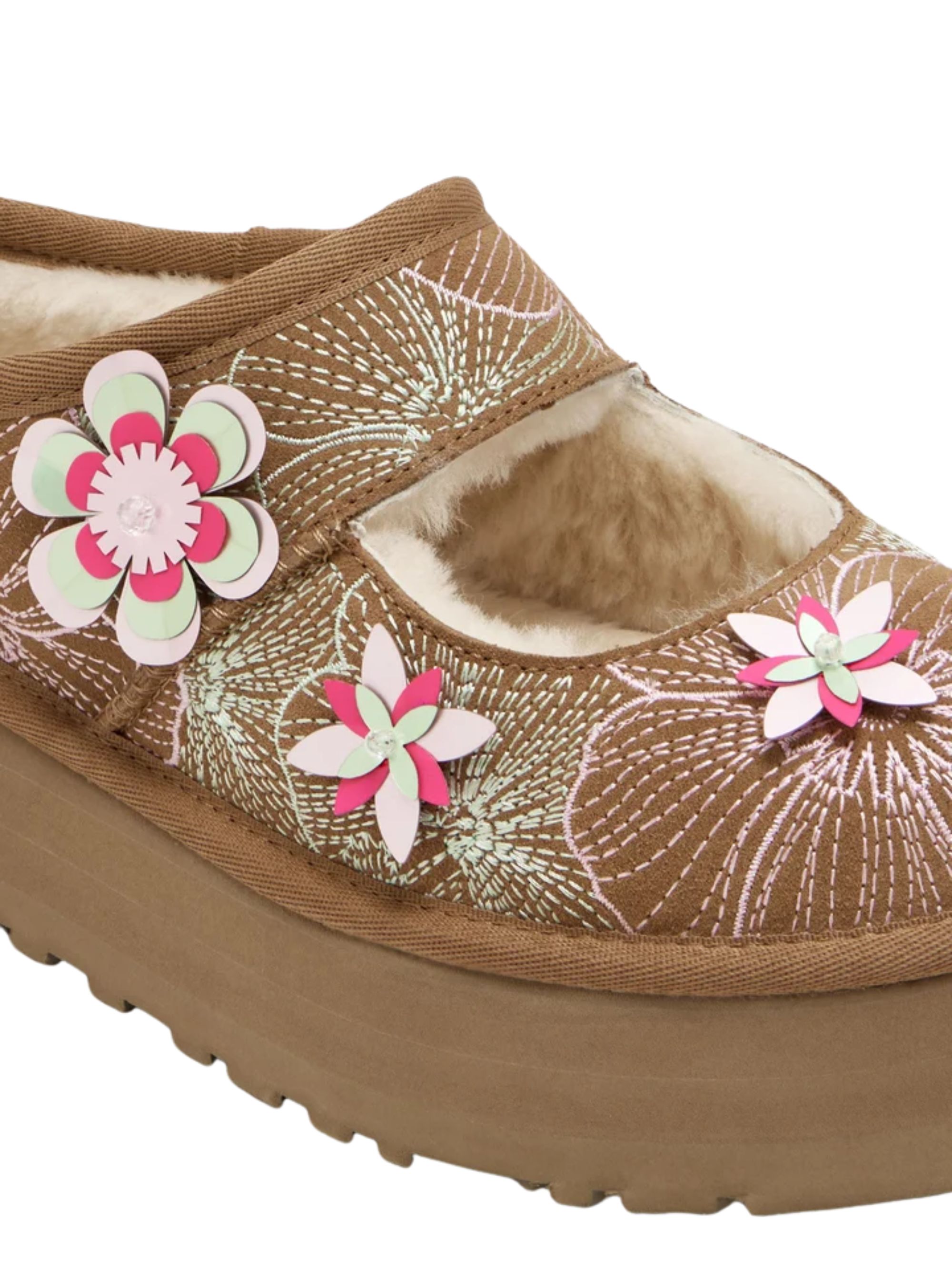 Ballerina Mary Jane Bea Meadow di UGG marrone in pelle scamosciata, caratterizzata da fodera in montone, suola in EVA, logo UGG in rilievo e ricami decorativi con appllicazione 3D.