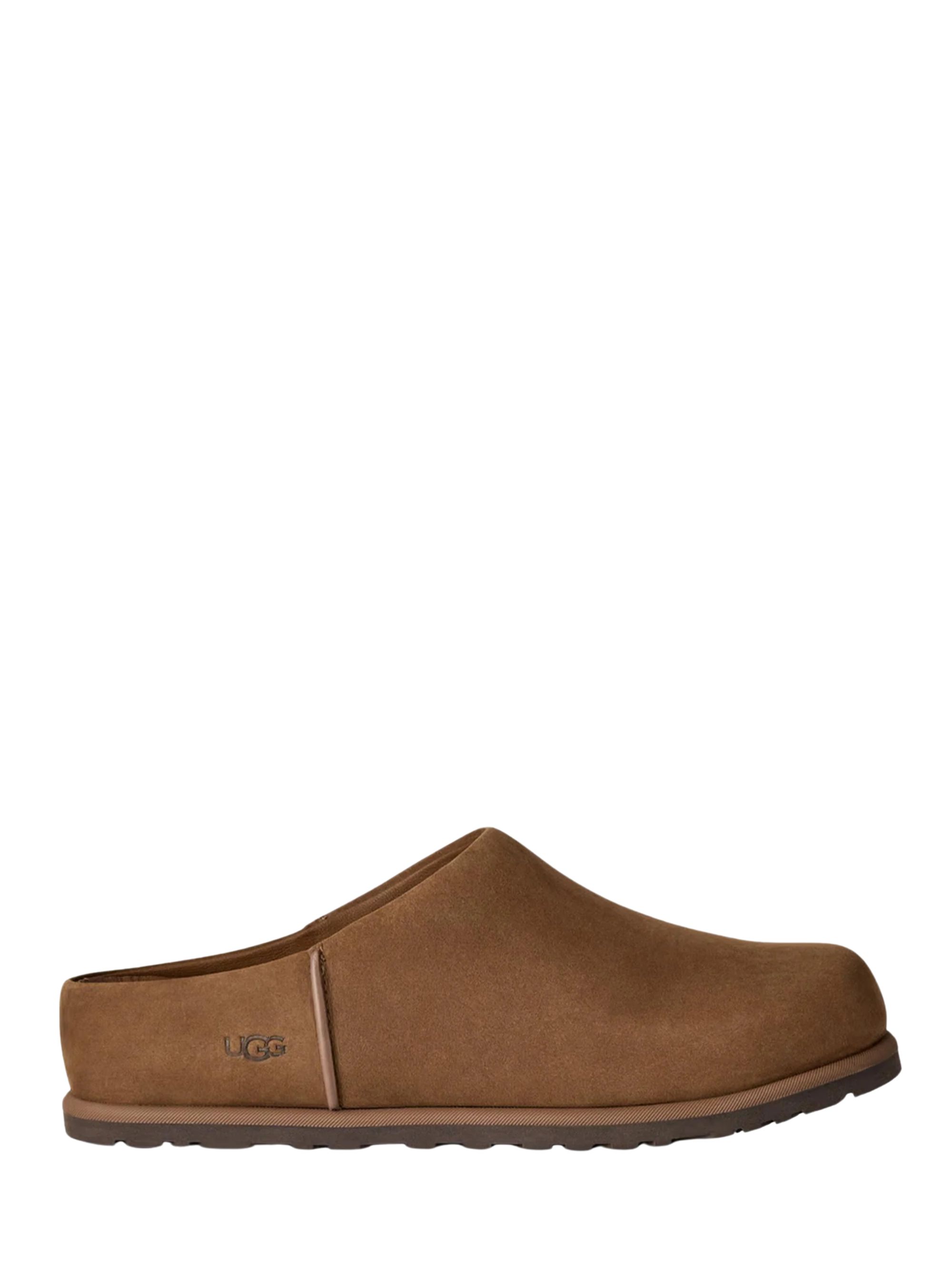 Clog Otzo di UGG marrone in pelle impermeabile, tomaia in nabuk, fodera in jersey di lana, logo in rilievo e suola in gomma.