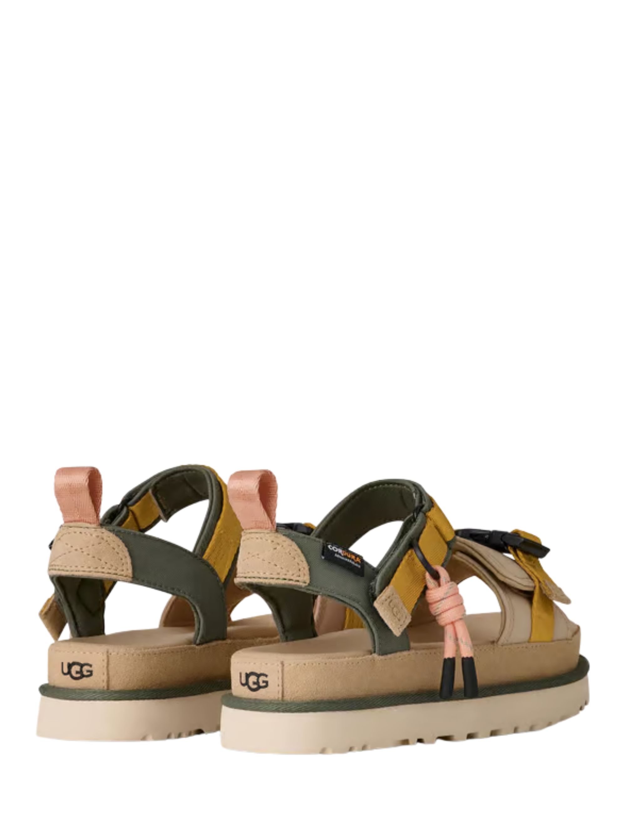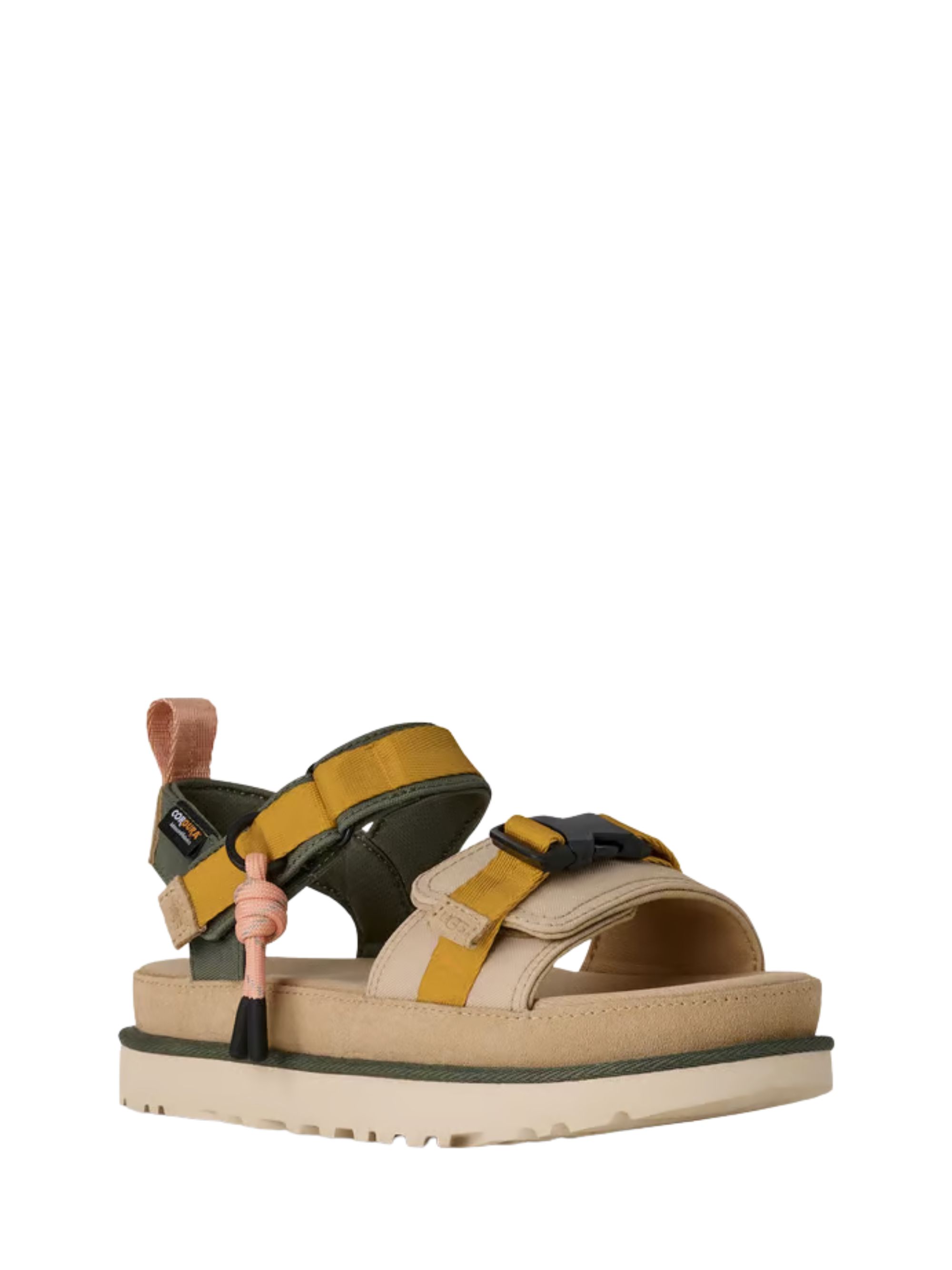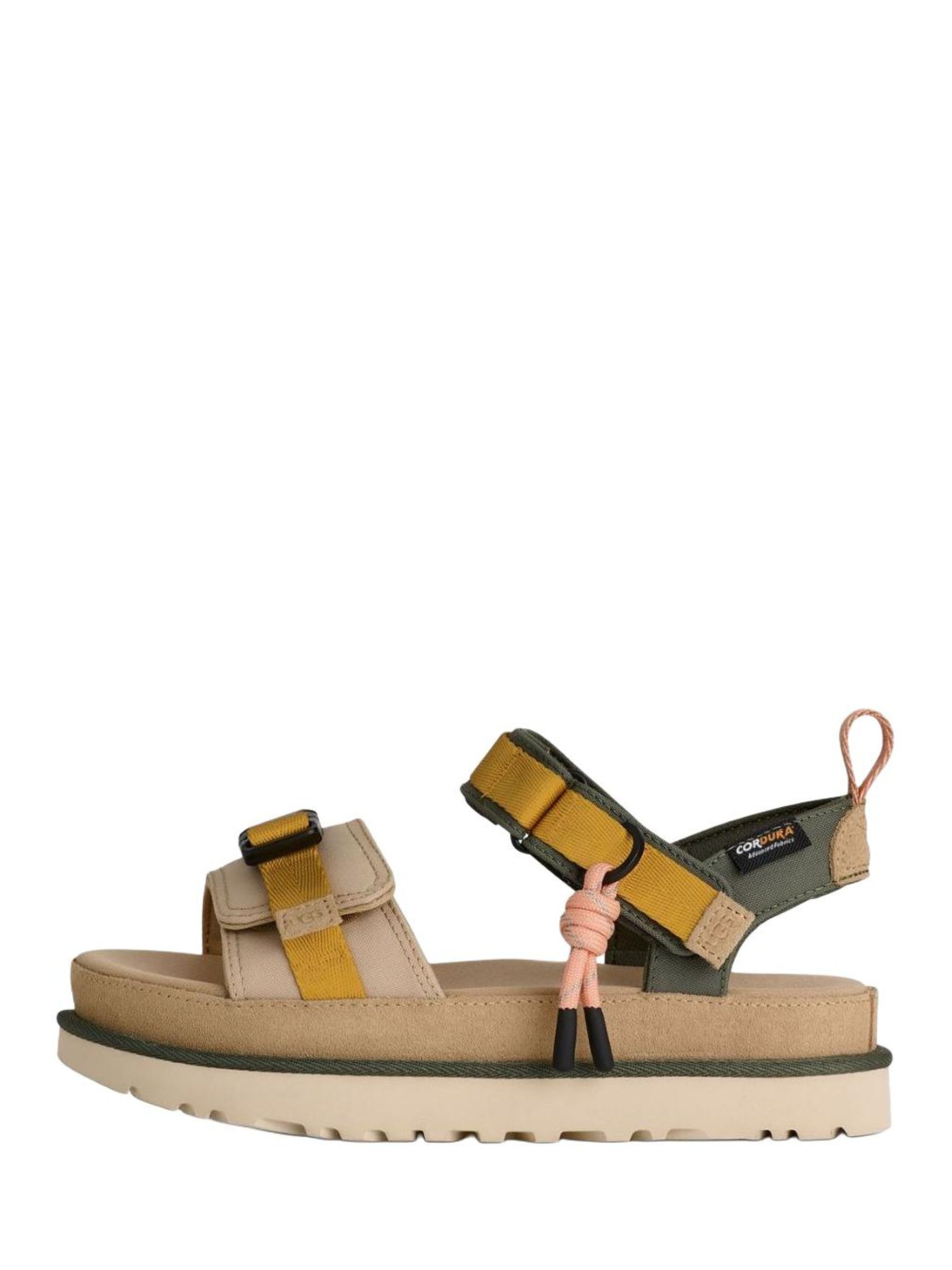 Sandalo Goldenstar Wildwood di UGG multicolor con dettagli in camoscio, etichetta sui cinturini regolabili e suola platform di 5 cm.