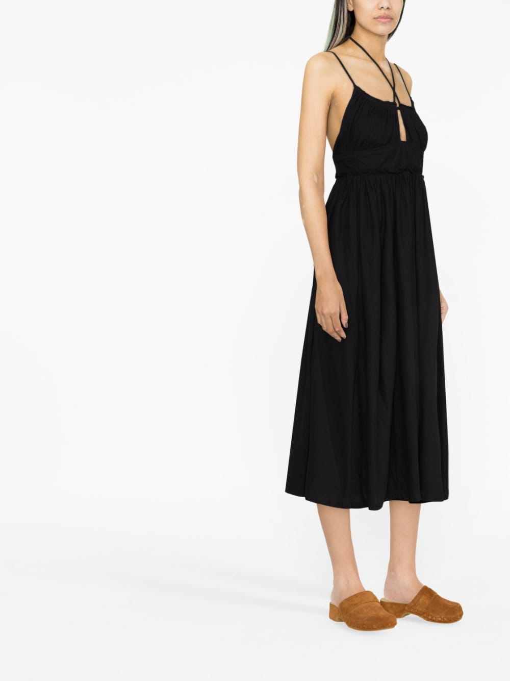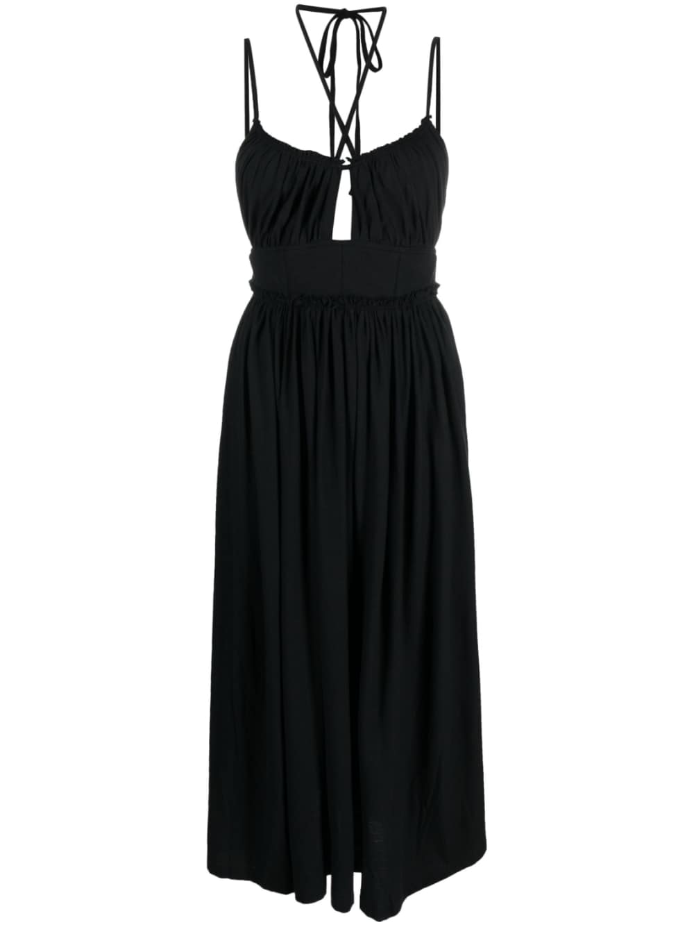 Abito Freya di ULLA JOHNSON colore nero, in cotone, caratterizzato da dettagli cut-out, chiusura frontale con lacci zip, gonna svasata e lunghezza media.
