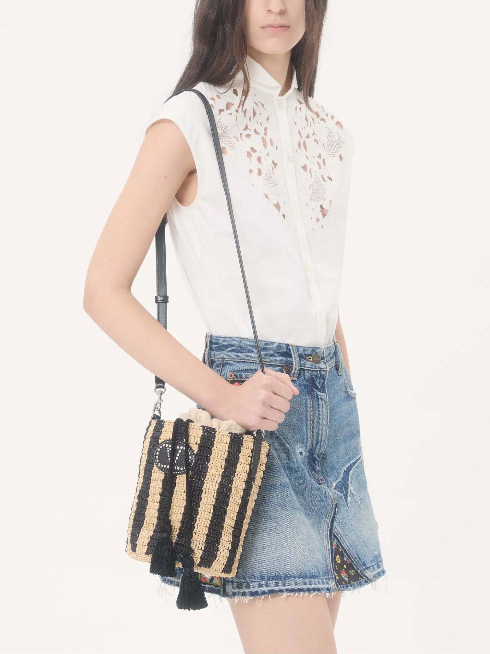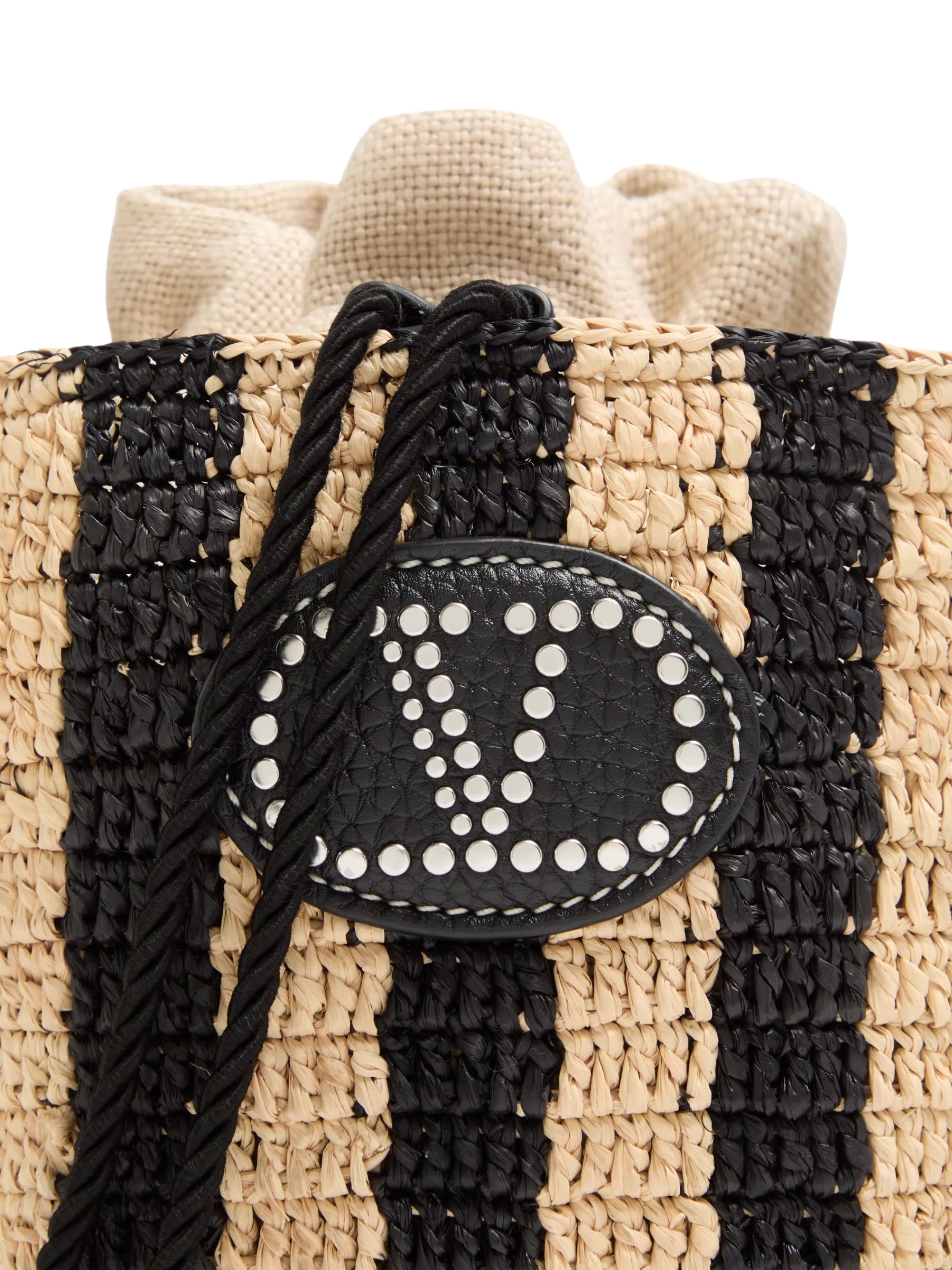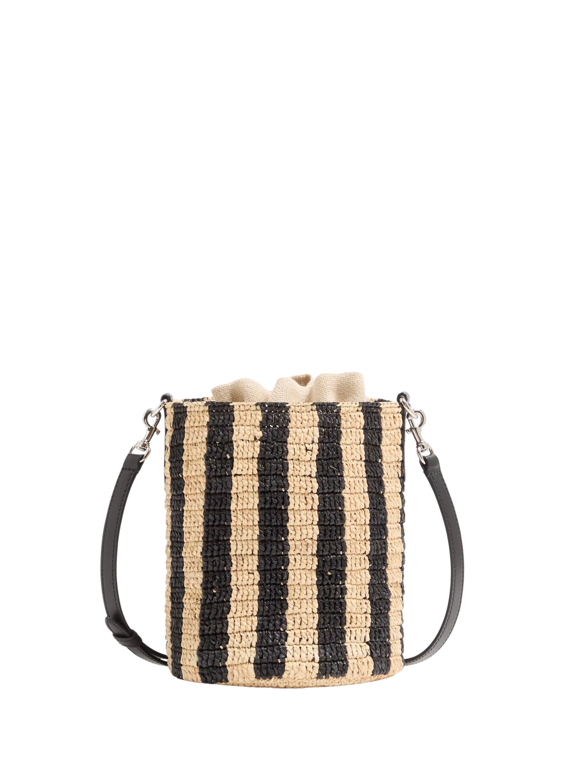 Borsa Bucket di VALENTINO GARAVANI nera e beige in rafia, caratterizzata da motivo a righe, chiusura con coulisse, tracolla regolabile e rimovibile e logo. Dimensioni: 15,5 x 19 x 15,5 CM.