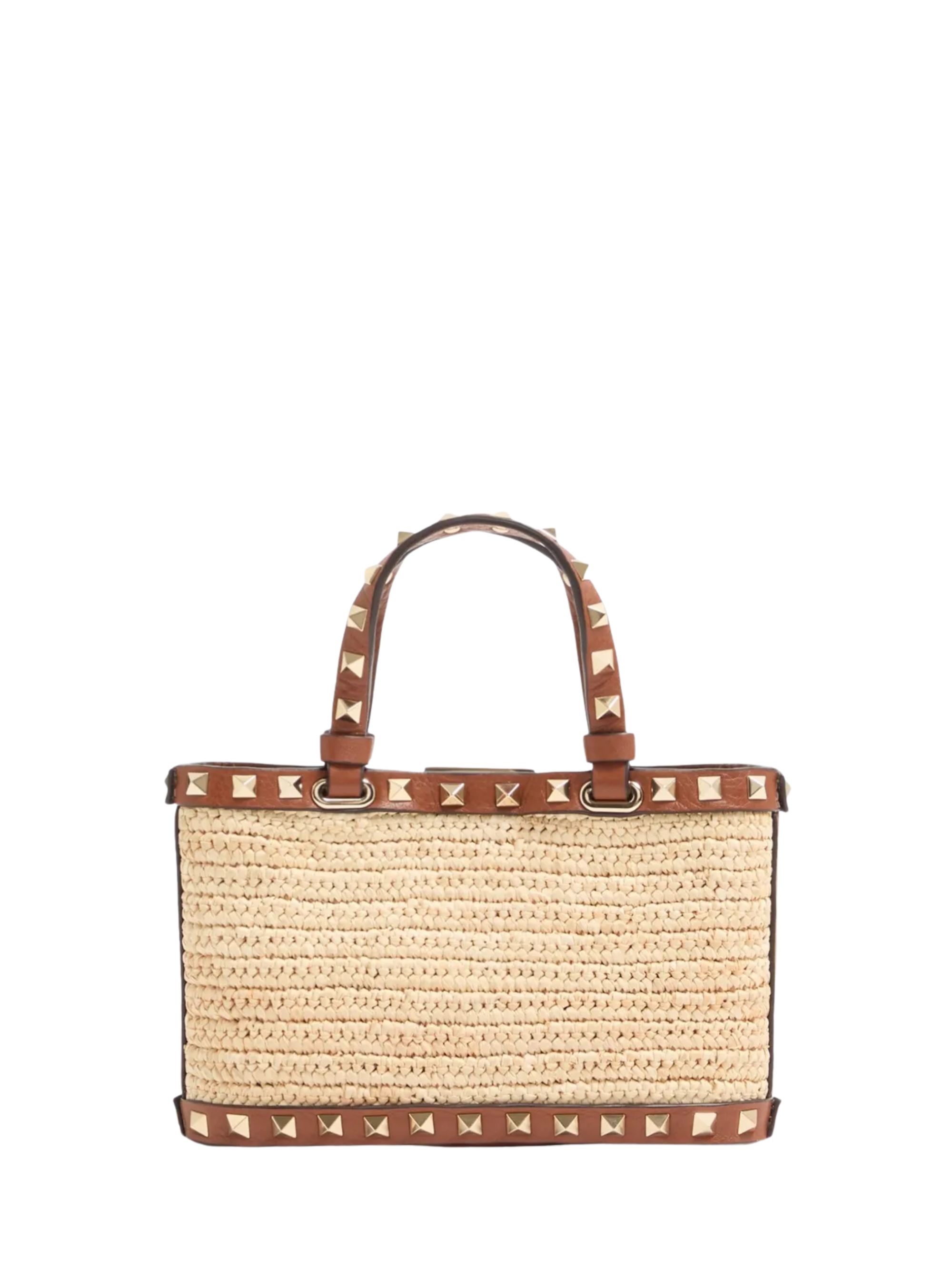 Borsa Rockstud mini di VALENTINO GARAVANI beige in rafia e pelle, caratterizzata da tracolla a catena dorata rimovibile, borchie, manici in pelle, hardware oro e fodera in tela. Dimensioni: 20 x 11,5 x 4,5 CM.