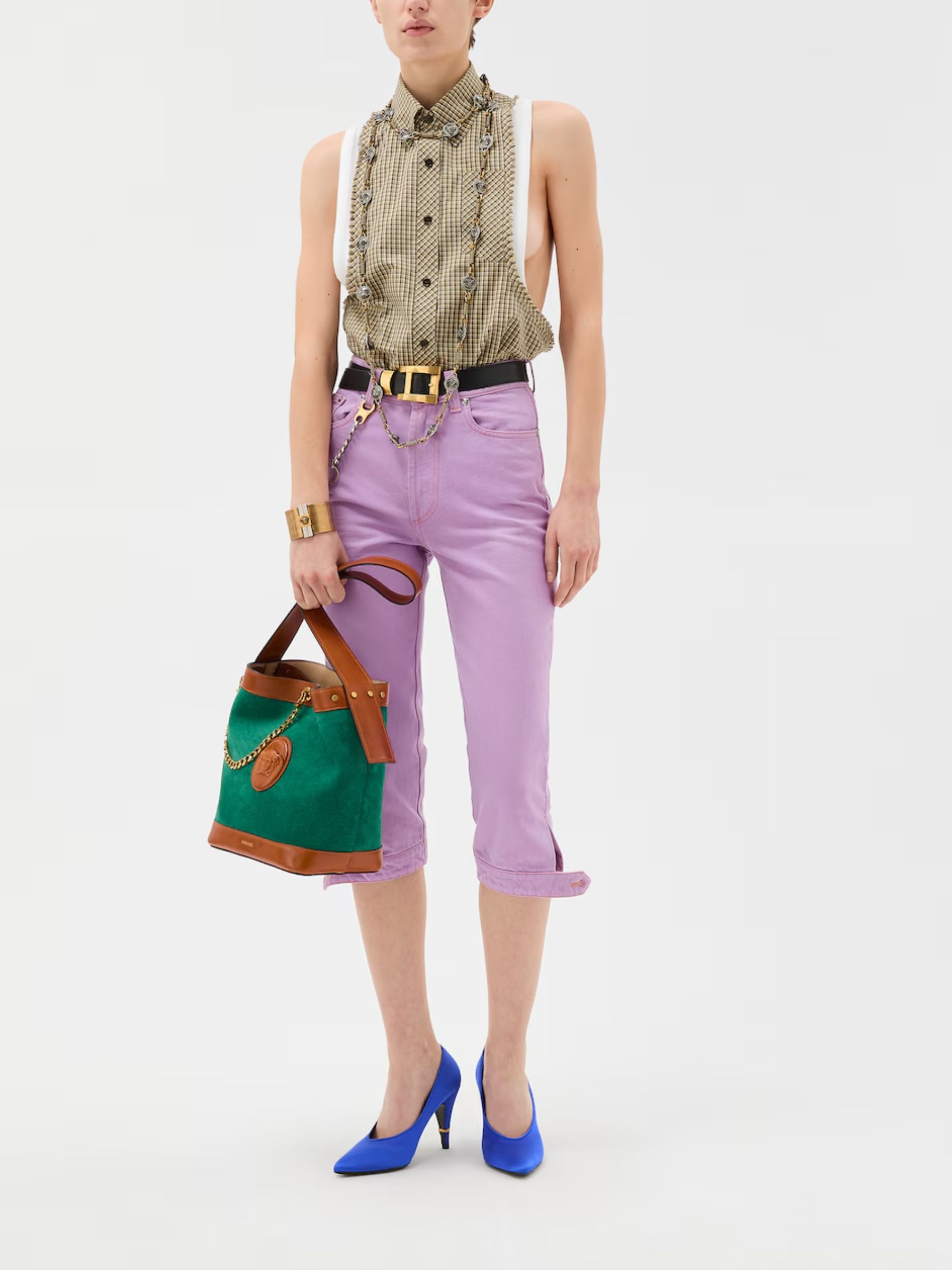 Jeans Capri di VERSACE lilla in cotone, caratterizzato da etichetta posteriore in pelle, accessorio Medusa, passanti per cintura, design a cinque tasche e chiusura con zip e bottone.