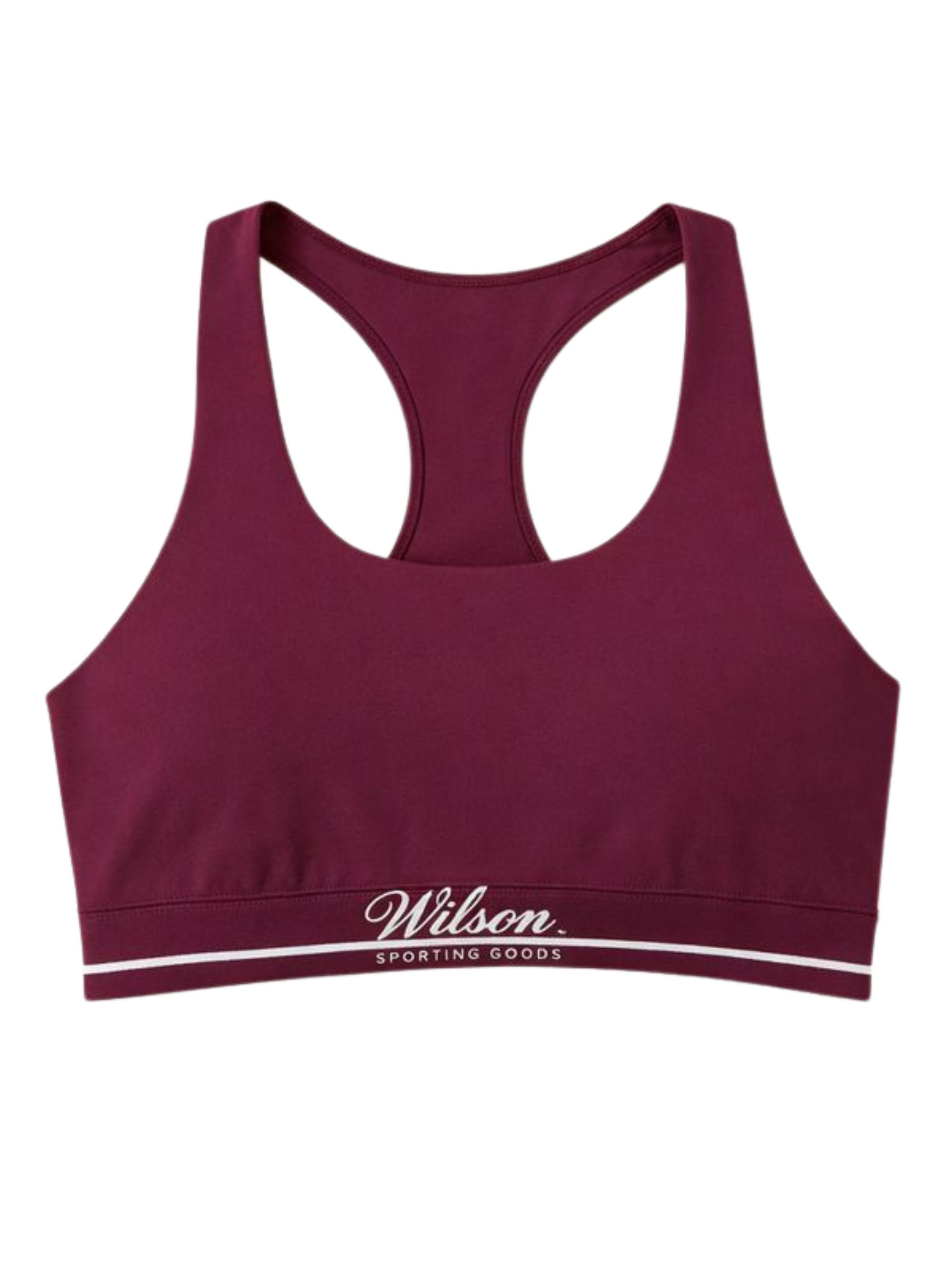 Reggiseno Racerback Doubles di WILSON bordeaux, caratterizzato da taglio all'americana, apertura sulla schiena, logo frontale e spalline a fascia.