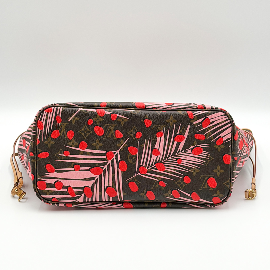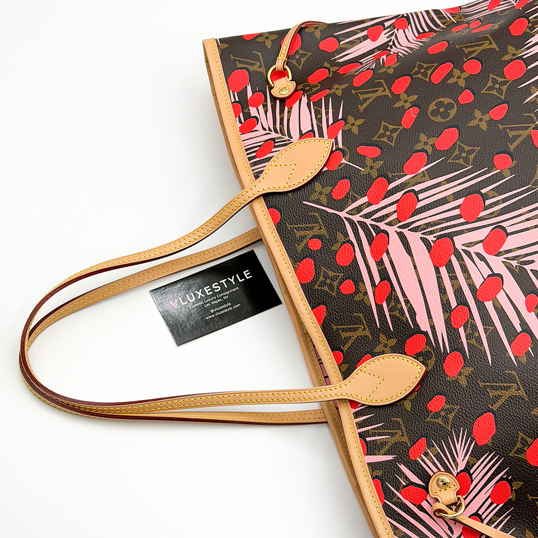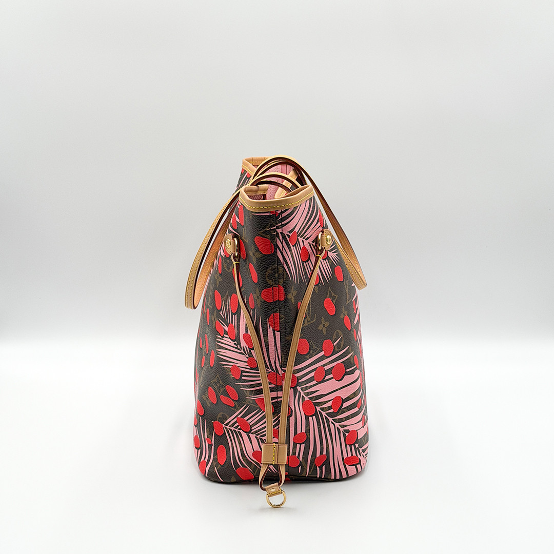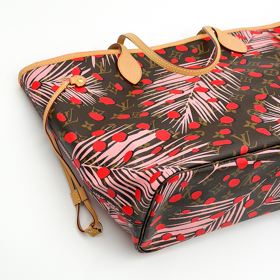 This Limited Edition Louis Vuitton Neverfull Tote MM in Jungle Dots Monogram from the exclusive Cruise 2016 collectsion designed by Nicolas Ghesquière is more than just a tote—it's a statement piece. Crafted of monogram canvas adorned with vibrant jungle dot prints and pink palm trees. This tote bag seamlessly combines timeless elegance with a fresh, contemporary twist. It features polished brass hardware and trims that accentuate its modern design.