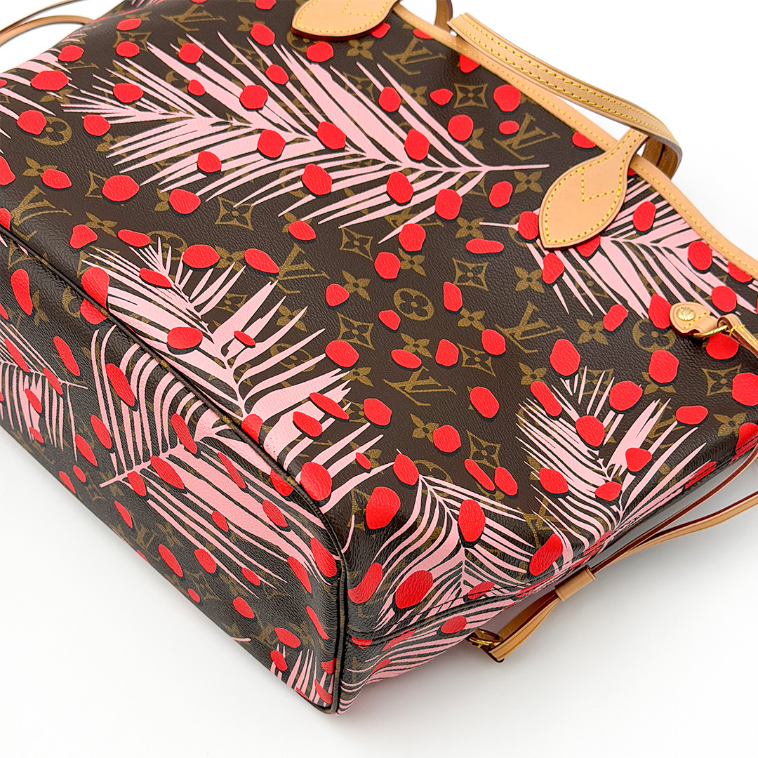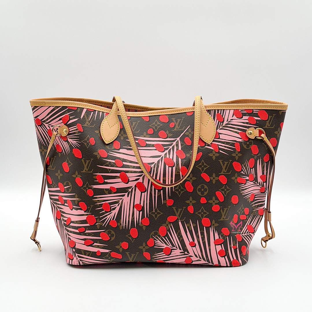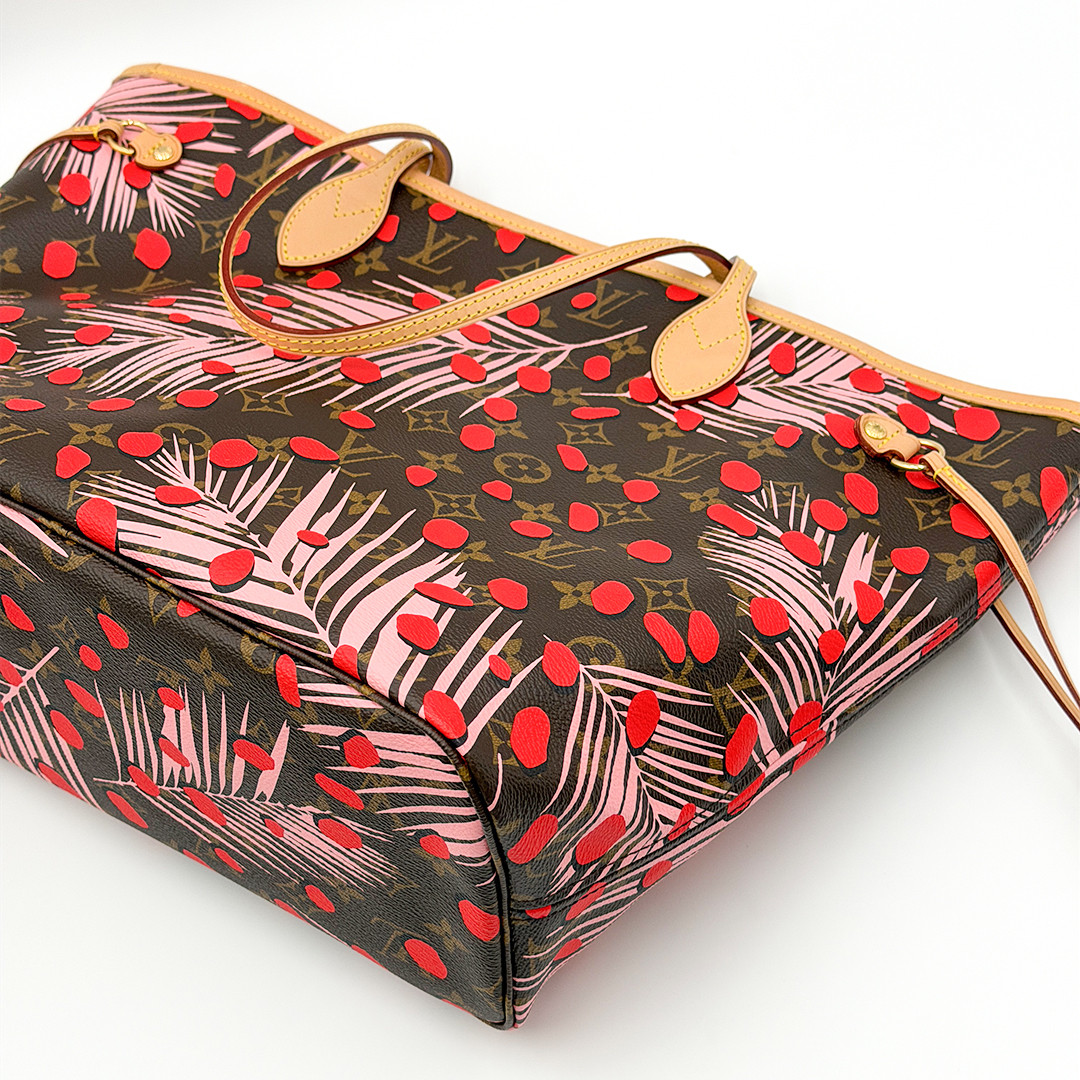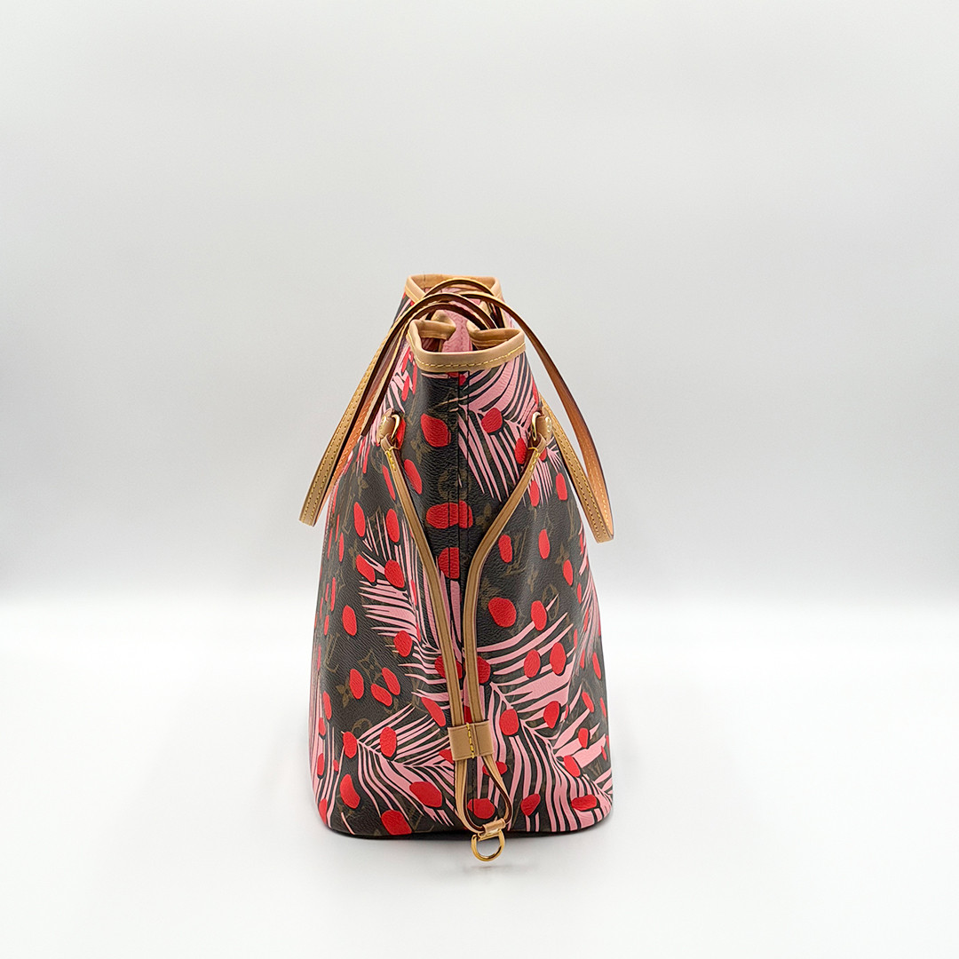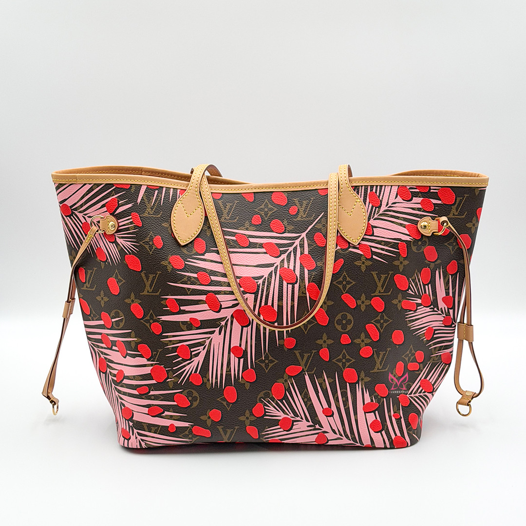 This Limited Edition Louis Vuitton Neverfull Tote MM in Jungle Dots Monogram from the exclusive Cruise 2016 collectsion designed by Nicolas Ghesquière is more than just a tote—it's a statement piece. Crafted of monogram canvas adorned with vibrant jungle dot prints and pink palm trees. This tote bag seamlessly combines timeless elegance with a fresh, contemporary twist. It features polished brass hardware and trims that accentuate its modern design.