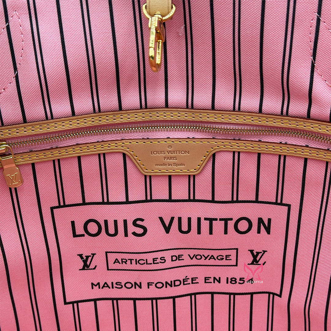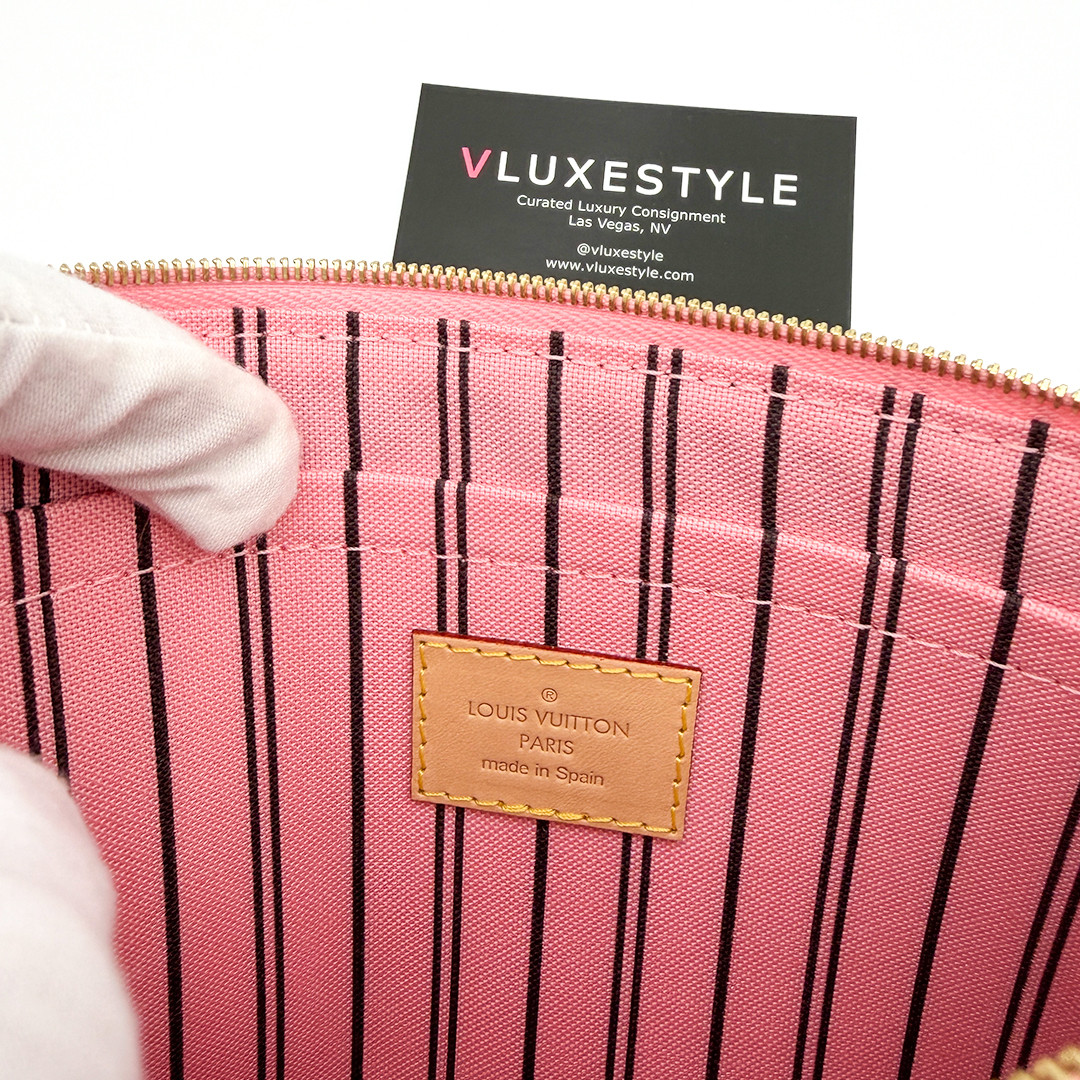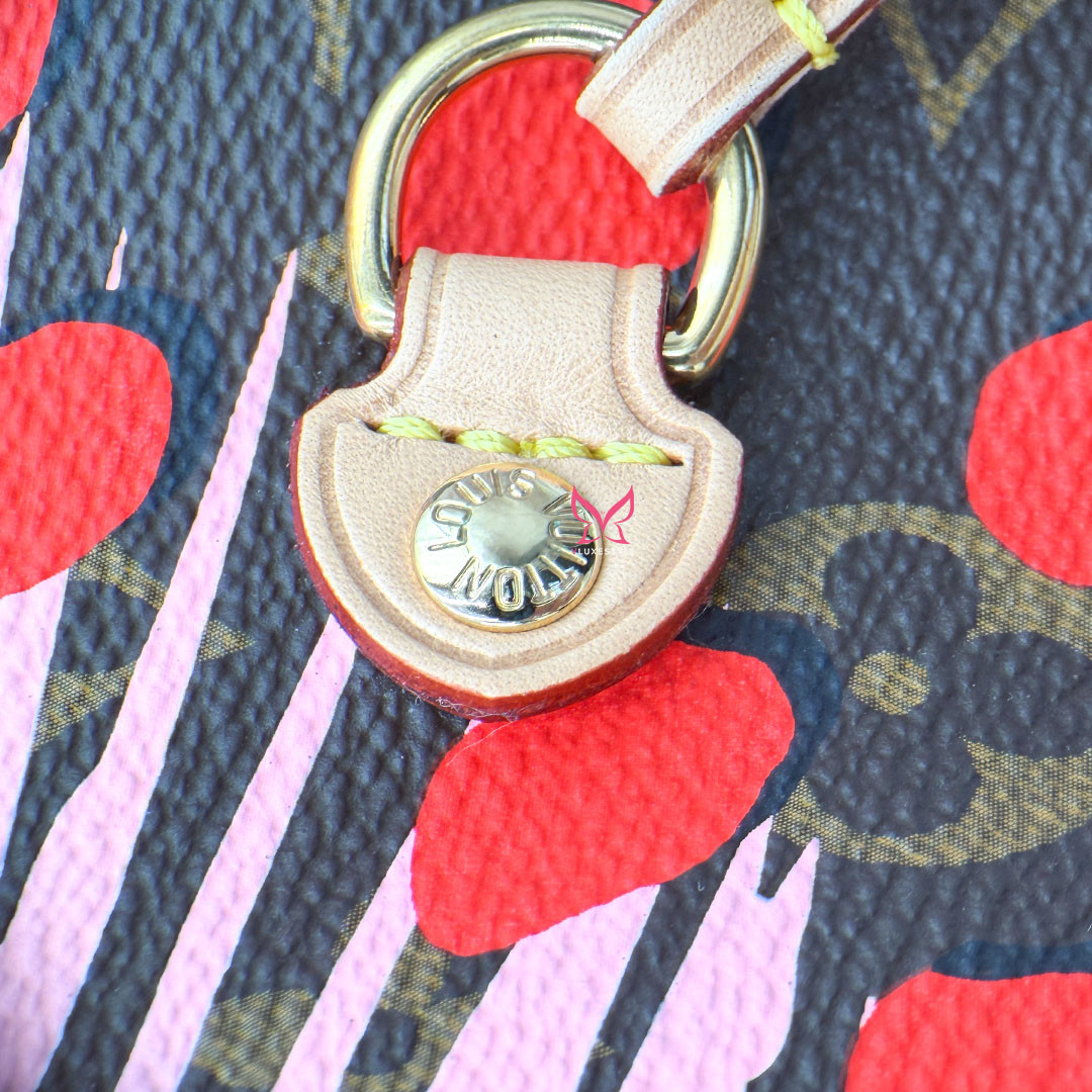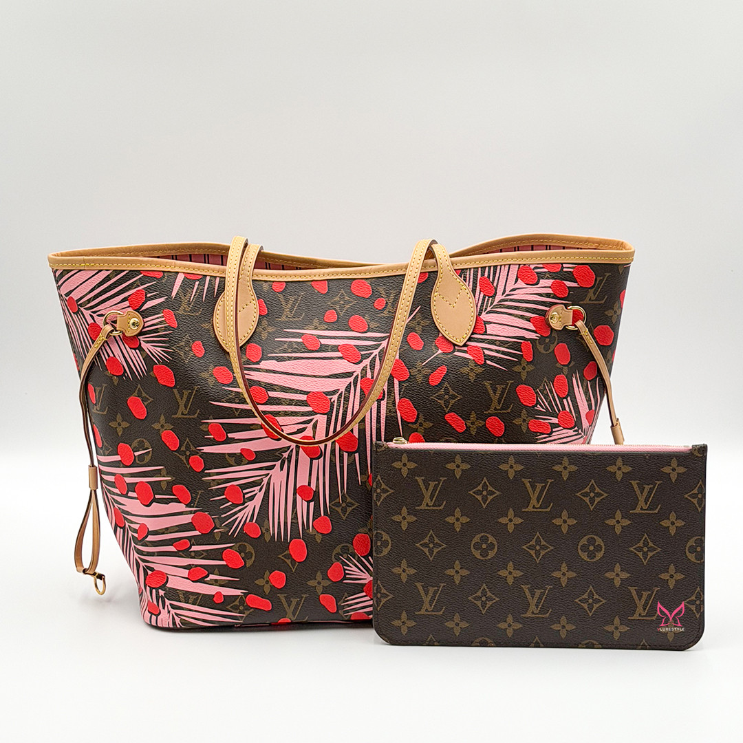 This Limited Edition Louis Vuitton Neverfull Tote MM in Jungle Dots Monogram from the exclusive Cruise 2016 collectsion designed by Nicolas Ghesquière is more than just a tote—it's a statement piece. Crafted of monogram canvas adorned with vibrant jungle dot prints and pink palm trees. This tote bag seamlessly combines timeless elegance with a fresh, contemporary twist. It features polished brass hardware and trims that accentuate its modern design.