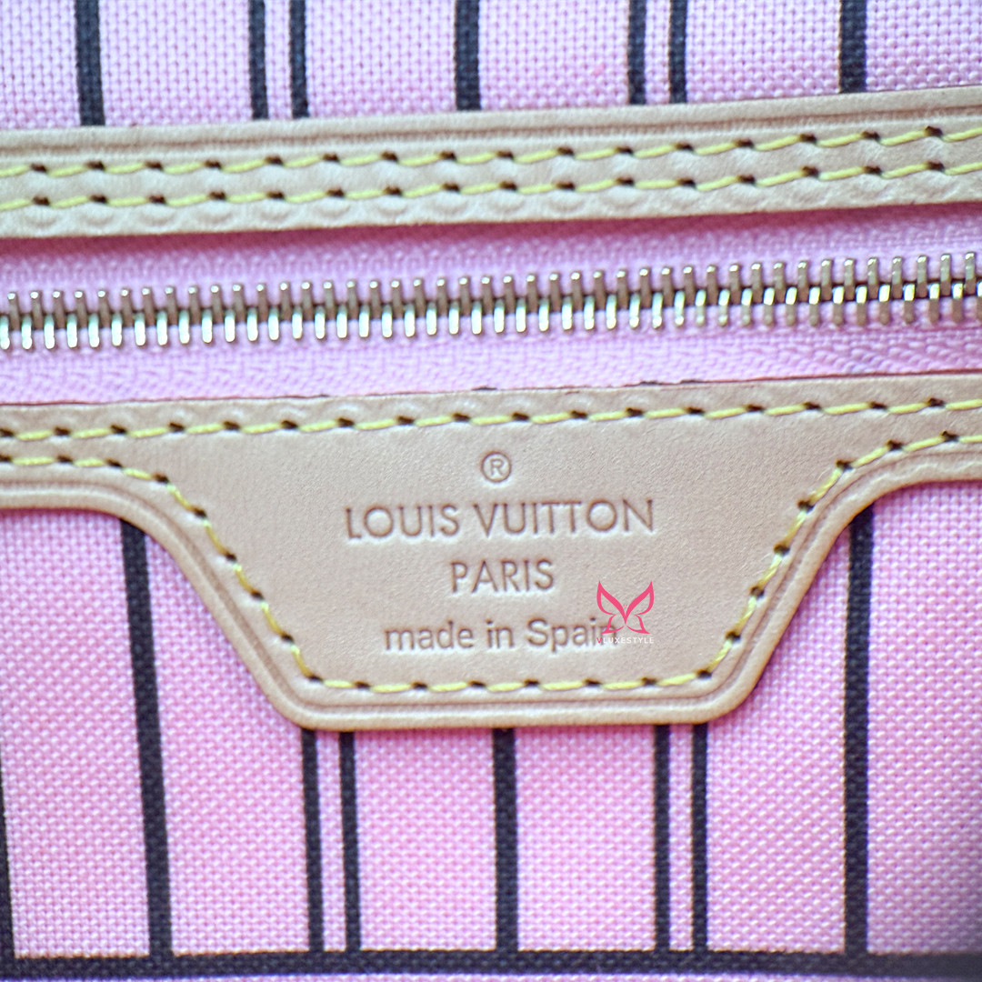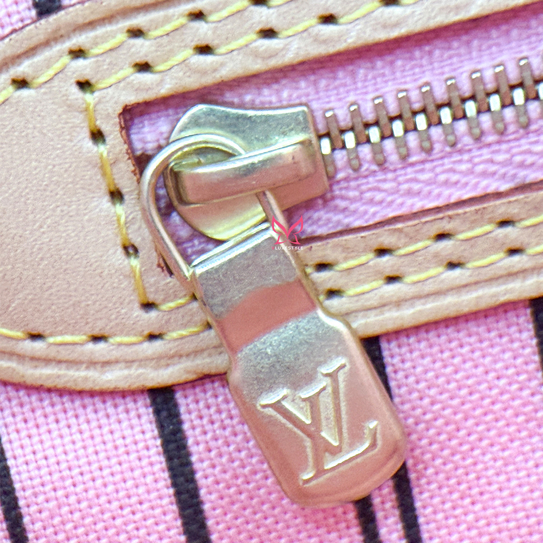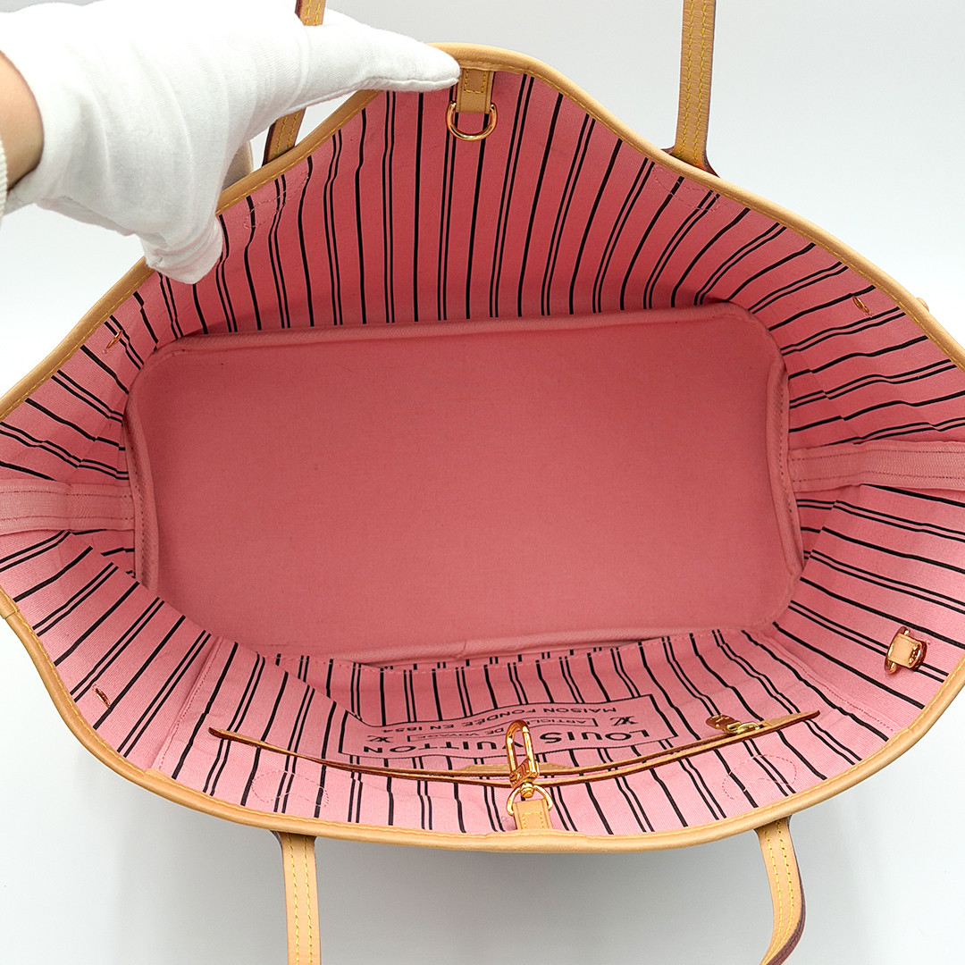 This authentic Louis Vuitton Neverfull tote features a spacious interior complete with a zipper pocket and a D-ring for optimal organization. Side cinch cords allow for adjustable capacity, while a hook clasp closure provides added security. Perfect for everyday elegance, this bag effortlessly combines style with functionality.