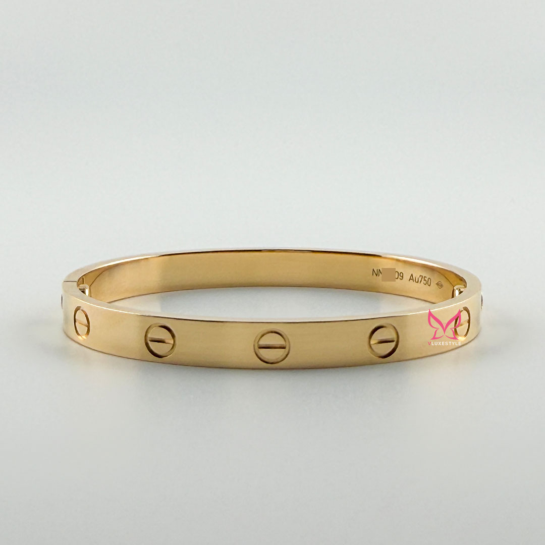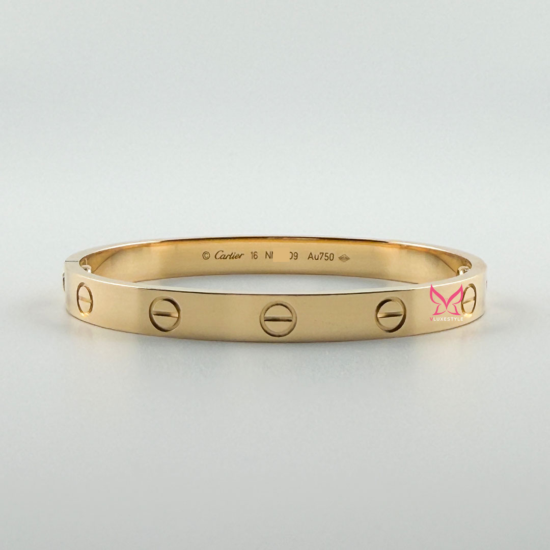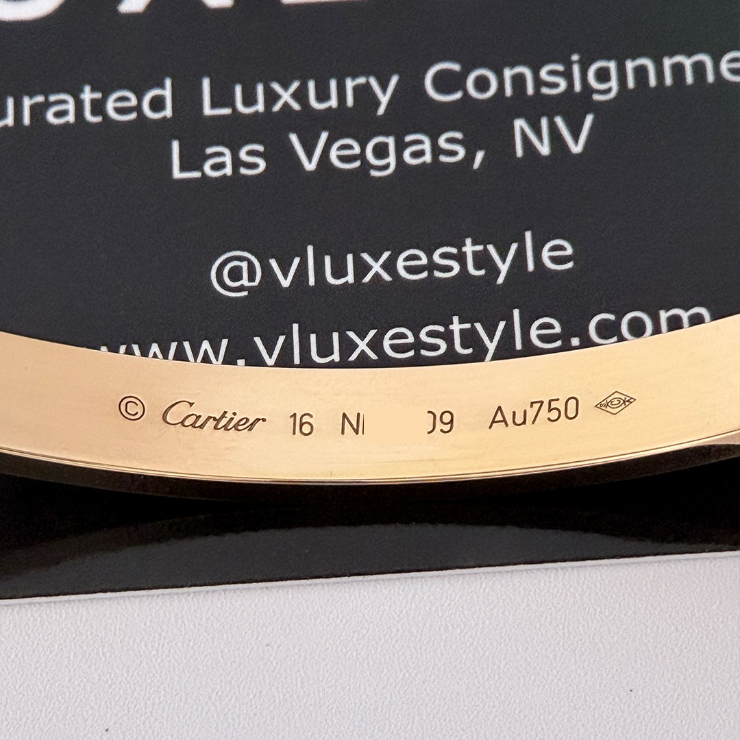 Designed with an oval shape, the bracelet ensures a close and comfortable fit. Whether worn solo or styled with complementary pieces, this authentic Cartier Love Bracelet makes a statement of sophistication and luxury in any ensemble.