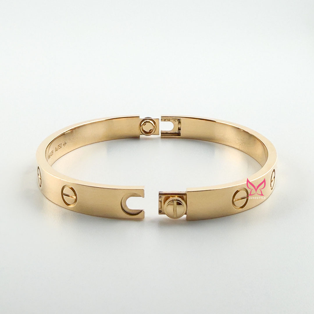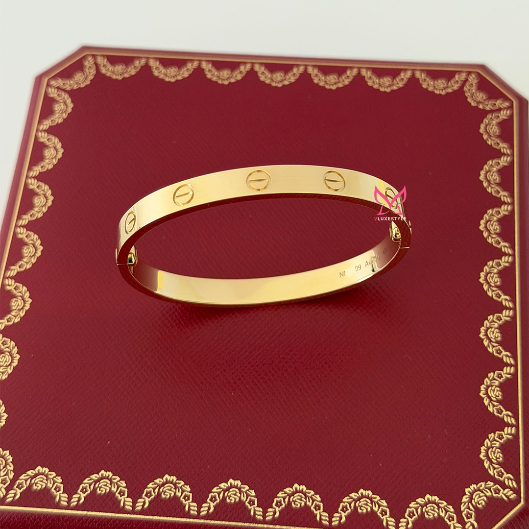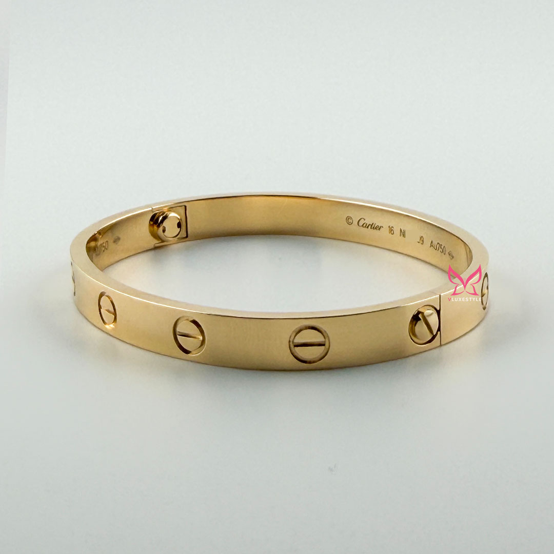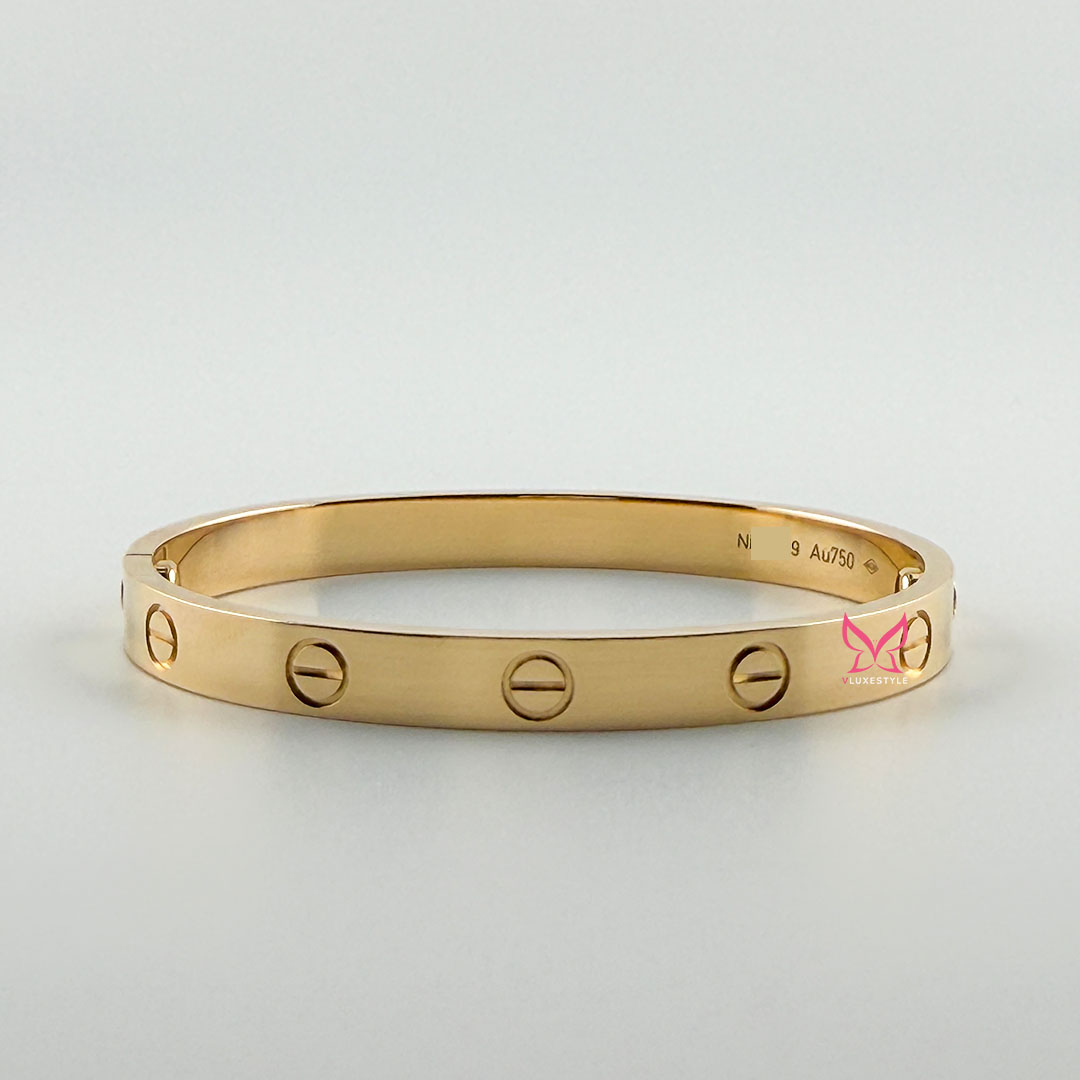 Designed with an oval shape, the bracelet ensures a close and comfortable fit. Whether worn solo or styled with complementary pieces, this authentic Cartier Love Bracelet makes a statement of sophistication and luxury in any ensemble.