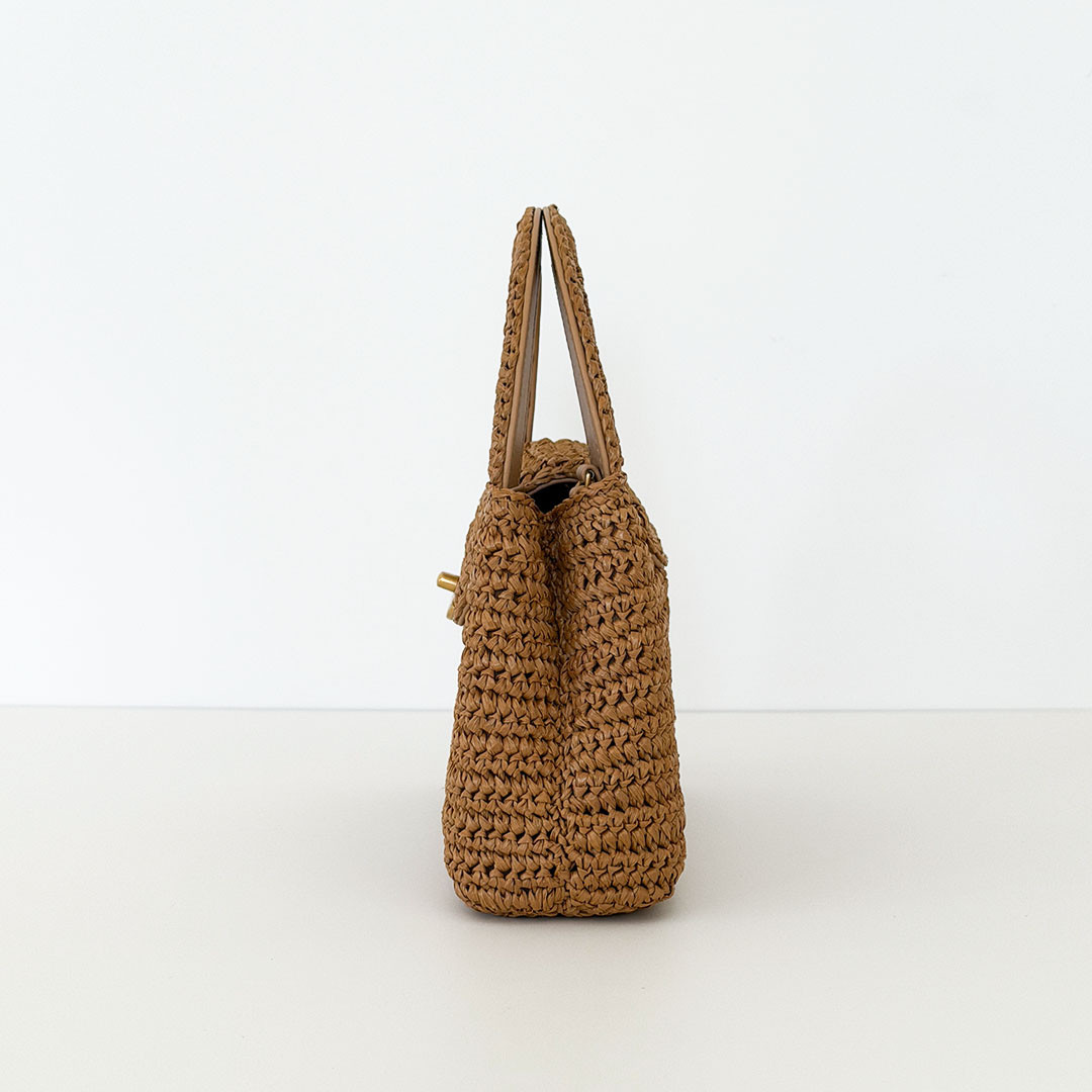 The CHANEL Mini Kelly Raffia Bag is the perfect blend of elegance and versatility –a standout from the CHANEL 26C Cruise Collection. Crafted from braided raffia adorned with brushed gold hardware. It features a trapezoidal shape, curved handles with tab closure, and the iconic CC turn-lock. It features a leather lining and is spacious enough for your essentials, including an iPhone Pro Max.