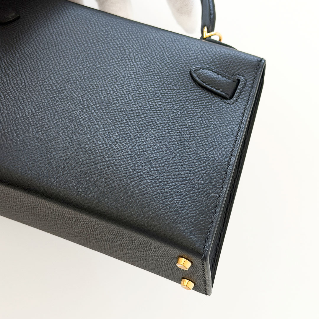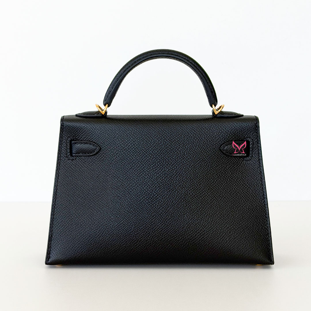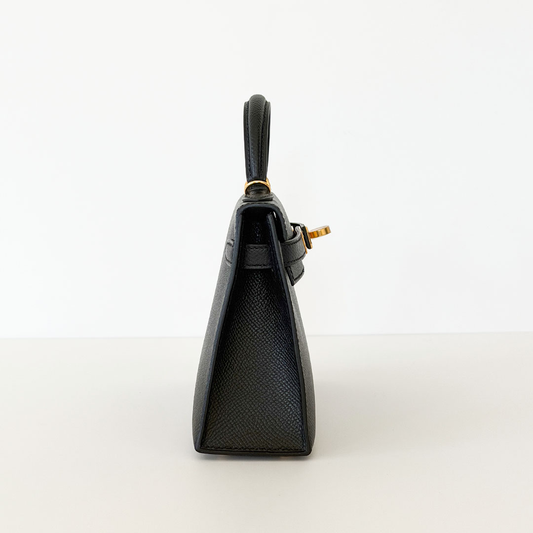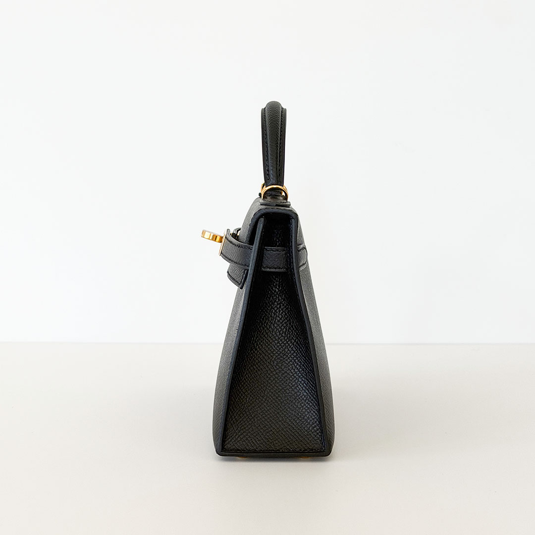 The Hermès Mini Kelly Sellier 20 in Black Epsom with Gold Hardware is the epitome of elegance and luxury. This iconic Hermès bag, crafted from black Epsom calfskin leather, is the perfect neutral that complements any outfit. The bag opens to reveal a beautifully matched leather interior with a flat pocket, offering just enough space for your essentials.