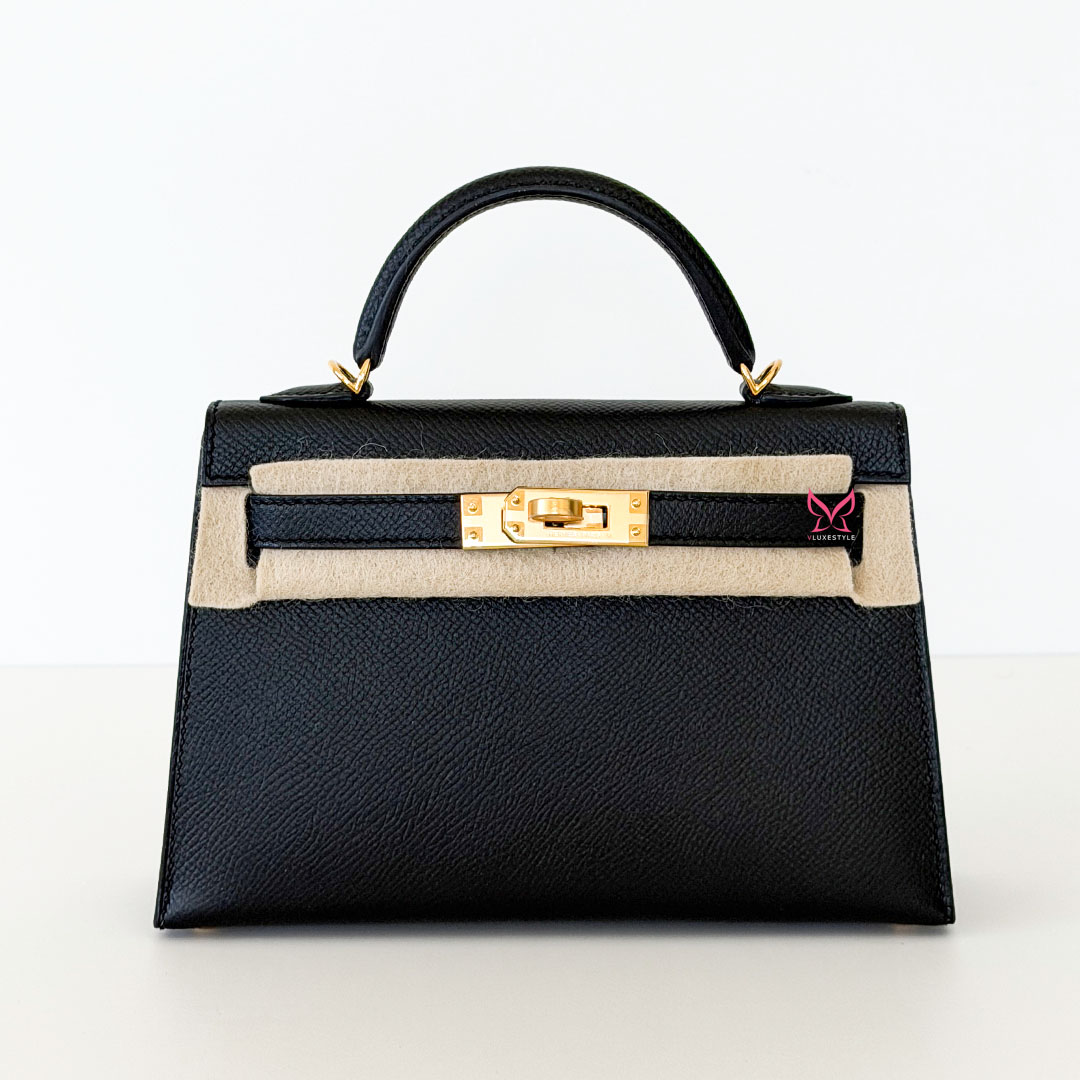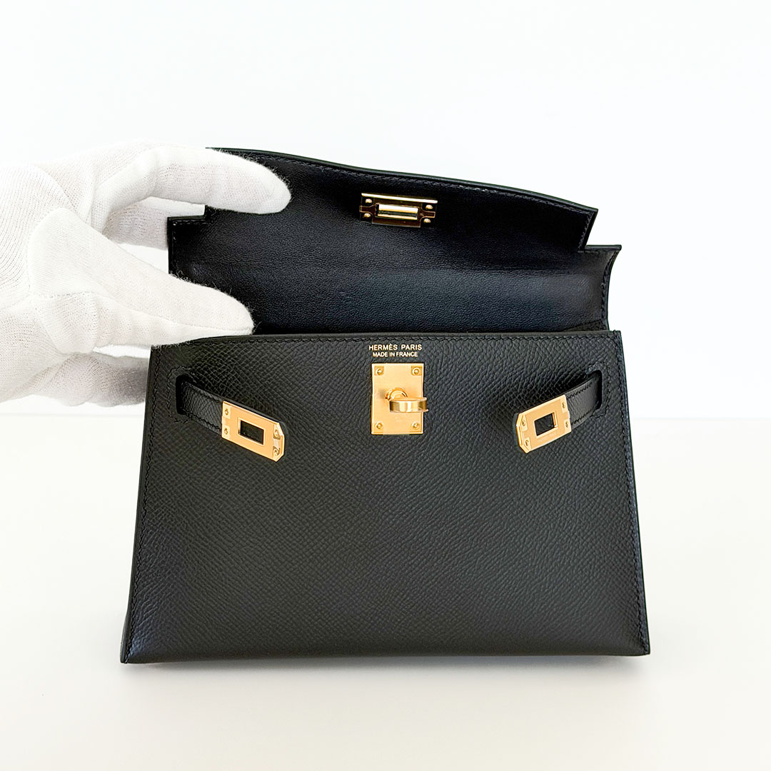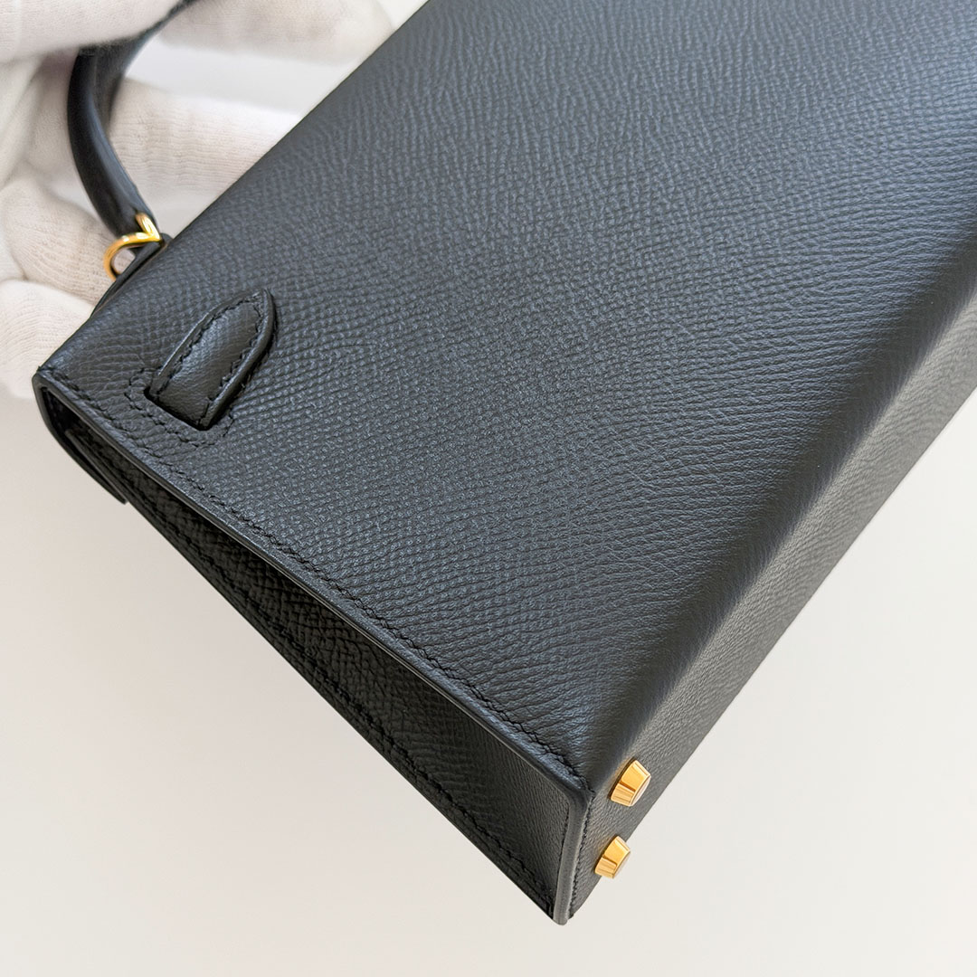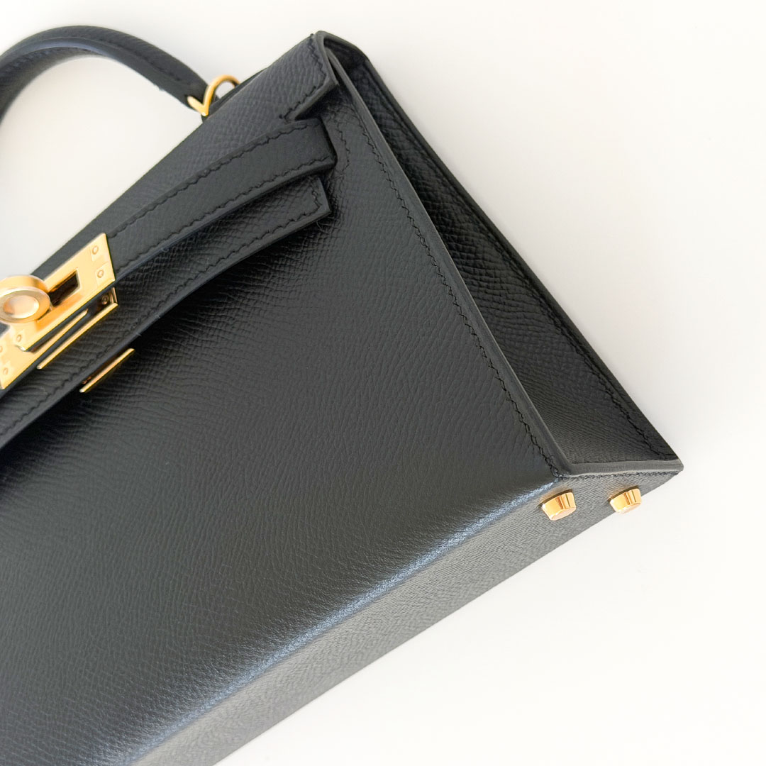 The Hermès Mini Kelly Sellier 20 in Black Epsom with Gold Hardware is the epitome of elegance and luxury. This iconic Hermès bag, crafted from black Epsom calfskin leather, is the perfect neutral that complements any outfit. The bag opens to reveal a beautifully matched leather interior with a flat pocket, offering just enough space for your essentials.