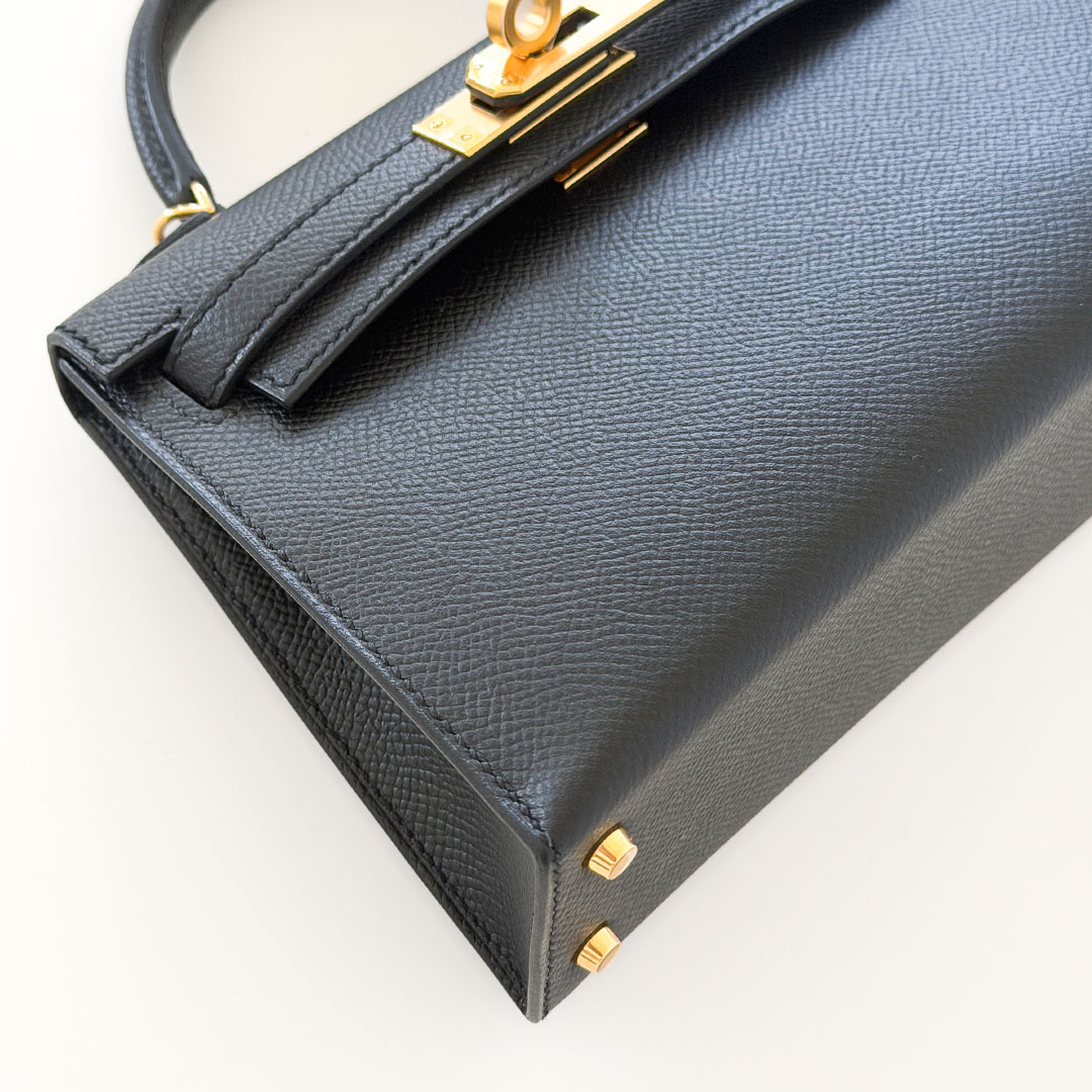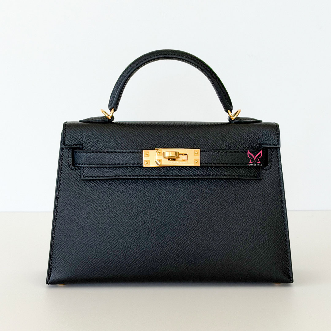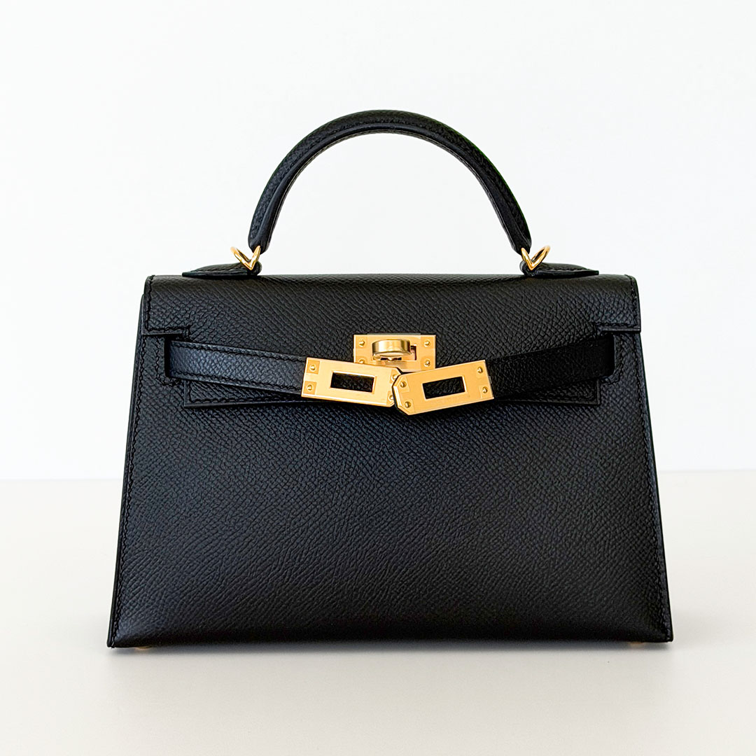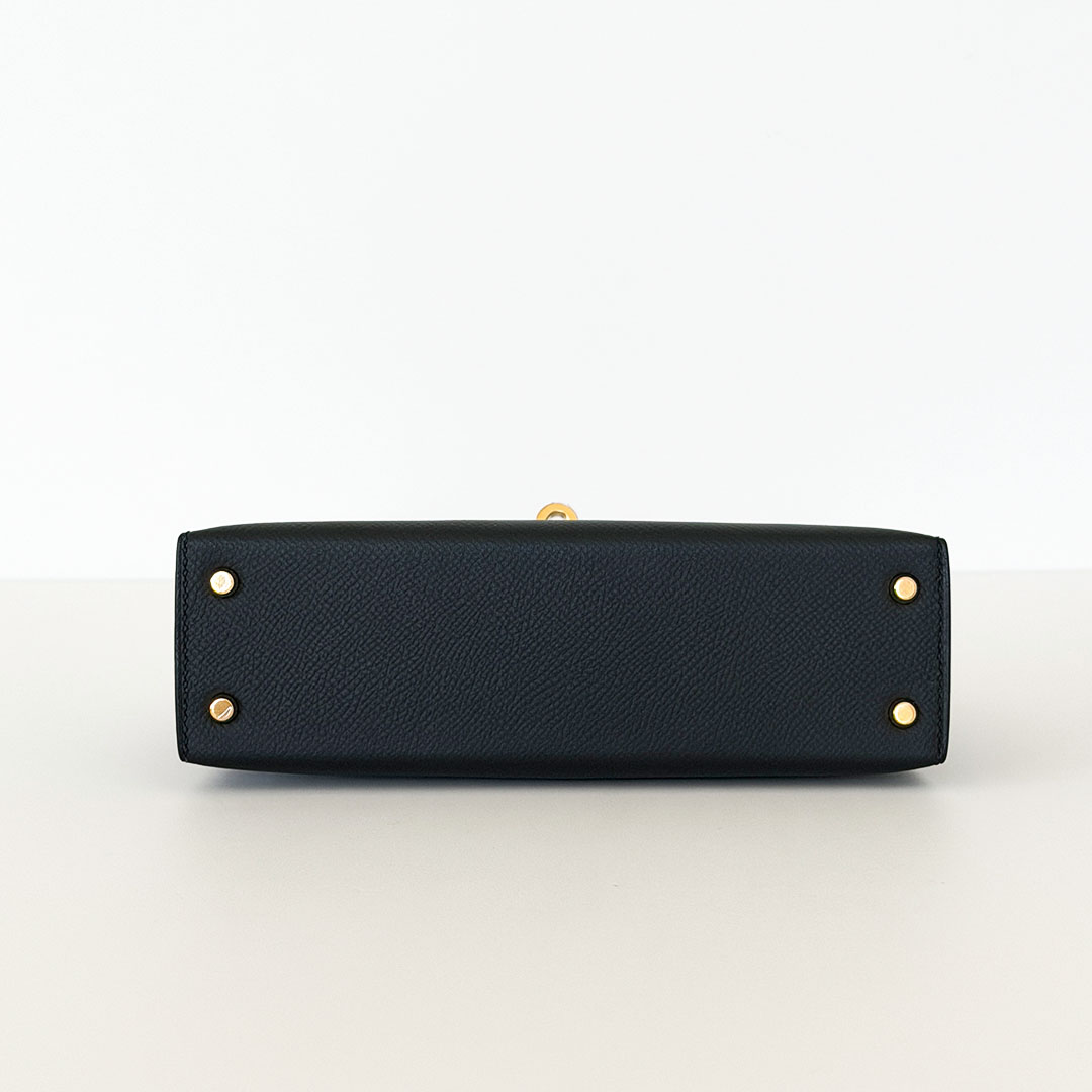 The Hermès Mini Kelly Sellier 20 in Black Epsom with Gold Hardware is the epitome of elegance and luxury. This iconic Hermès bag, crafted from black Epsom calfskin leather, is the perfect neutral that complements any outfit. The bag opens to reveal a beautifully matched leather interior with a flat pocket, offering just enough space for your essentials.