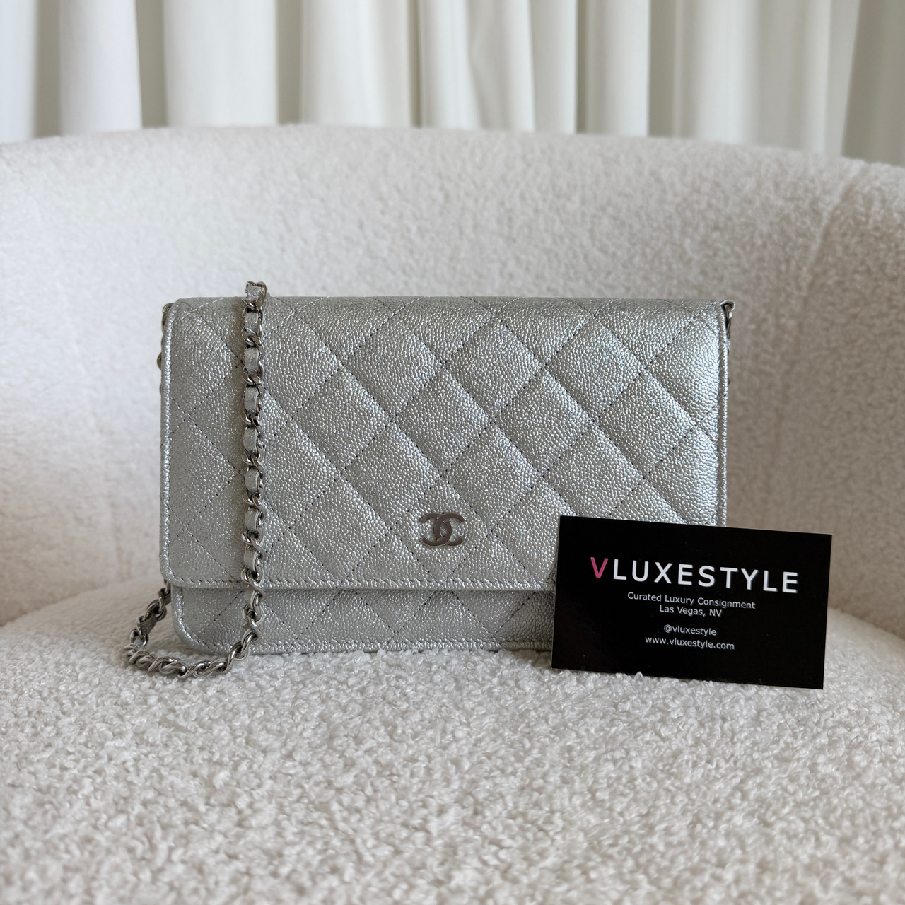 The exquisite Classic Wallet on Chain 21K Metallic Silver Quilted Caviar with silver hardware. This timeless wallet on chain is crafted of luxurious and durable caviar leather in stunning metallic silver. The bag can be worn long and short over the shoulder, cross-body, or as a clutch. This is the most classic and timeless piece of Chanel; you can carry it in both formal and casual affairs; it’s the perfect bag for every occasion.