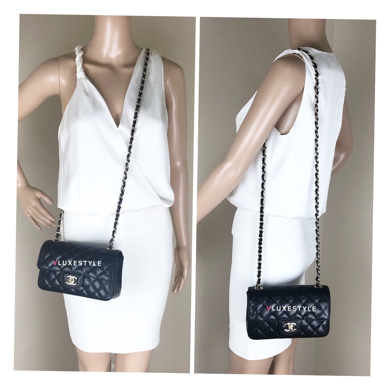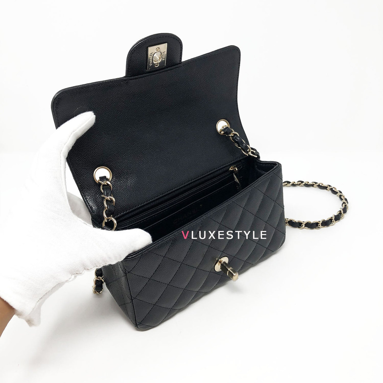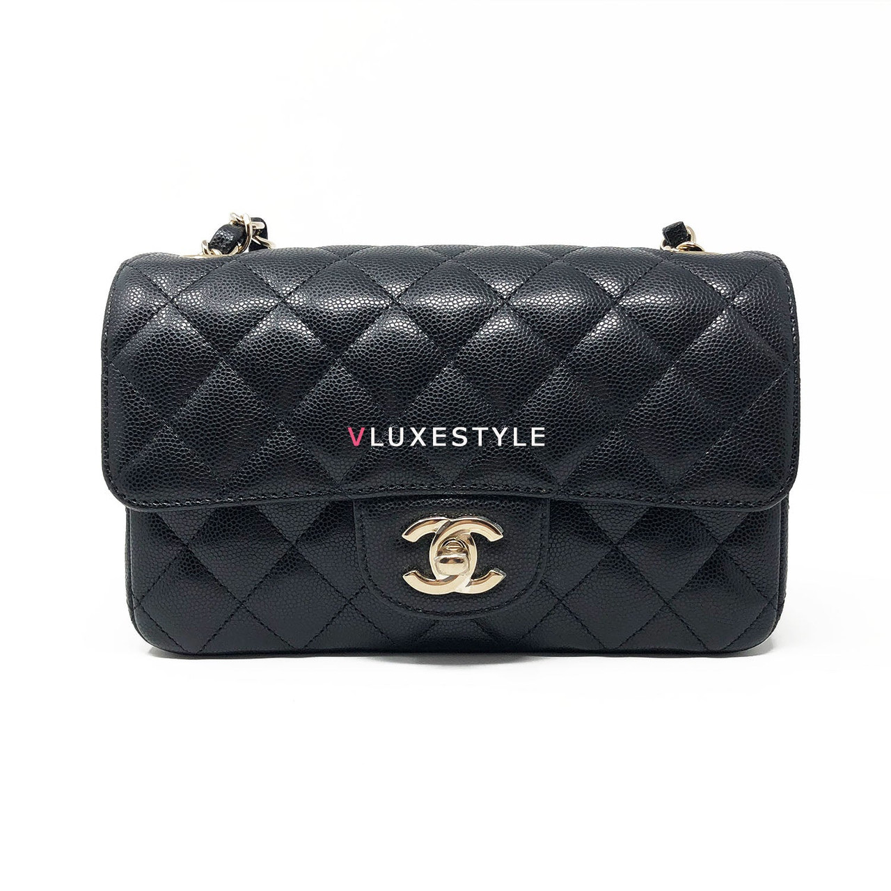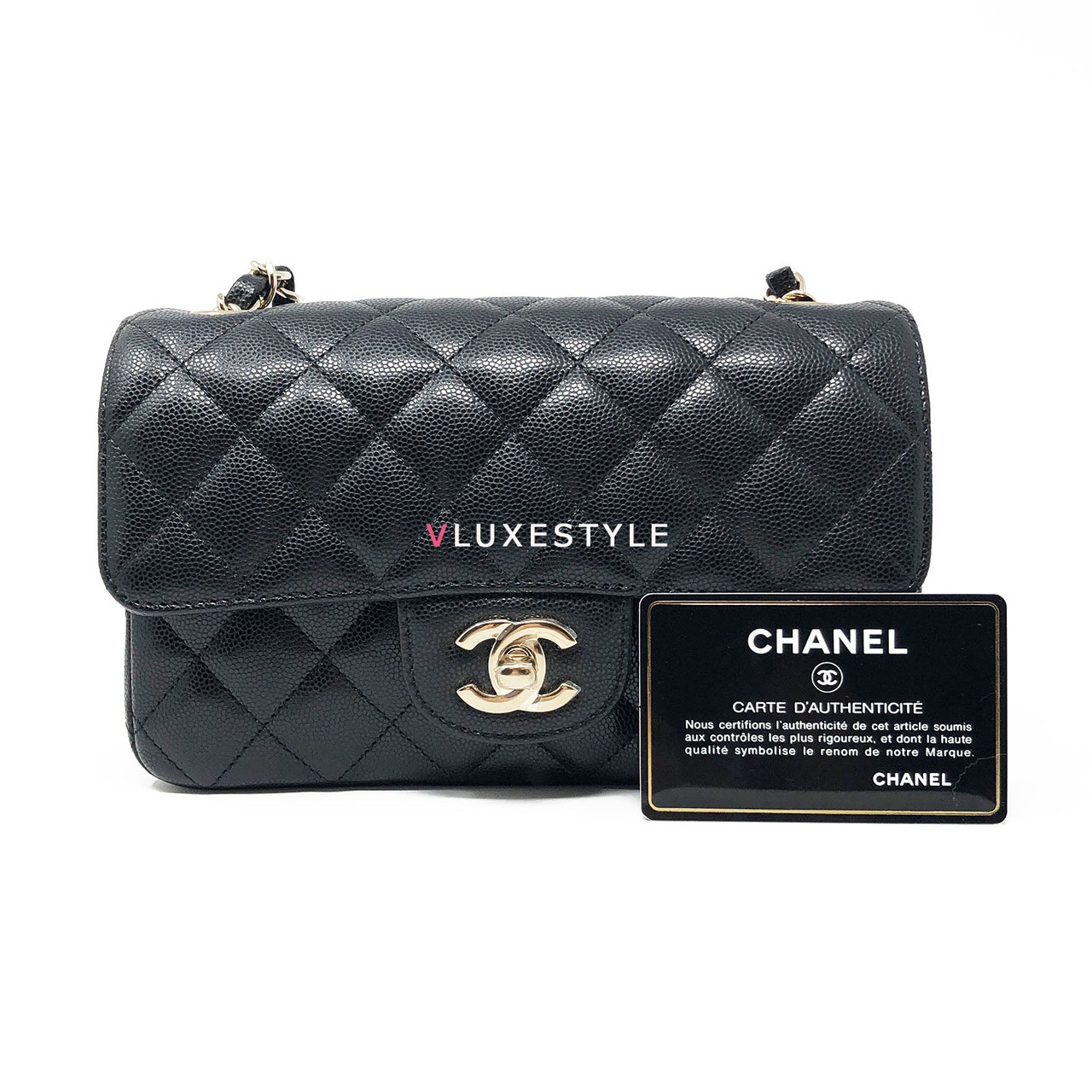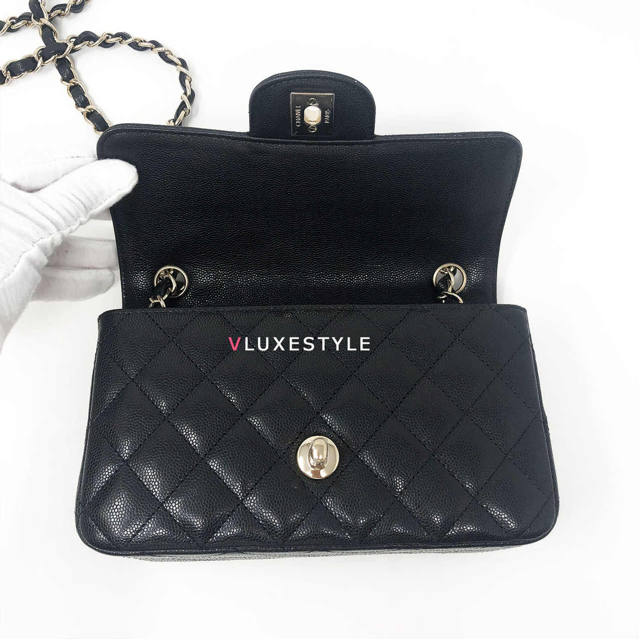 Very rare to find these days! Authentic Chanel Like New 17C Mini Rectangular Black Quilted Caviar with EDGE STITCHING. This stunning shoulder bag is crafted of luxurious and durable quilted caviar leather in black. This mini bag can be worn as a cross-body or over-the-shoulder bag. Last 2018 Chanel discontinued making minis in caviar until further notice.