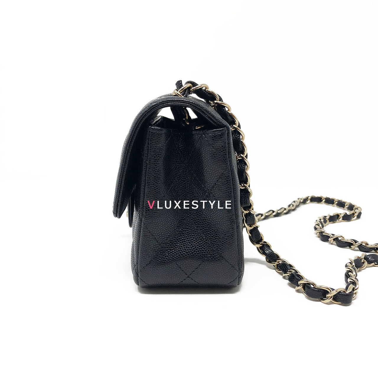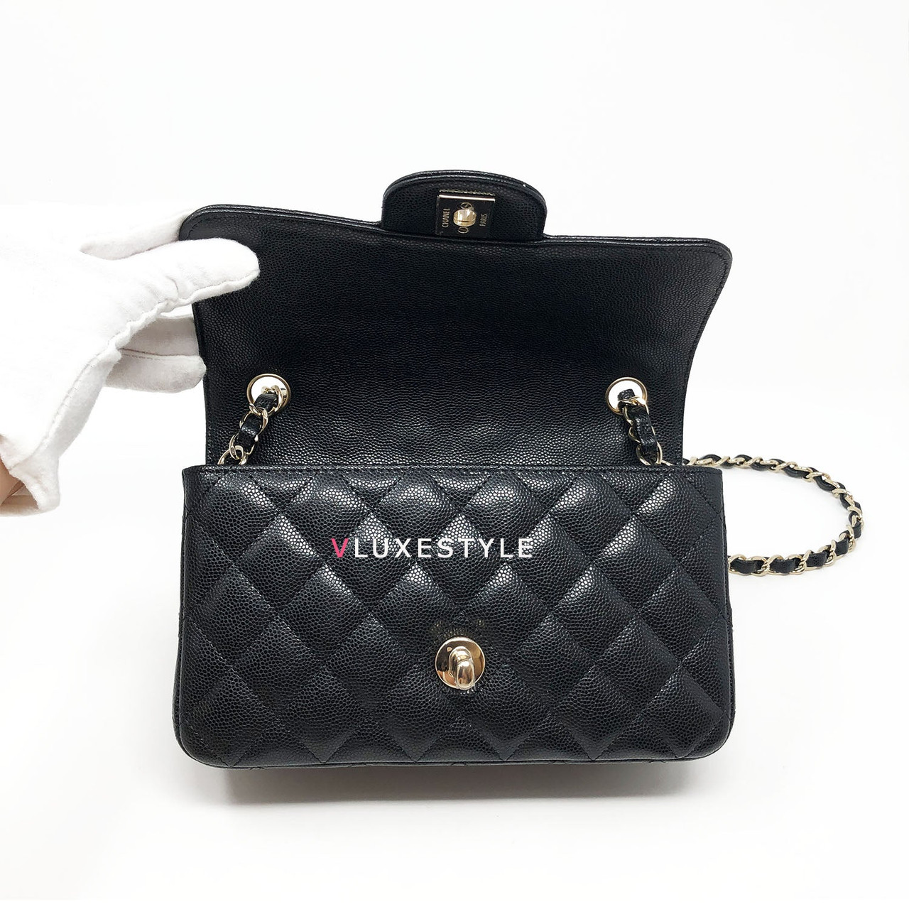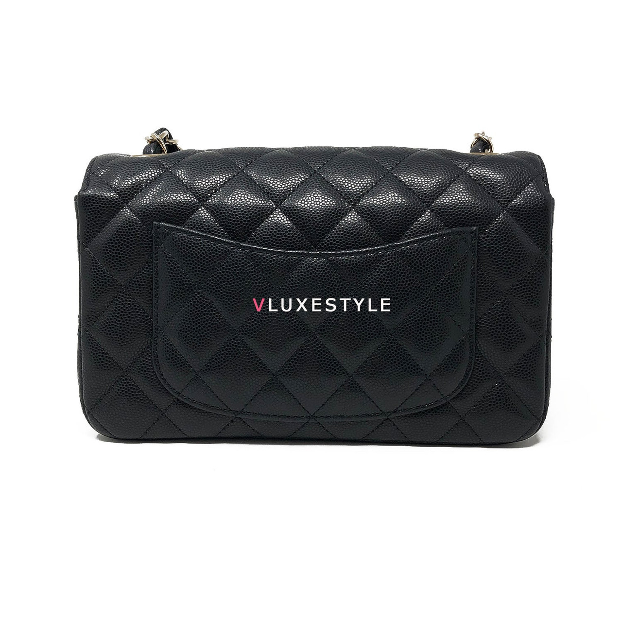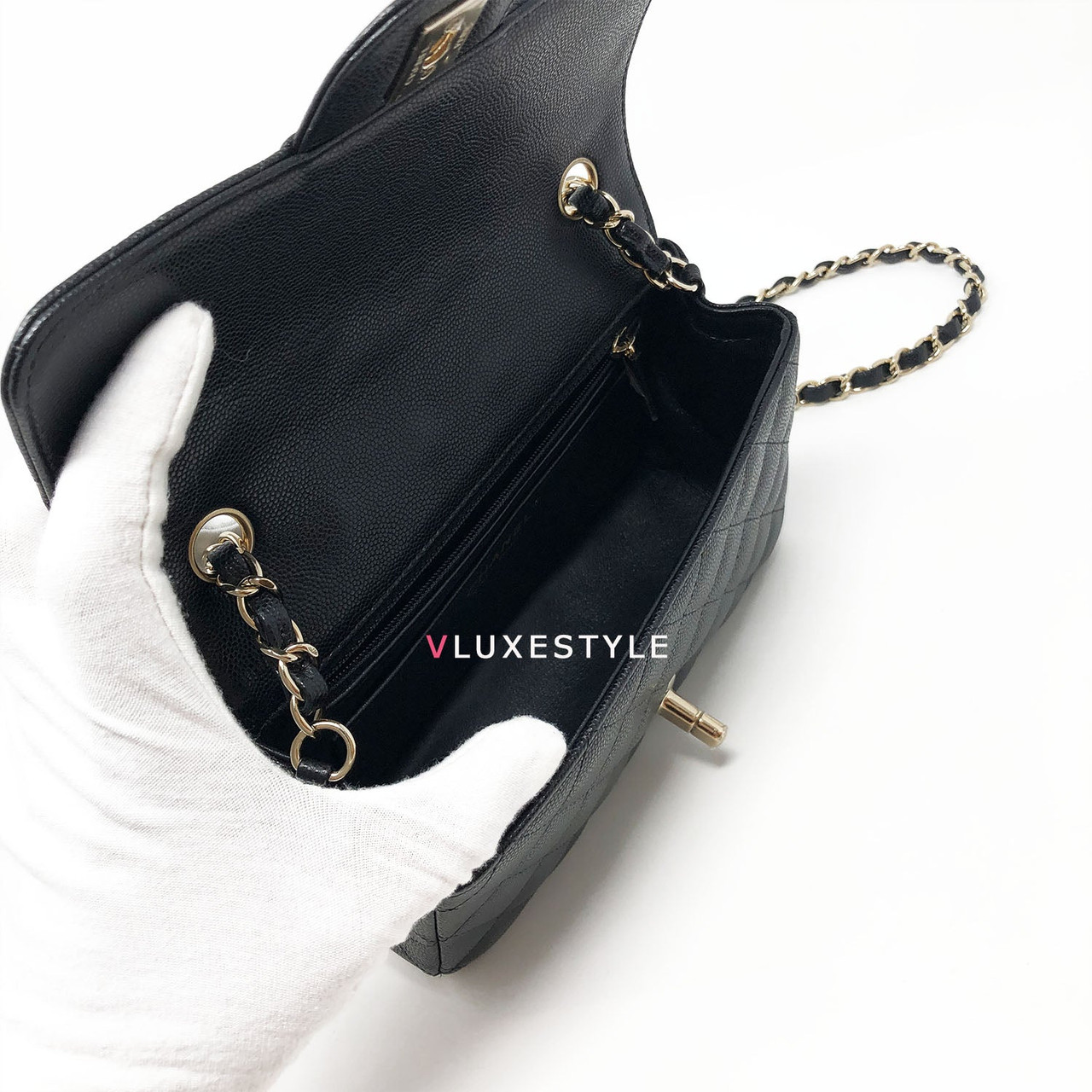 Very rare to find these days! Authentic Chanel Like New 17C Mini Rectangular Black Quilted Caviar with EDGE STITCHING. This stunning shoulder bag is crafted of luxurious and durable quilted caviar leather in black. This mini bag can be worn as a cross-body or over-the-shoulder bag. Last 2018 Chanel discontinued making minis in caviar until further notice.