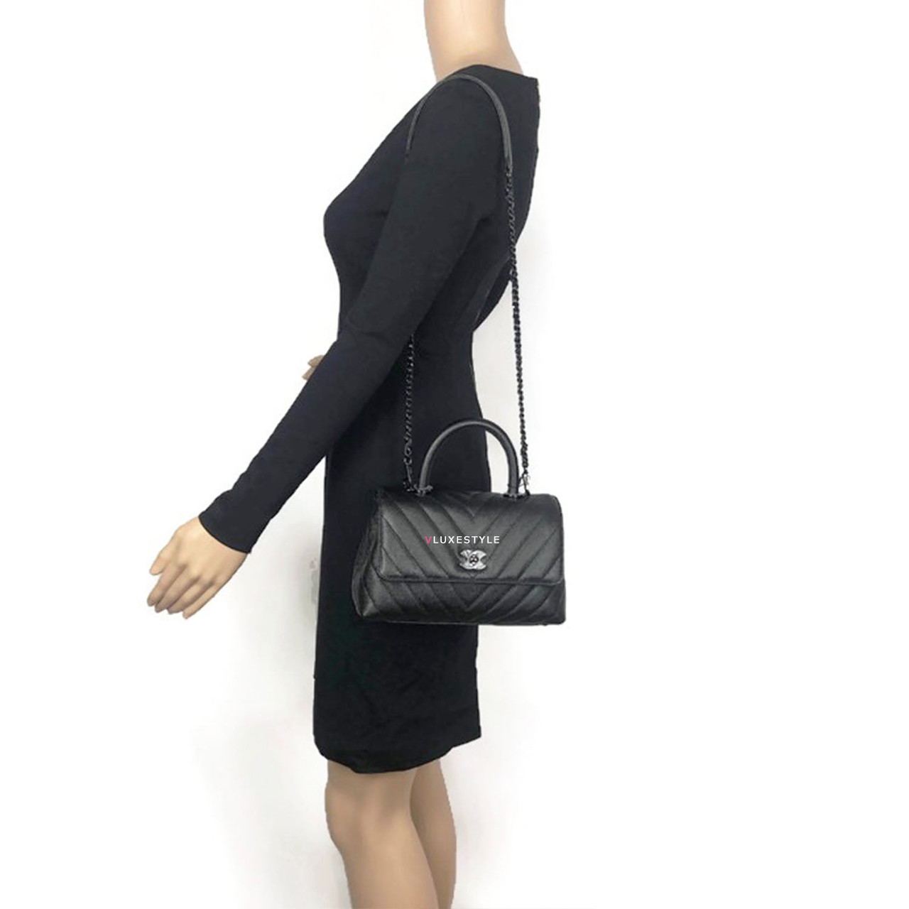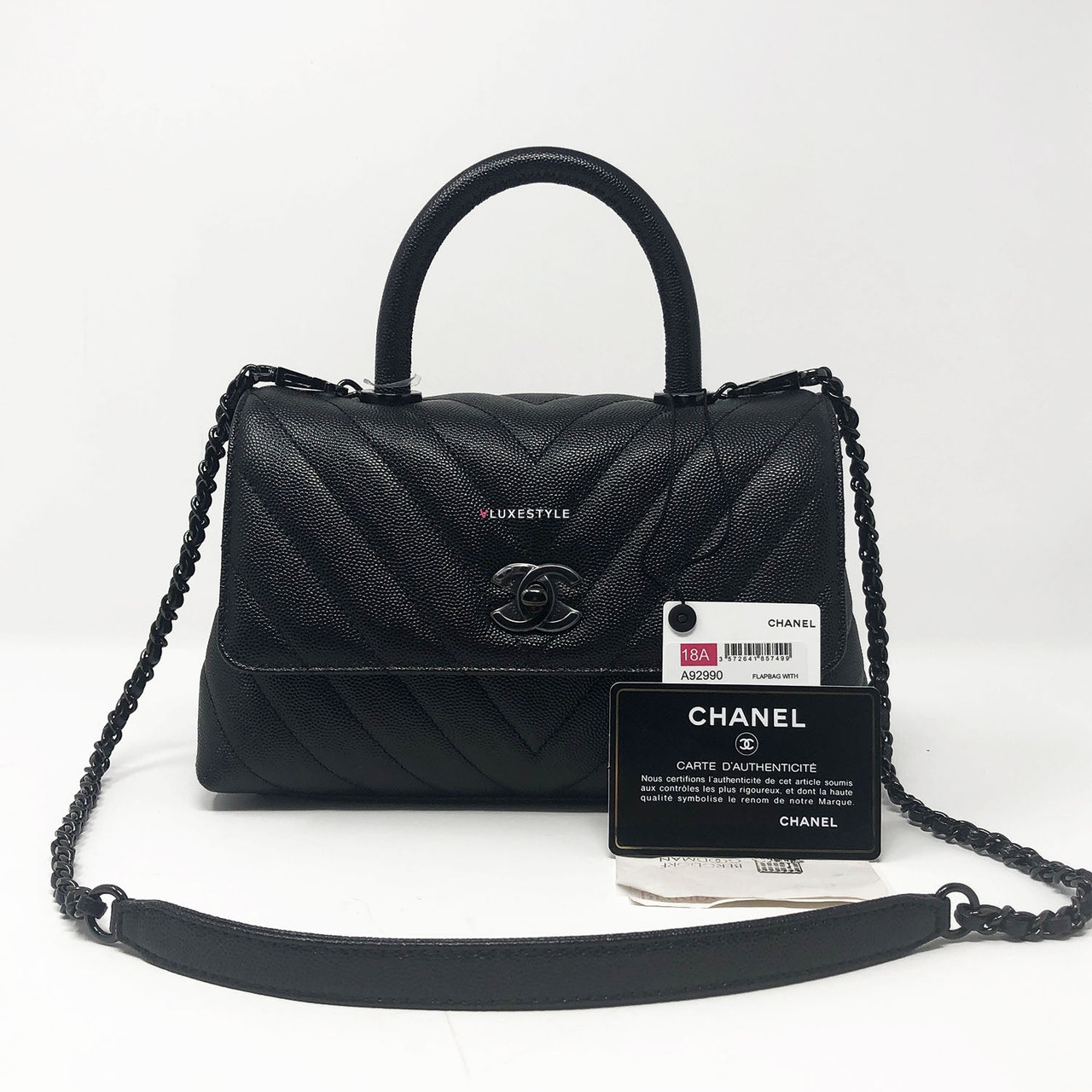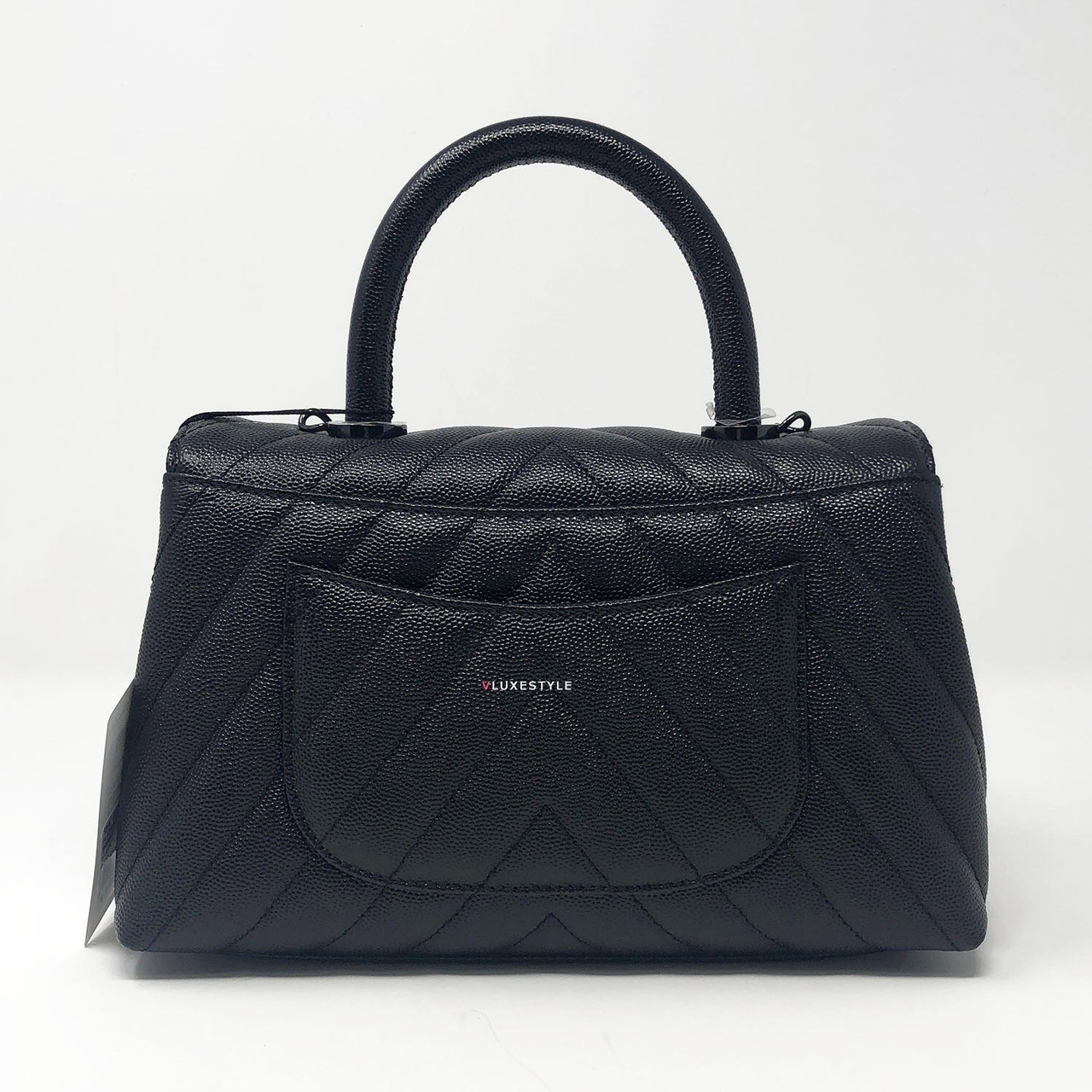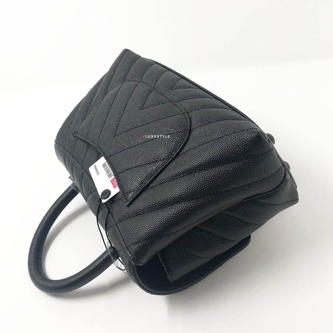 The highly sought after and very hard to find! Sold out when it was released. Brand new Chanel So Black Mini Coco Handle Chevron Caviar with shiny black hardware, from 2018 Pre-fall collection. This shoulder bag features a black leather top handle, shiny black hardware, and removable straps