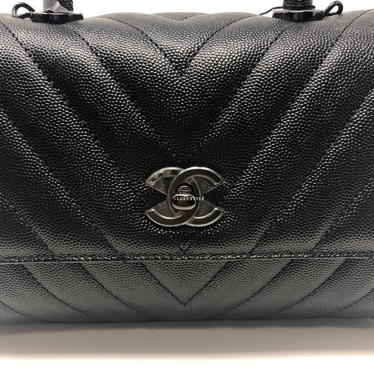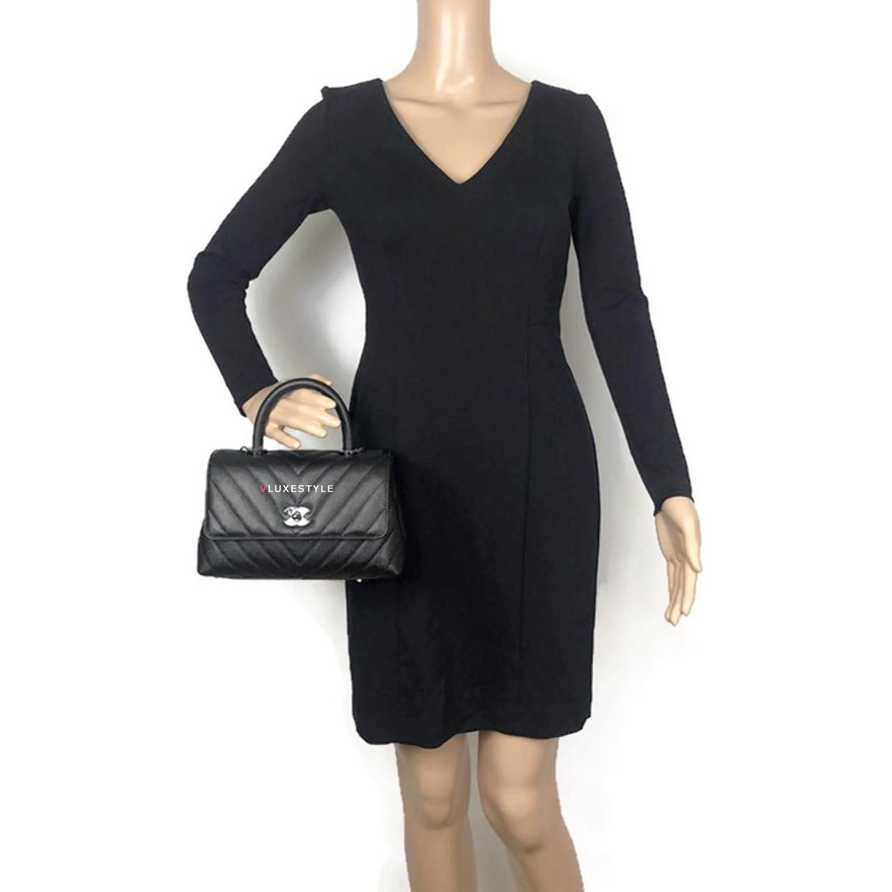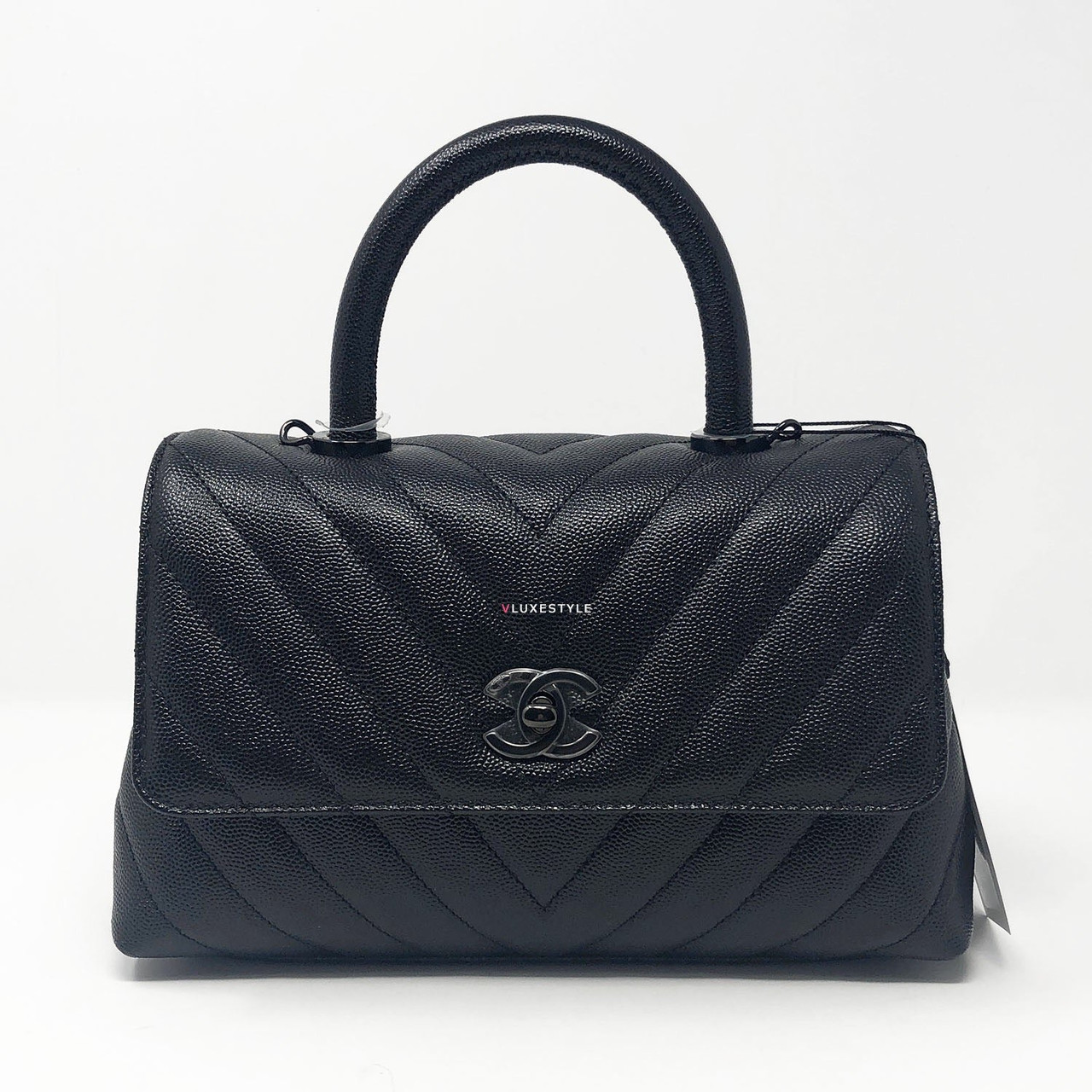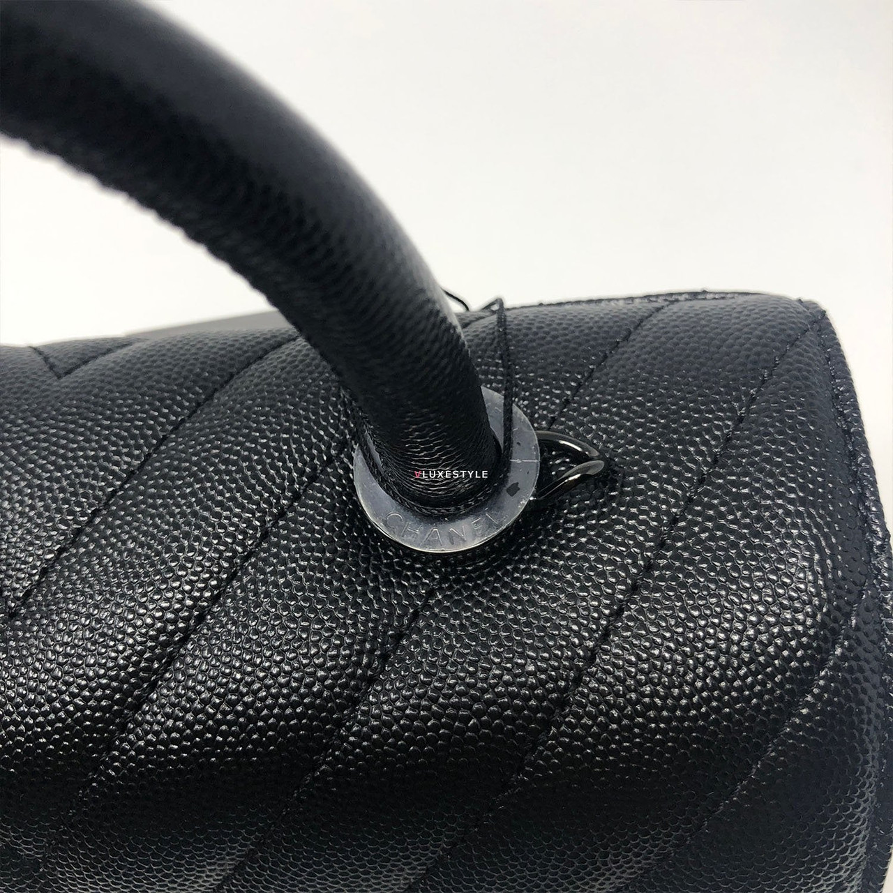 The highly sought after and very hard to find! Sold out when it was released. Brand new Chanel So Black Mini Coco Handle Chevron Caviar with shiny black hardware, from 2018 Pre-fall collection. This shoulder bag features a black leather top handle, shiny black hardware, and removable straps