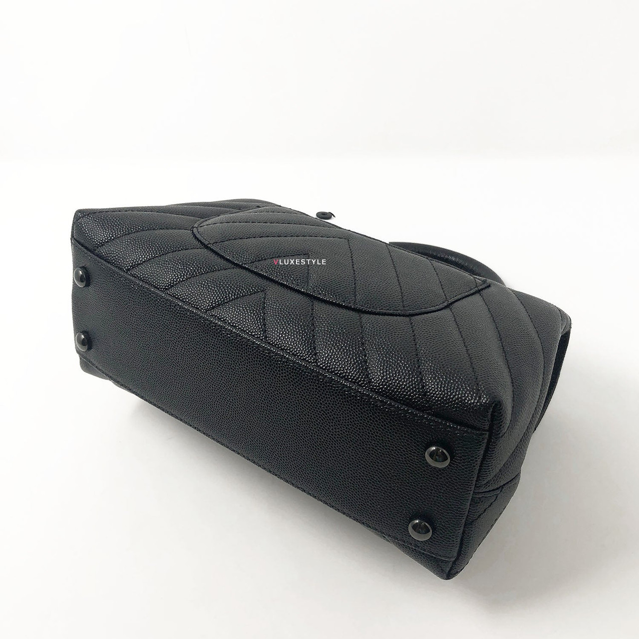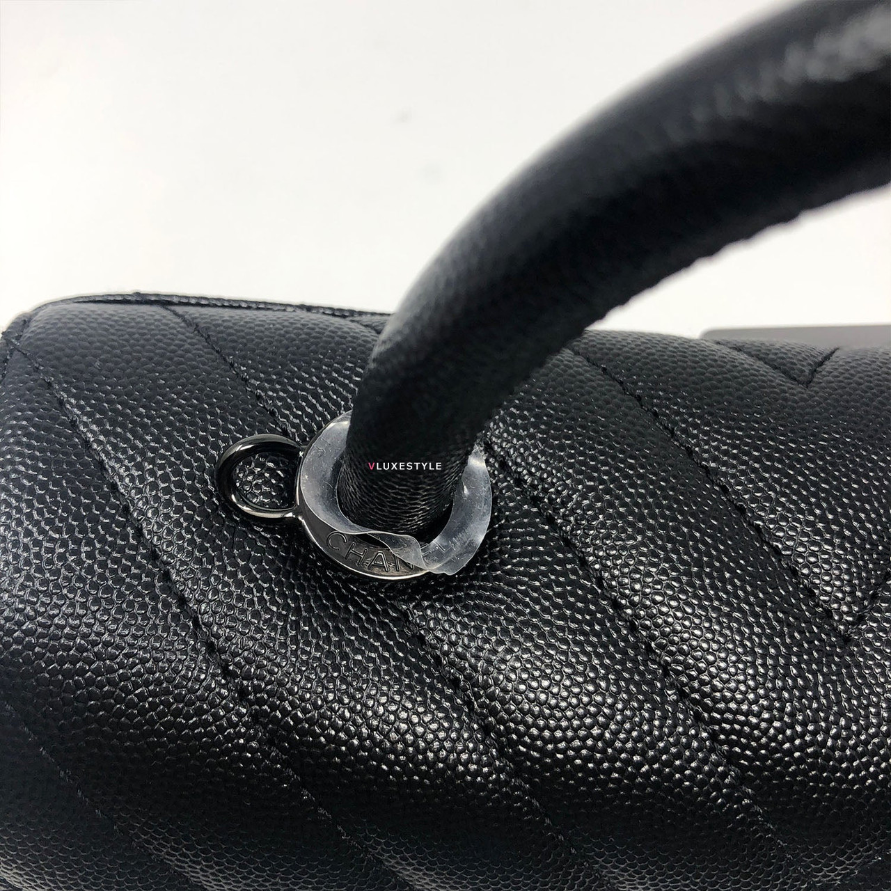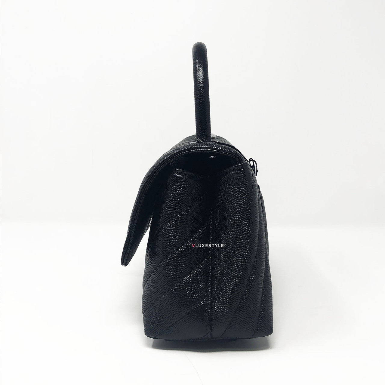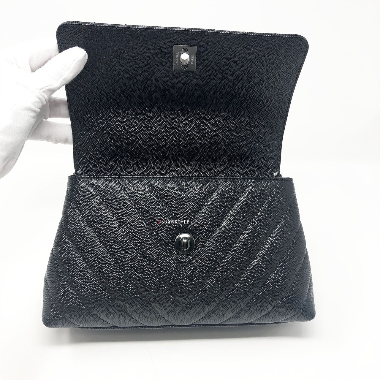 The highly sought after and very hard to find! Sold out when it was released. Brand new Chanel So Black Mini Coco Handle Chevron Caviar with shiny black hardware, from 2018 Pre-fall collection. This shoulder bag features a black leather top handle, shiny black hardware, and removable straps