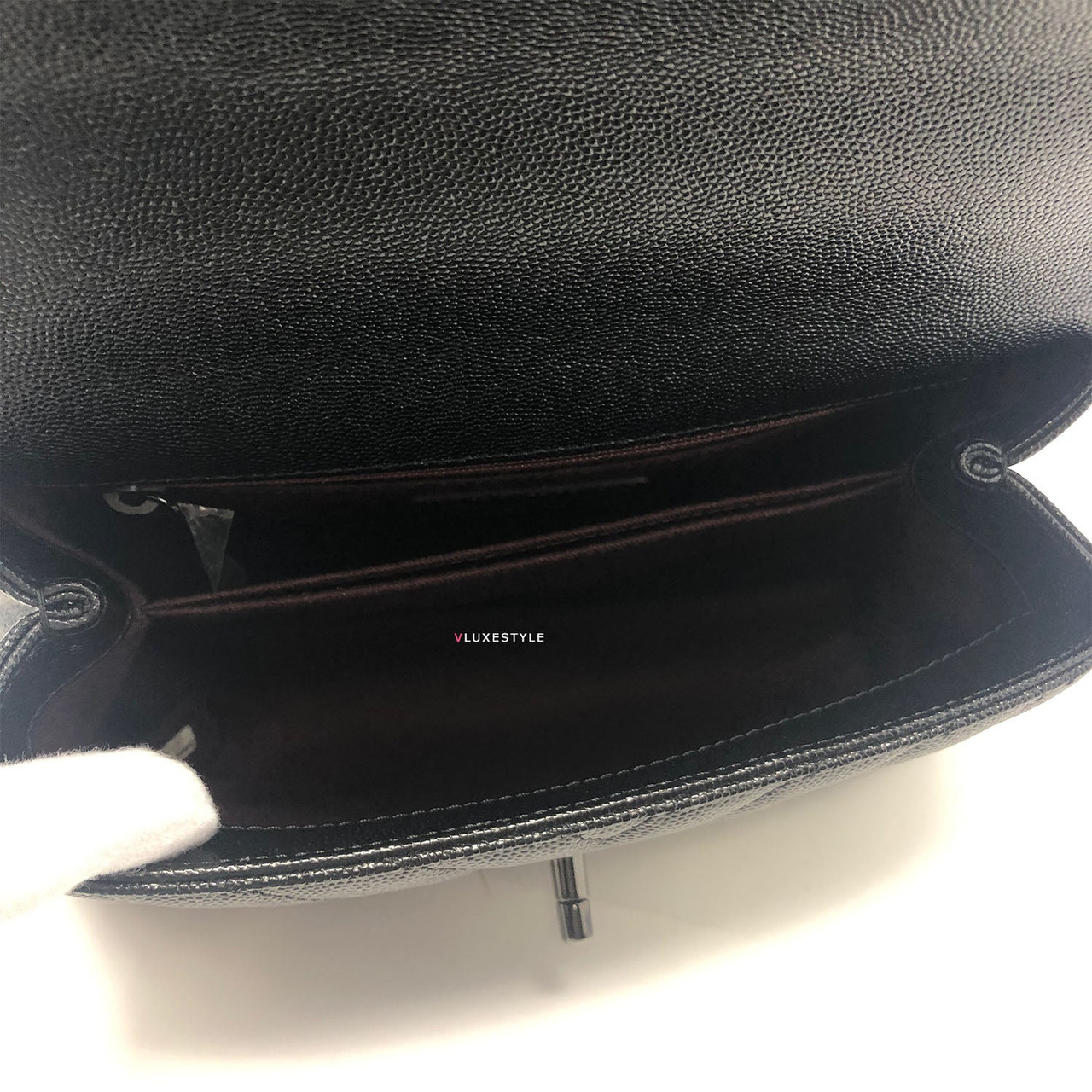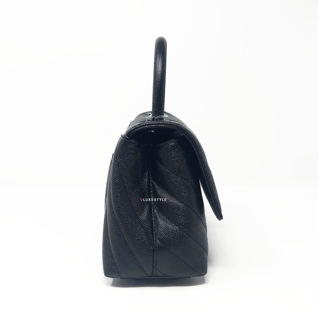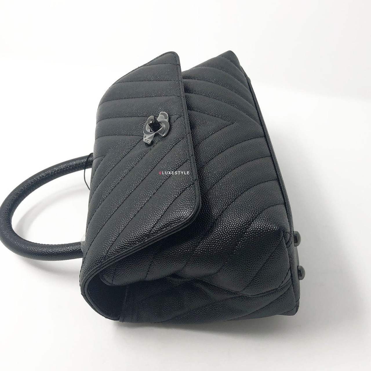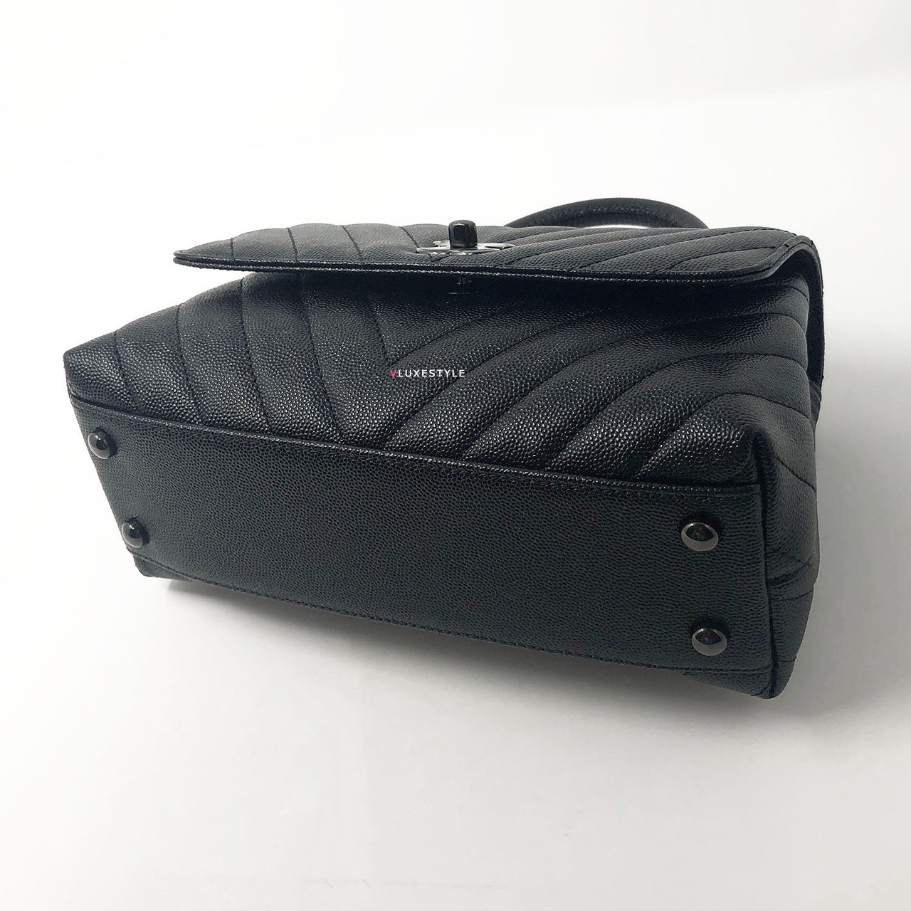 The highly sought after and very hard to find! Sold out when it was released. Brand new Chanel So Black Mini Coco Handle Chevron Caviar with shiny black hardware, from 2018 Pre-fall collection. This shoulder bag features a black leather top handle, shiny black hardware, and removable straps